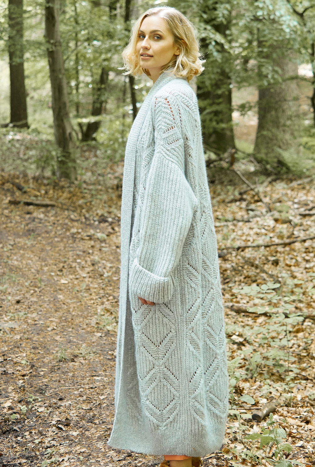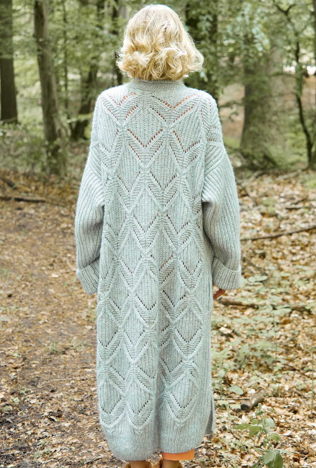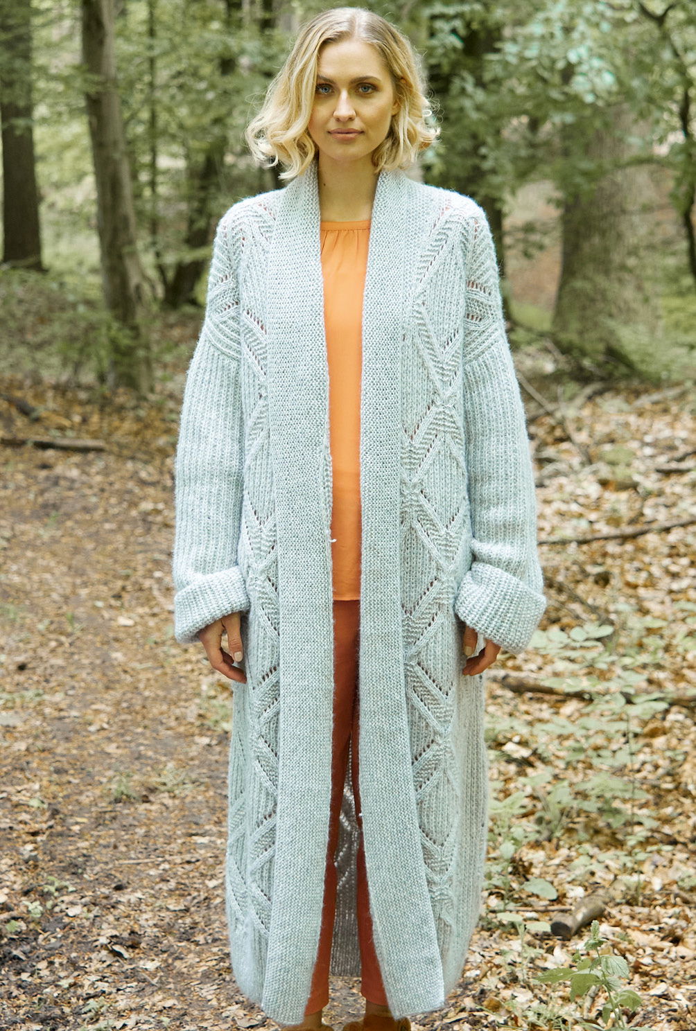 So ein Prachtexemplar sollte jetzt in keiner Wintergarderobe fehlen – der fast knöchellange Mantel macht eine gute Figur. Er wird Sie lange begleiten und immer wieder mit seinen ausdrucksstarken Rautenmotiven begeistern. Er ist ganz in Hellgrau, hat im halbpatent gestrickte Ärmel und ein ausdrucksvolles breites Rautenmuster an Rückenteil und den Vorderteilen, welches nach Anleitung super easy nachzuarbeiten ist.Glatt rechts gestrickt ist der breite Schalkragen an den Vorderteilen und Halsausschnitt. Eine Anleitung gibt es für die Größen 36/38 (40/42) 44/46.