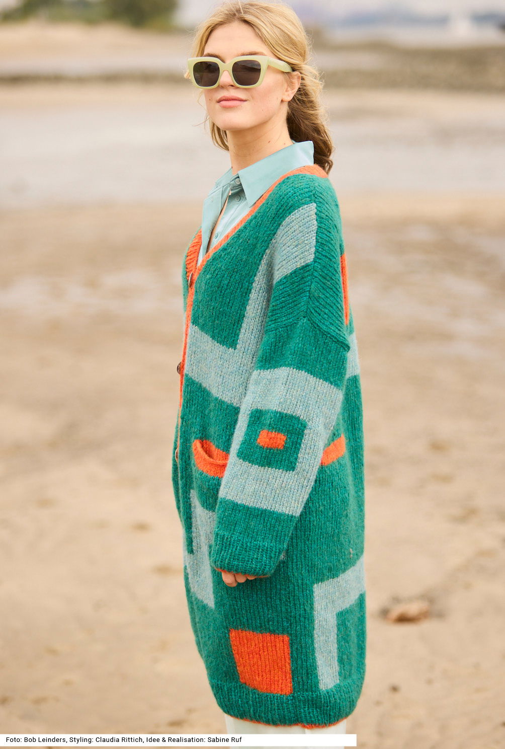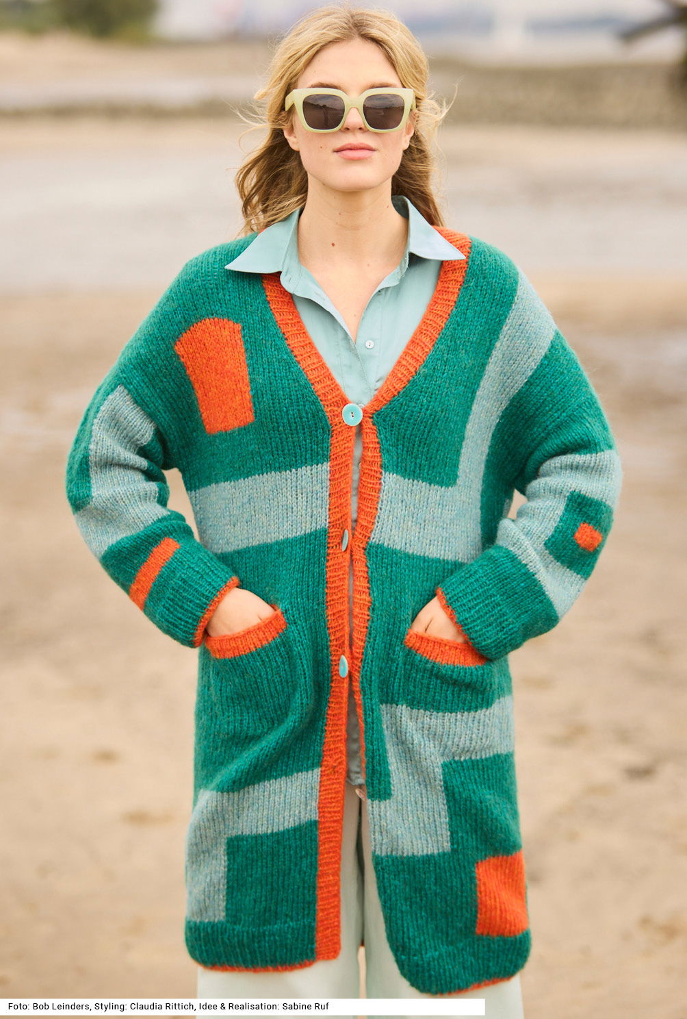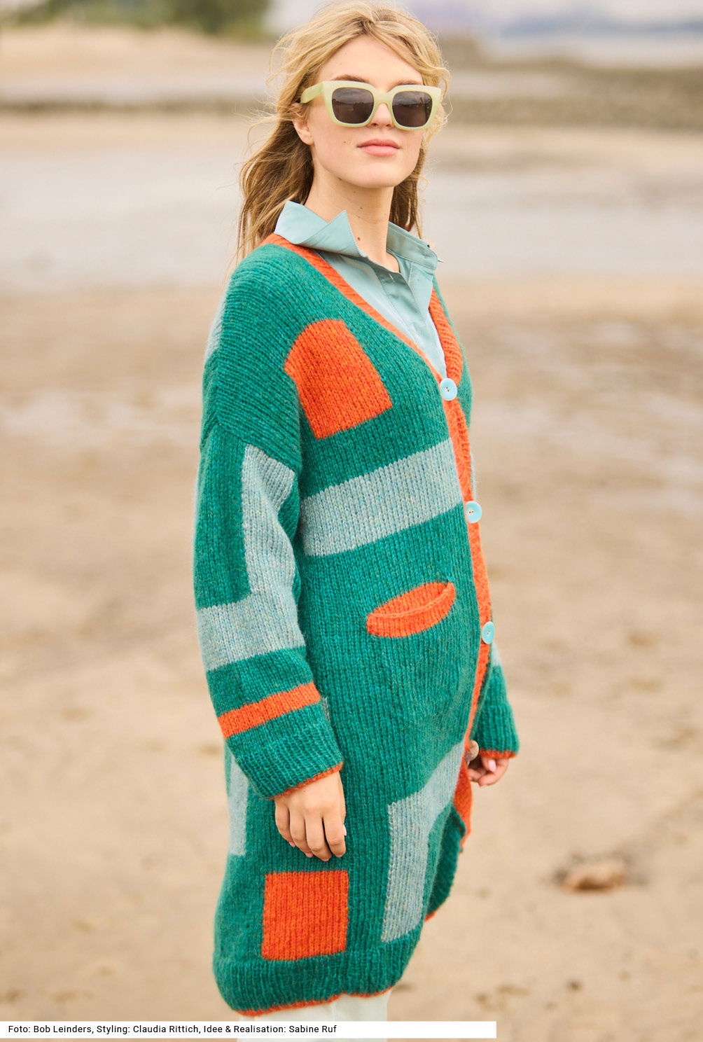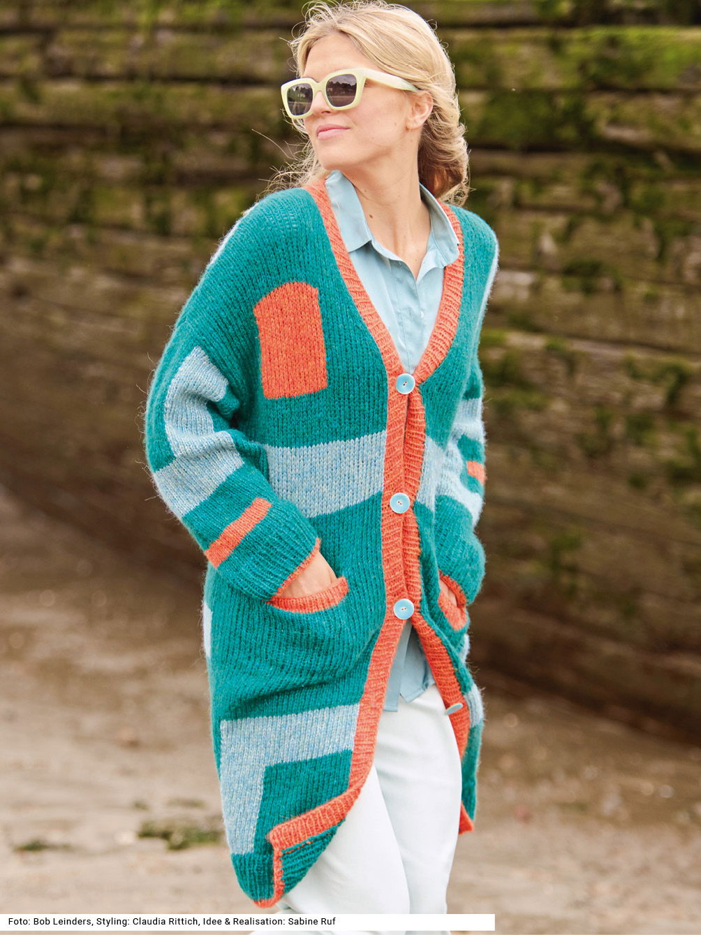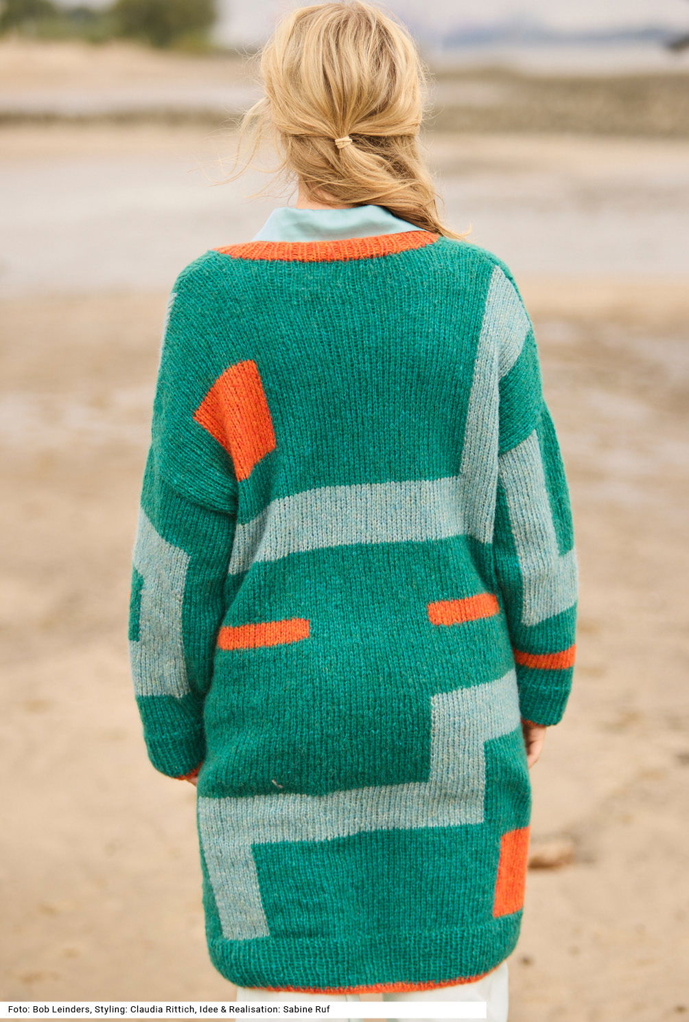 Versierte StrickerInnen werden sich über diesen großartigen Mantel freuen; denn er lässt sie lange Freude beim Sticken haben. Er erinnert mit seinen geometrischen Farbflächen in Intarsientechnik an moderne Gemälde. Etwas Besonderes ist auch das verstrickte Garn mit einer flauschigen Netzstruktur aus Baumwolle, gefüllt mit Merino- und Babyalpaka-Fasern, das macht den Mantel zu einem rundum wärmenden Leichtgewicht. Vorder- und Rückenteil haben angeschnittene Ärmel, die eigentlichen Ärmel werden jedoch extra gestrickt. Bündchen und Vorderteilblenden werden im Rippenmuster gearbeitet. Die Anleitung dazu ist für die Größen 36/38, 40/42 und 44/46.