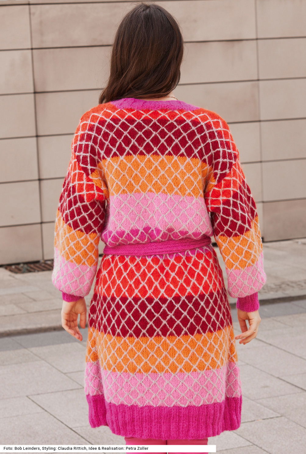 Dieser verschlusslose Mantel aus reinem Alpakagarn, der mit einem Gürtel auch figurbetont getragen kann, lebt von seinem opulenten Farbmix, der durch das dynamische Gittermuster noch unterstrichen wird. Gearbeitet wird immer nur mit einer Farbe, das grègefarbene Gitter entsteht durch das Mitführen des Fadens vor den gestrickten Maschen; die breiten Streifen in Rosa, Goldgelb, Rot, Orange und Pink bilden den Untergrund. Der hohe Bund am Saum und an den Ärmeln sowie die Vorderteilblende sind im 2/2-Rippenmuster in Pink gestrickt. Der Gürtel bekommt seine Festigkeit dadurch, dass er mit doppeltem Faden gearbeitet wird. Die Anleitung dazu gibt es für die Größen 38/40, 44/46 und 50/52.