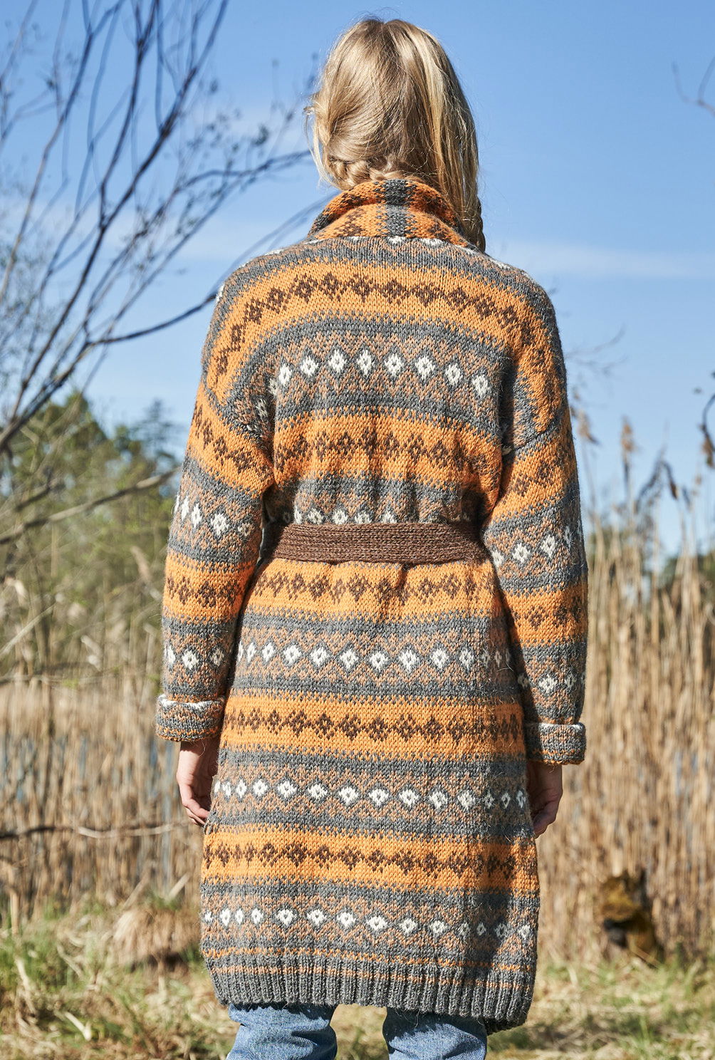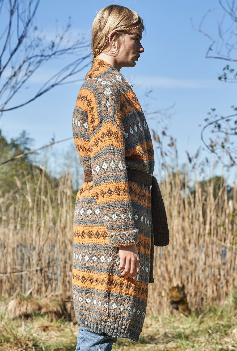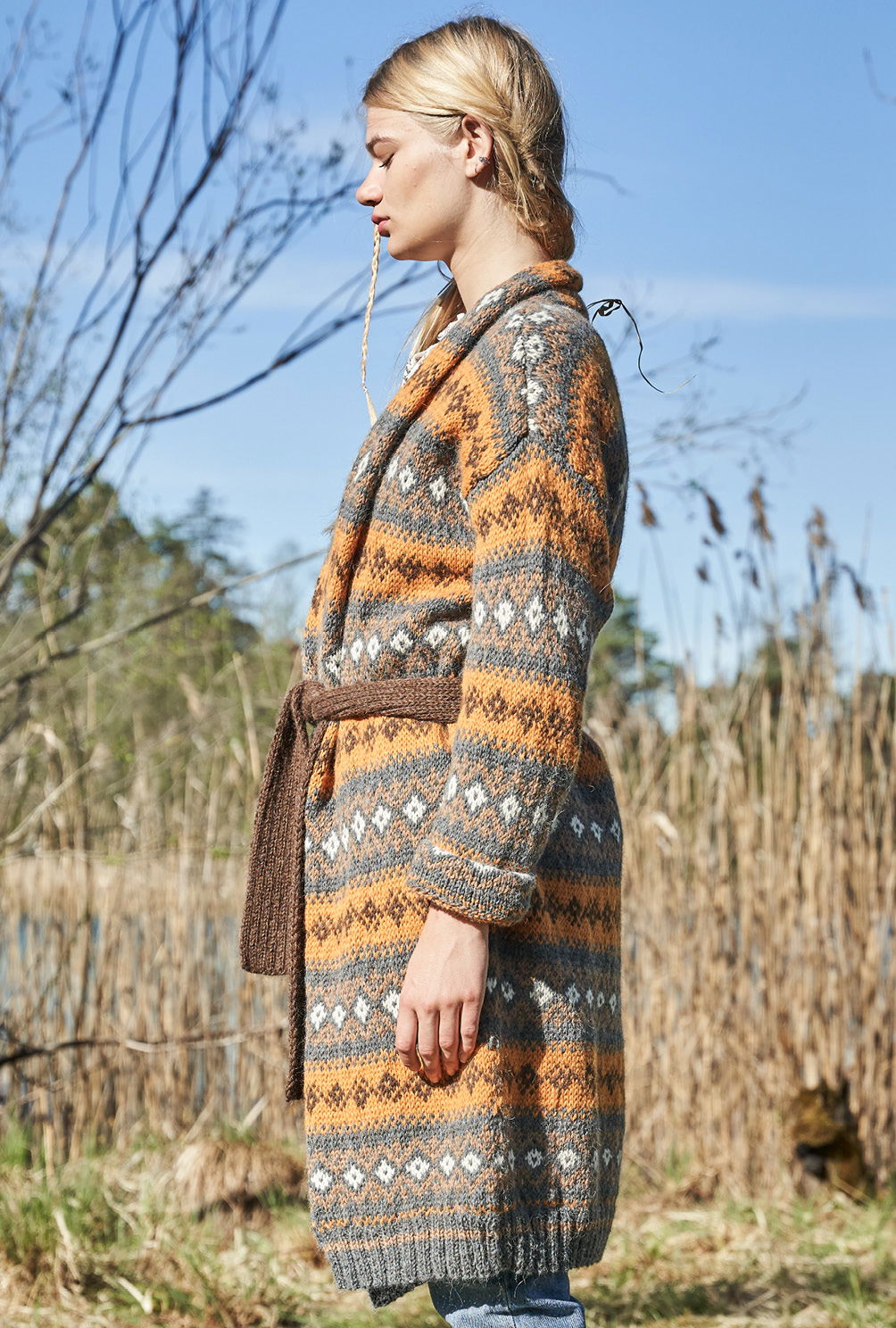 Wenn alle Teile fertig gestrickt sind, werden zuerst die Schulternähte geschlossen und die stillgelegten Maschen der Vorderteile im Maschenstich verbunden, dann den Kragen in den rückwärtigen Halsausschnitt nähen, die Verschluss- und Kragenränder nach innen umnähen und die restlichen Nähte schließen. Am besten nimmt die Jacke dann ein kleines Bad, dabei legen sich die Mustermaschen auch noch einmal schön gleichmäßig und das Garn entfaltet seine ganze, flauschige Schönheit.