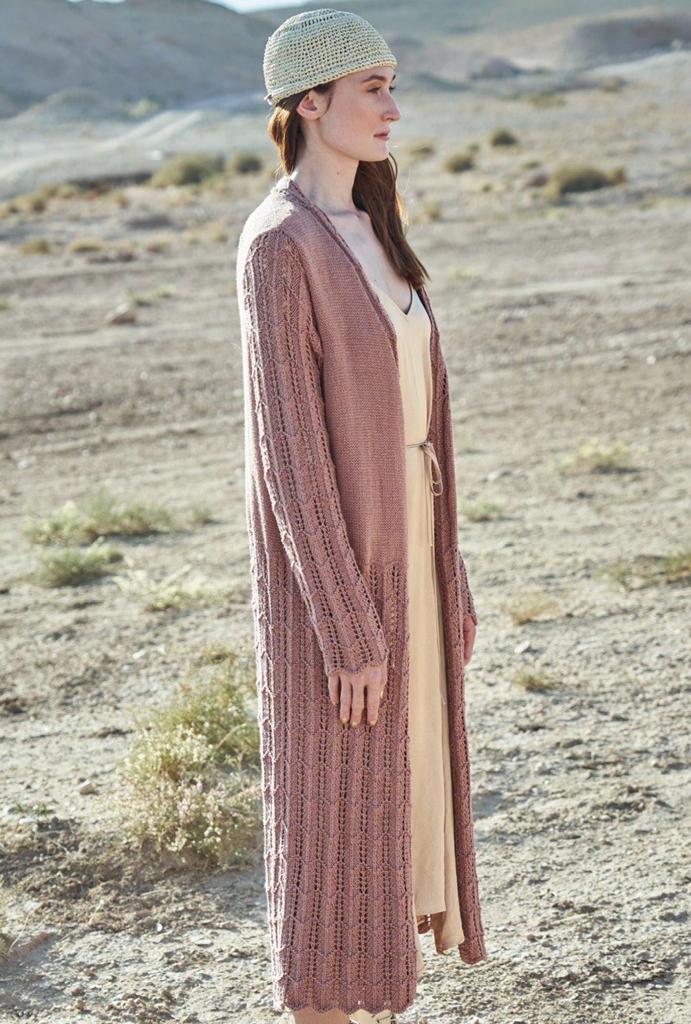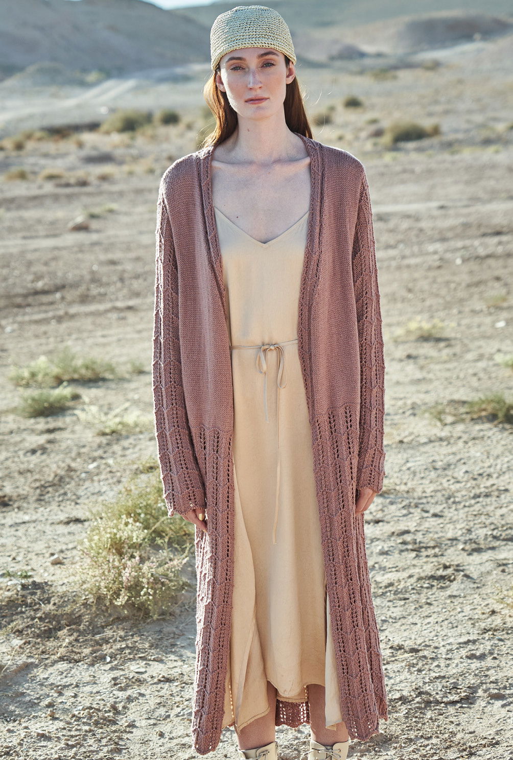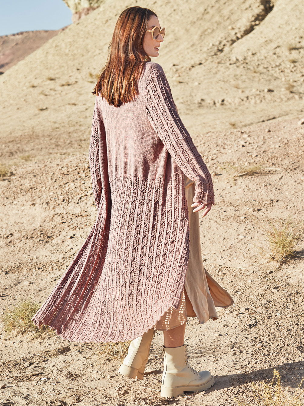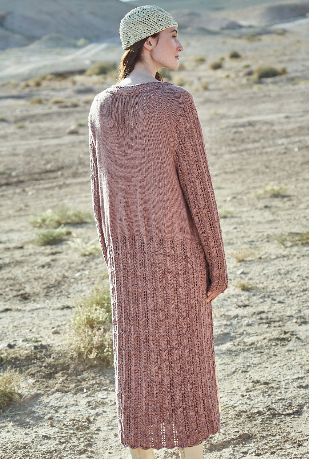 Bequem, chic, wandelbar – Mäntel verfügen über Attribute, die wir im Frühjahr schätzen. Hier fast knöchellang, mit Ajourstrukturen und – sozusagen zum Ausruhen – viel glatt rechts für den oberen Bereich. Für die besonders schön fließende Leichtigkeit sorgt das Garn aus weicher Baumwolle und feinem Modal. Gestrickt wird er lange Mantel in Einzelteilen von unten nach oben. Der untere Bereich wirkt durch das kleine, unkomplizierte Ajourmuster wunderbar leicht und schwingend. Der im Anschluss daran glatt rechts gestrickte obere Part bietet einen schönen Kontrast dazu – zumal bei den Vorderteilen das Ajourmuster für die Blende mit fortgeführt wird. Die Ärmel werden dann komplett im Lochmuster gestrickt und lassen dezent und verführerisch die Haut durchschimmern. Zum Schluss nur noch die Ärmel einsetzen und die Nähte schließen.