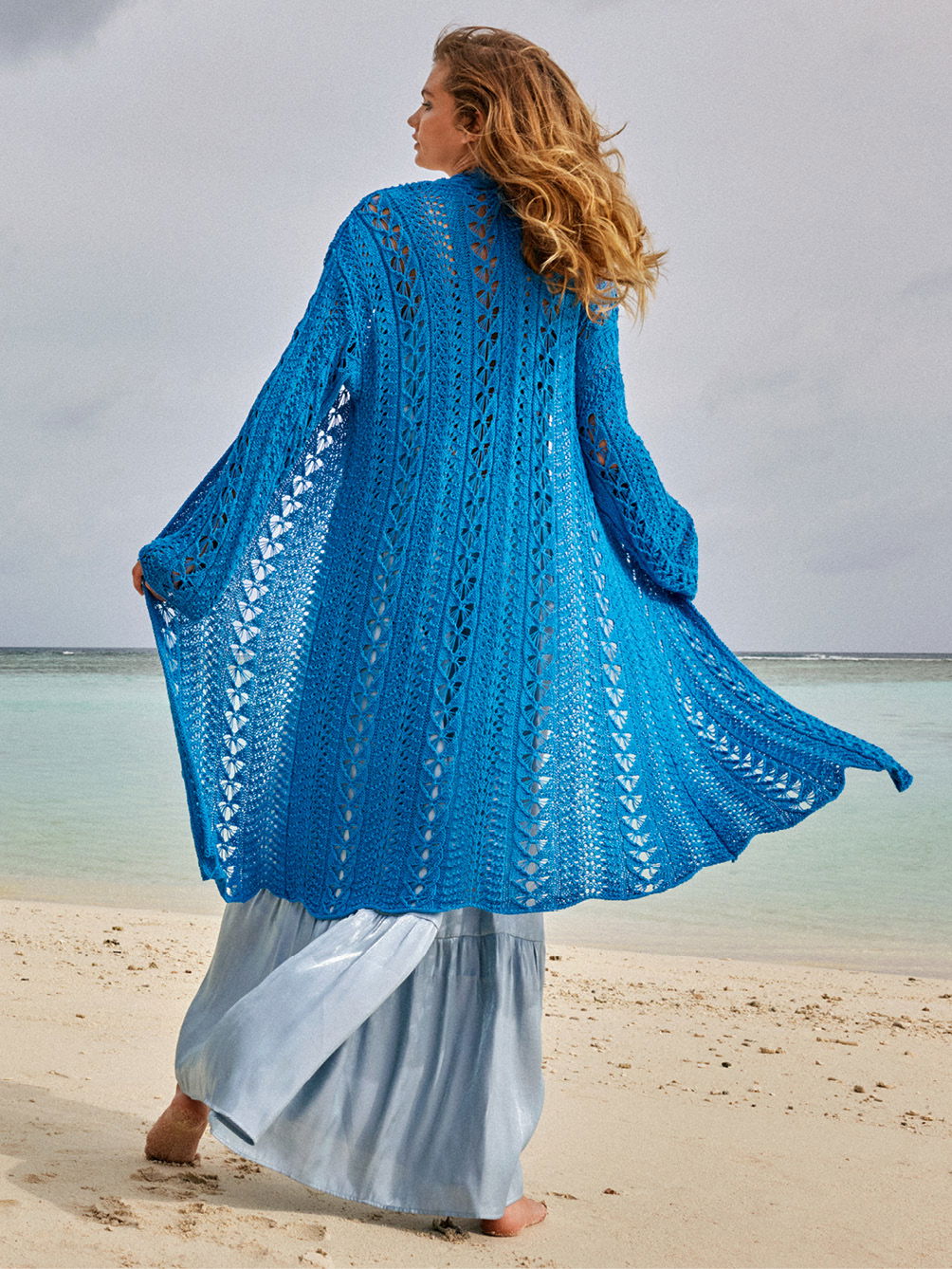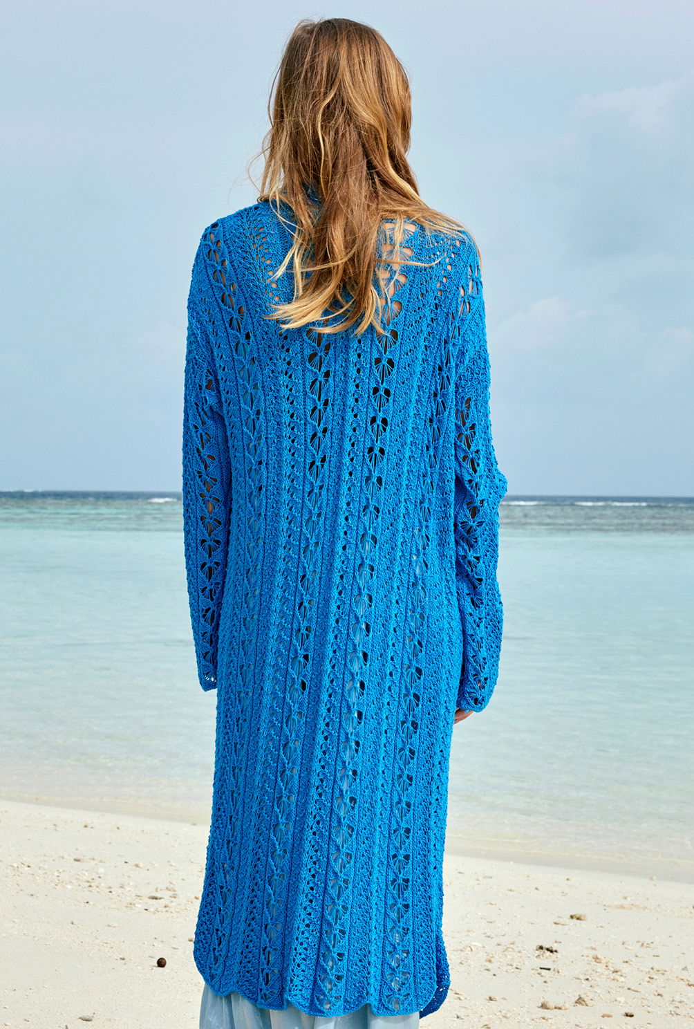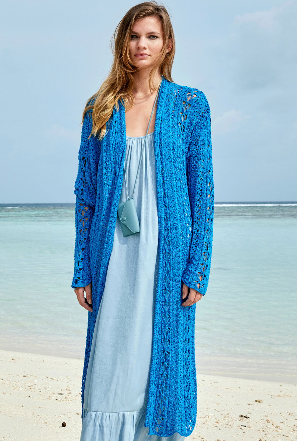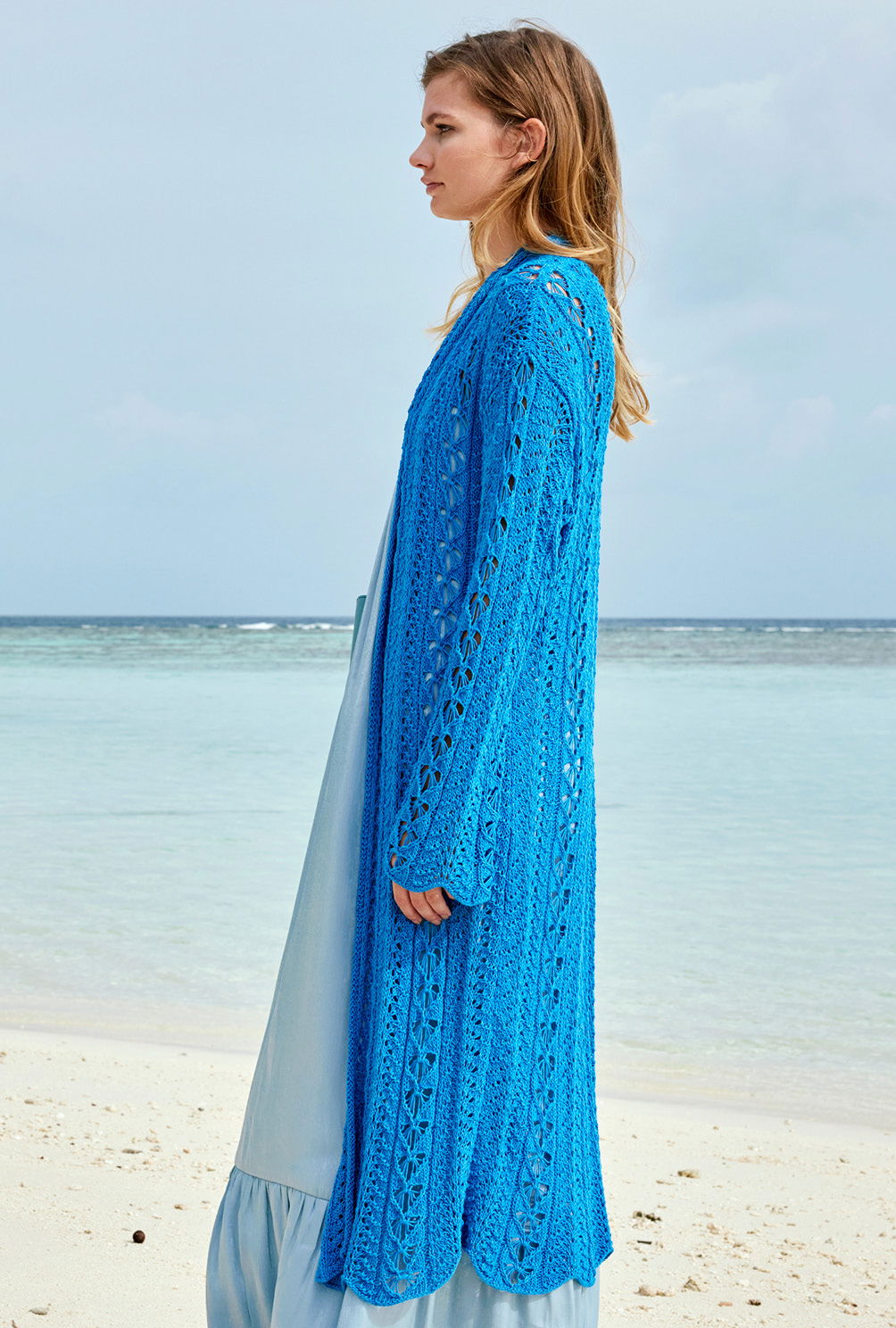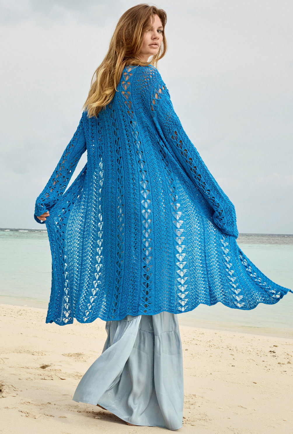 Das Azurblau dieses Mantels vermittelt Weite und Kontinuität. Dazu die sensationelle Muster-Optik – und ein weiterer hochmodischer Trendsetter vervollständigt deine Sommergarderobe. Zugegeben, im Musterwechsel und mit Nadelstärke Nummer 3,5 braucht es schon Geduld – aber so ein Prachtexemplar ist den Aufwand durchaus wert. Das Pfauenfedermuster ist nicht kompliziert und in der Anleitung Reihe für Reihe detailliert beschrieben. Das Schmetterlingsmuster mit seinen unterschiedlichen Umschlägen und verschränkten Maschen benötigt zwar ein wenig mehr Aufmerksamkeit, aber die klare Strickschrift in der Anleitung hilft dabei, stets den Überblick zu behalten. Gestrickt wird in einzelnen Teilen von unten nach oben, am Anfang kann es hierbei hilfreich sein die einzelnen Musterstreifen mit kleinen Maschenmarkieren zu kennzeichnen. Sind alle Teile fertig werden noch die Nähte geschlossen und Verschlussränder bekommen noch einen Rollrand.