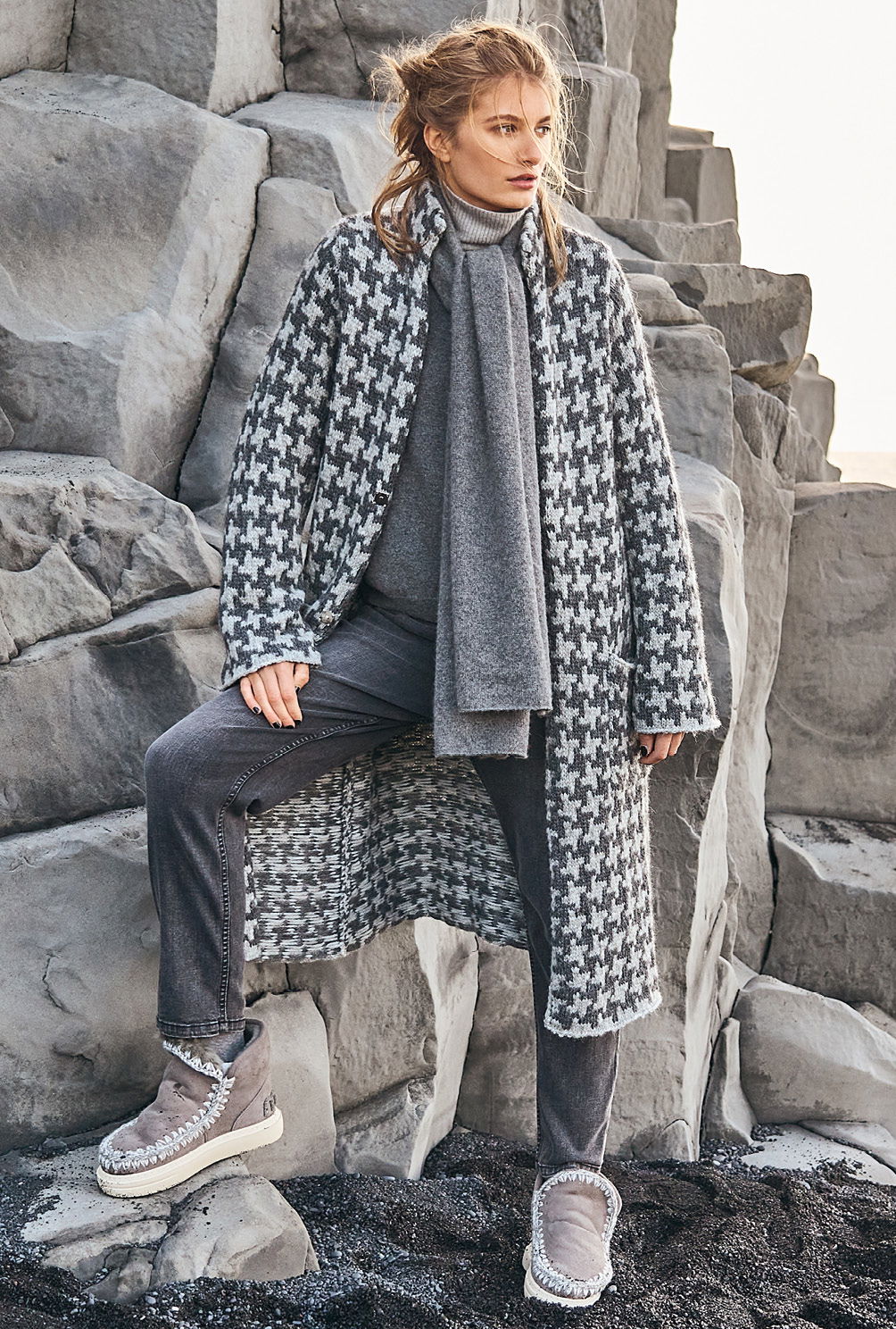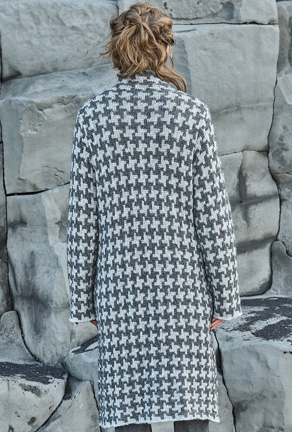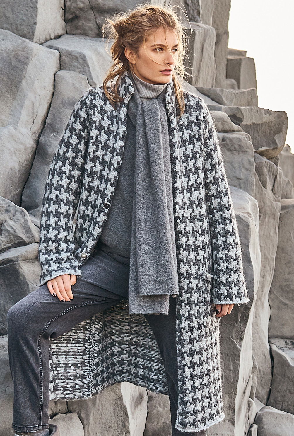 Dieser tolle Strickmantel vermittelt Flair und Ausstrahlungskraft. Einerseits durch das zweifarbige Hahnentrittmuster, das in Norwegertechnik glatt rechts entsteht. Das heißt, der unbenutzte Faden wird stets locker auf der Rückseite der Arbeit mitgeführt. Andererseits hat dieses coole Maschenhighlight einiges an modischen Details aufzuweisen: die gerade Schnittform, die eingearbeiteten Taschen und der gedoppelte Kragen. Das Finish bilden dezente Magnetknöpfe, die bei kühlen Temperaturem die Vorderteile fast unsichtbar schießen
