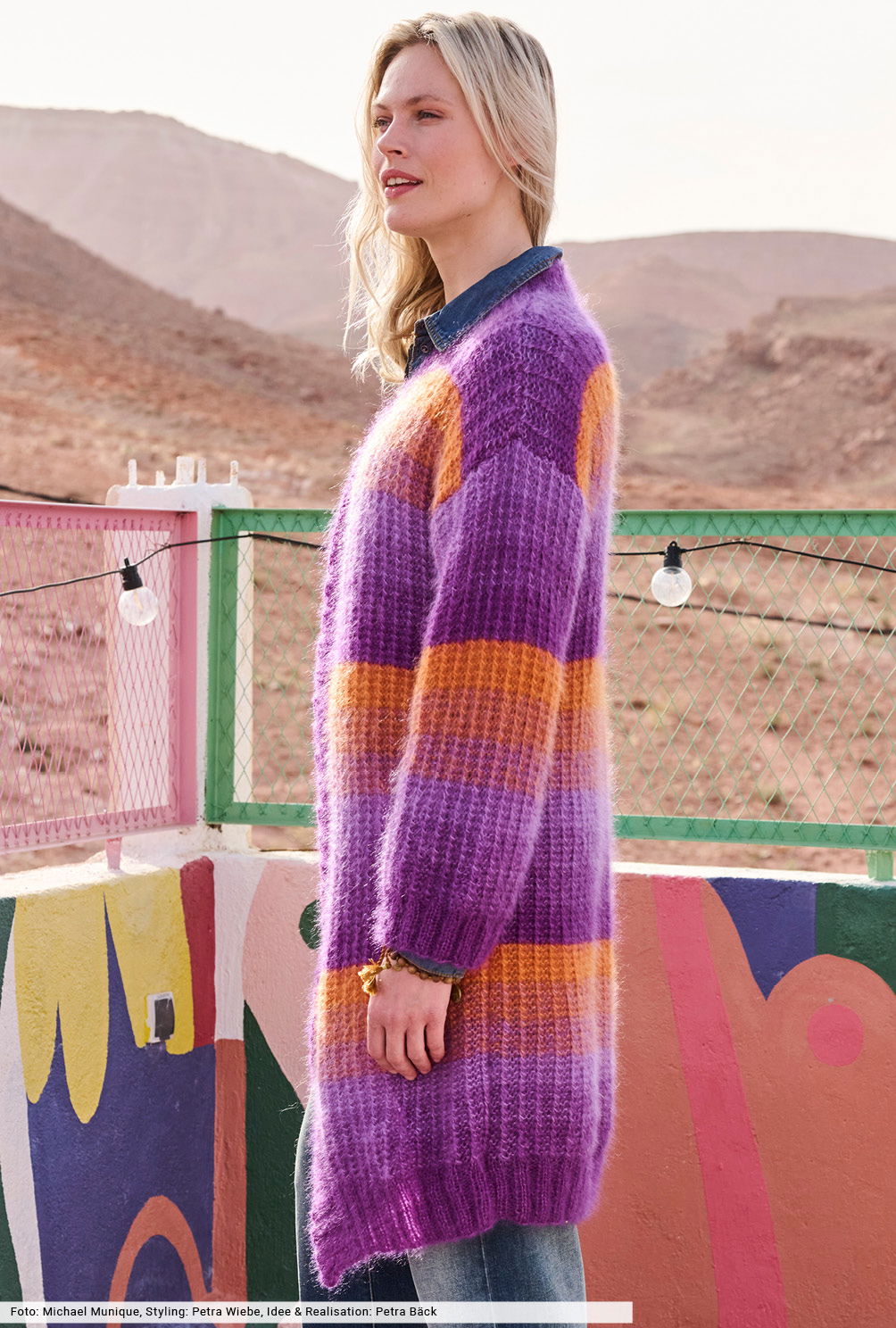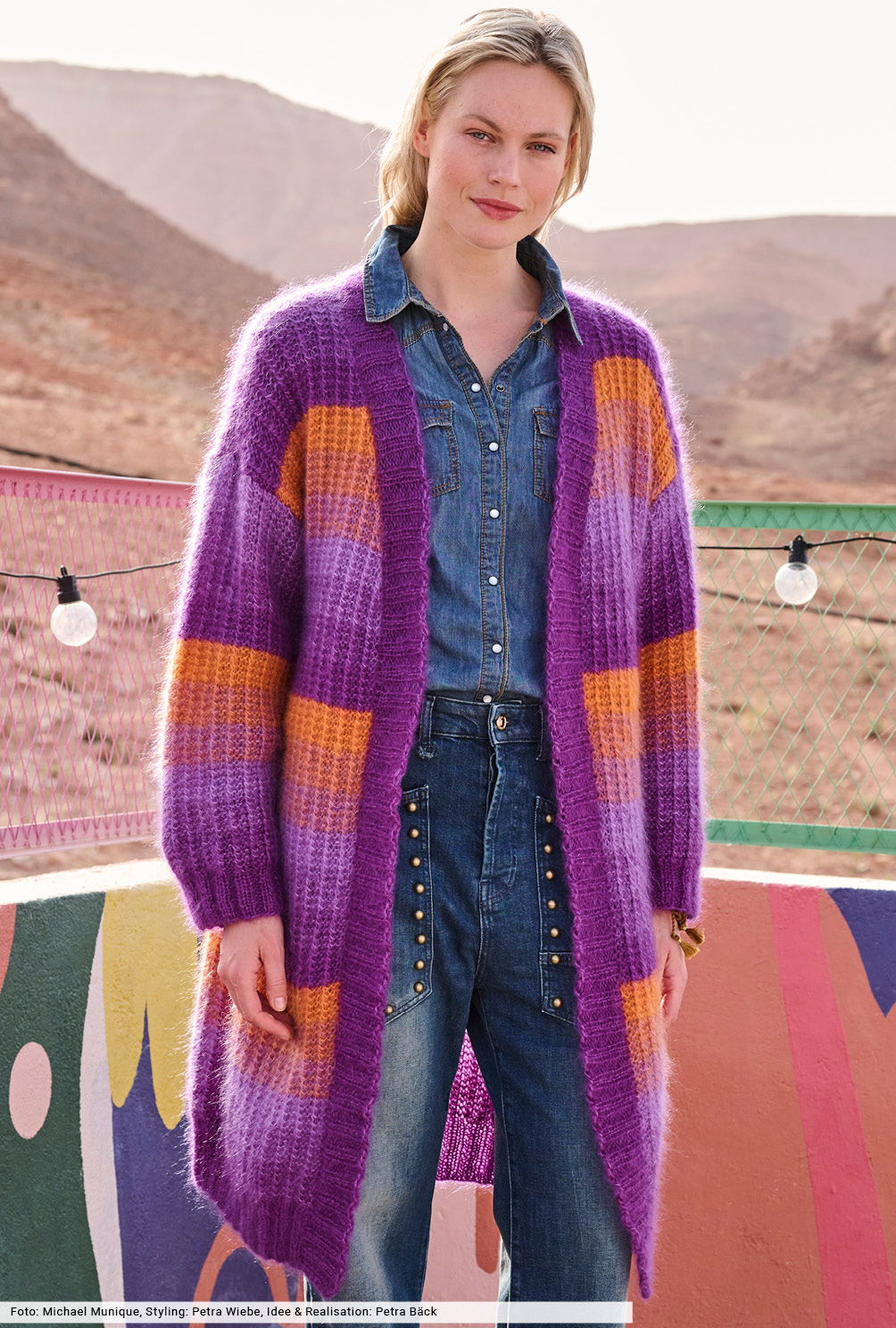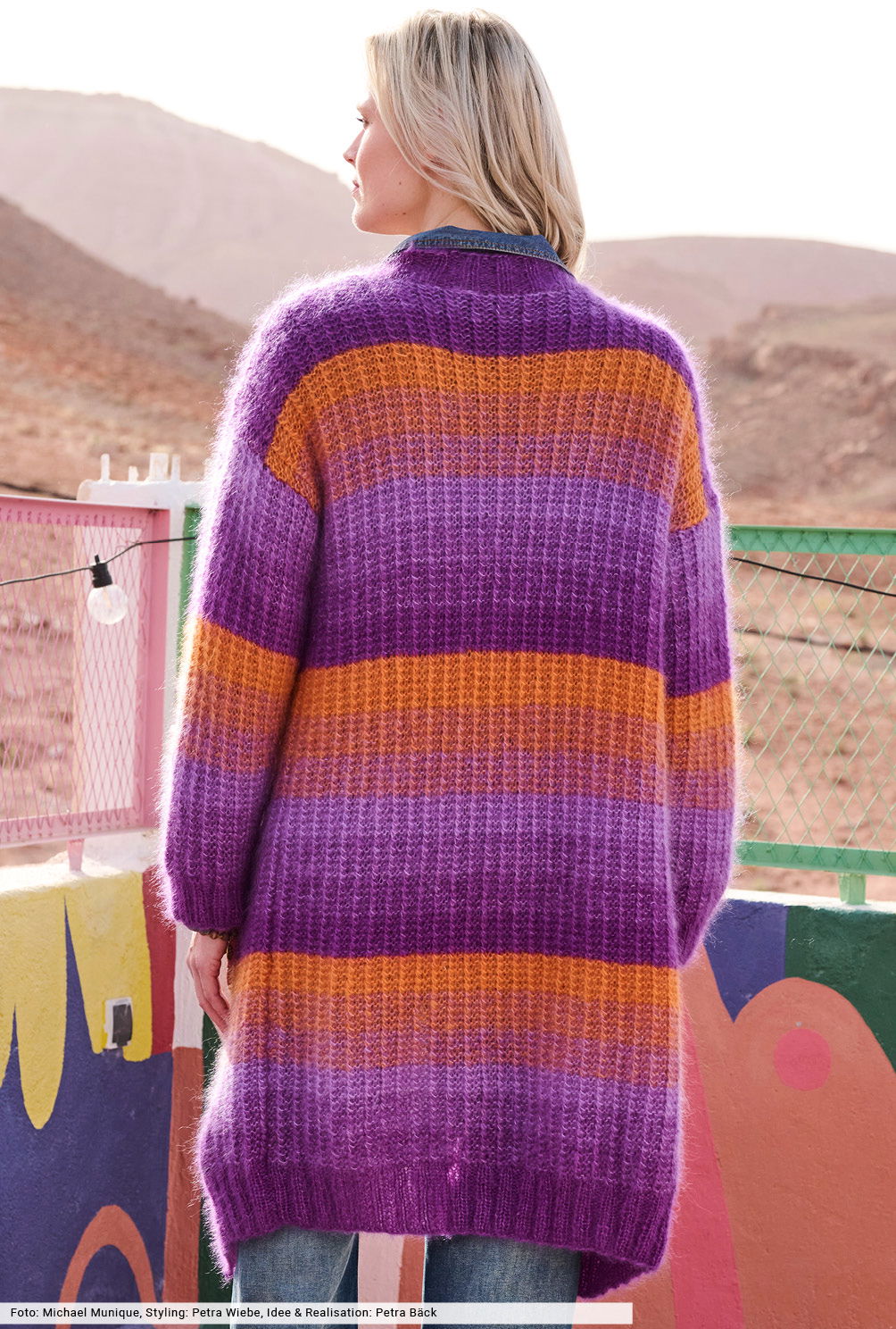 Orange und Violett geben hier den Ton an. Und zwar dreifädig im spannenden Farbverlauf, bei dem steifenweise immer ein Farbe ausgewechselt wird. Wie das funktioniert, wird in unserer Anleitung genau beschrieben, sodass auch Strickneulinge zum Erfolg kommen. Für das klare Bild sorgt ein schlichtes Rippenmuster in markanter Optik, das von elastischen Blenden eingerahmt wird. Und das Schönste: Der Mantel kommt ohne Knöpfe und Verschlüsse aus.