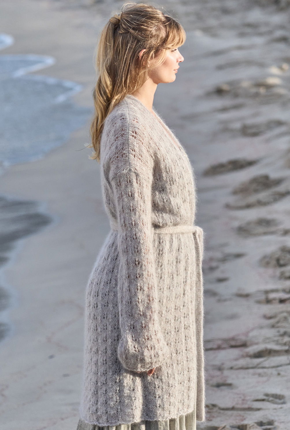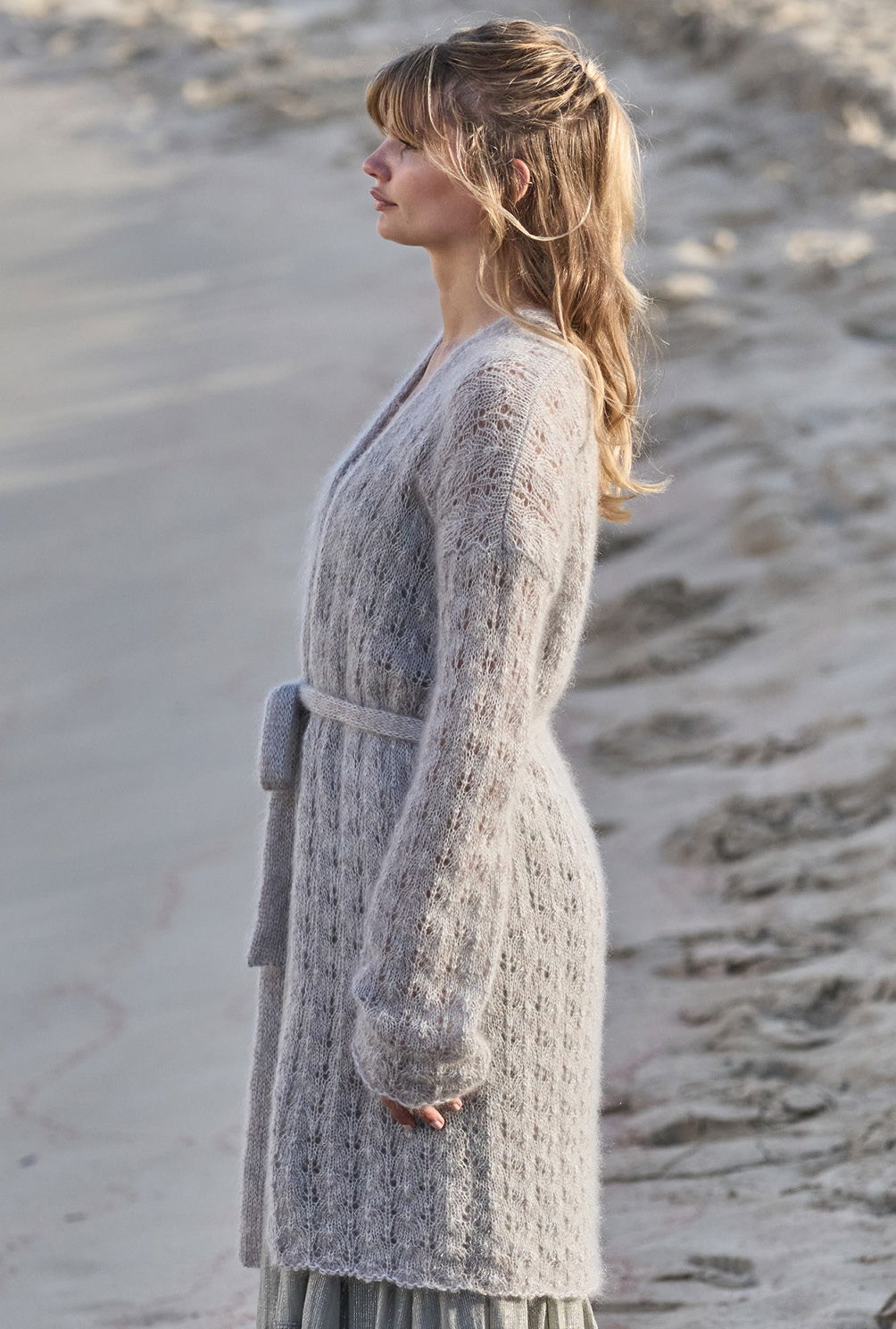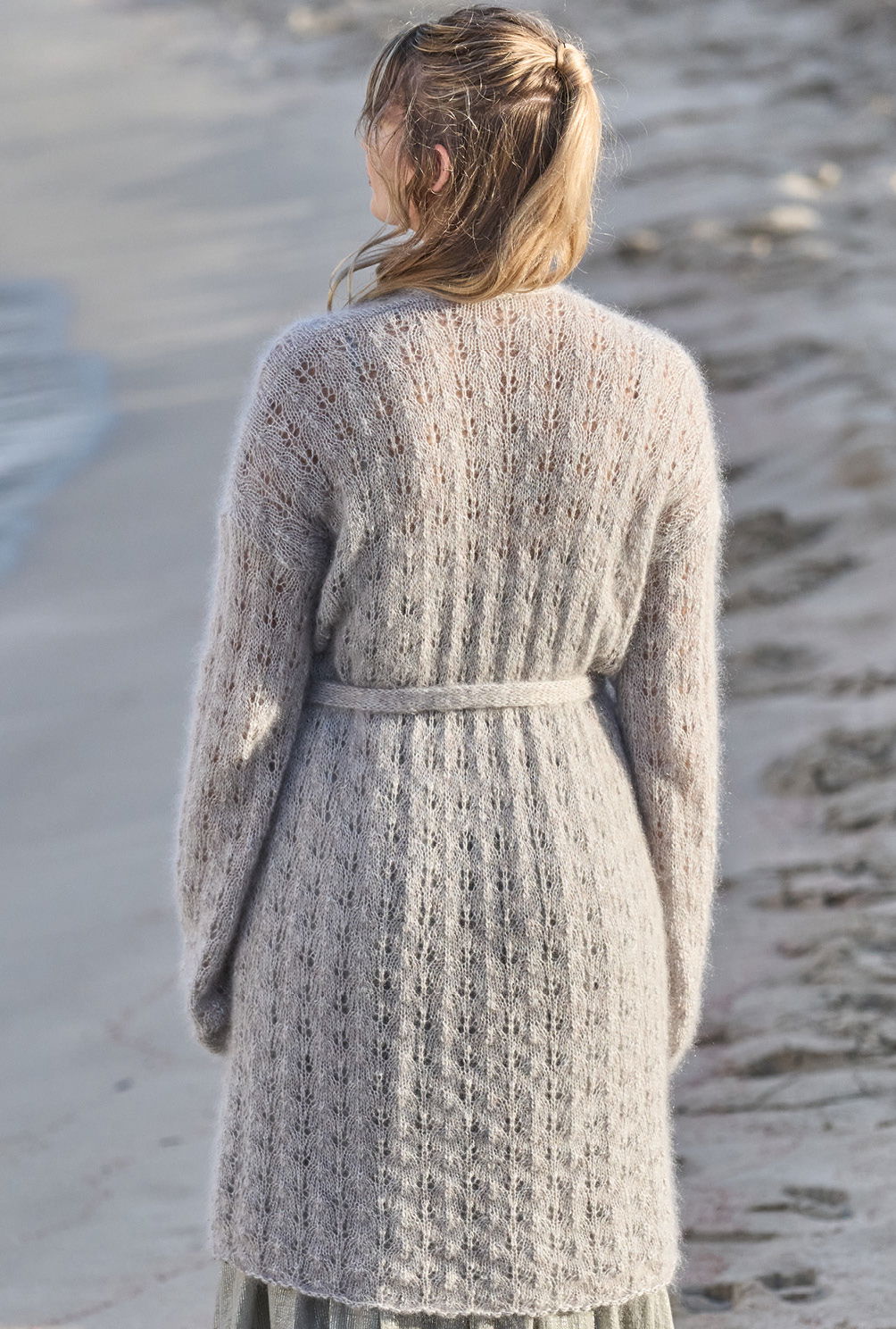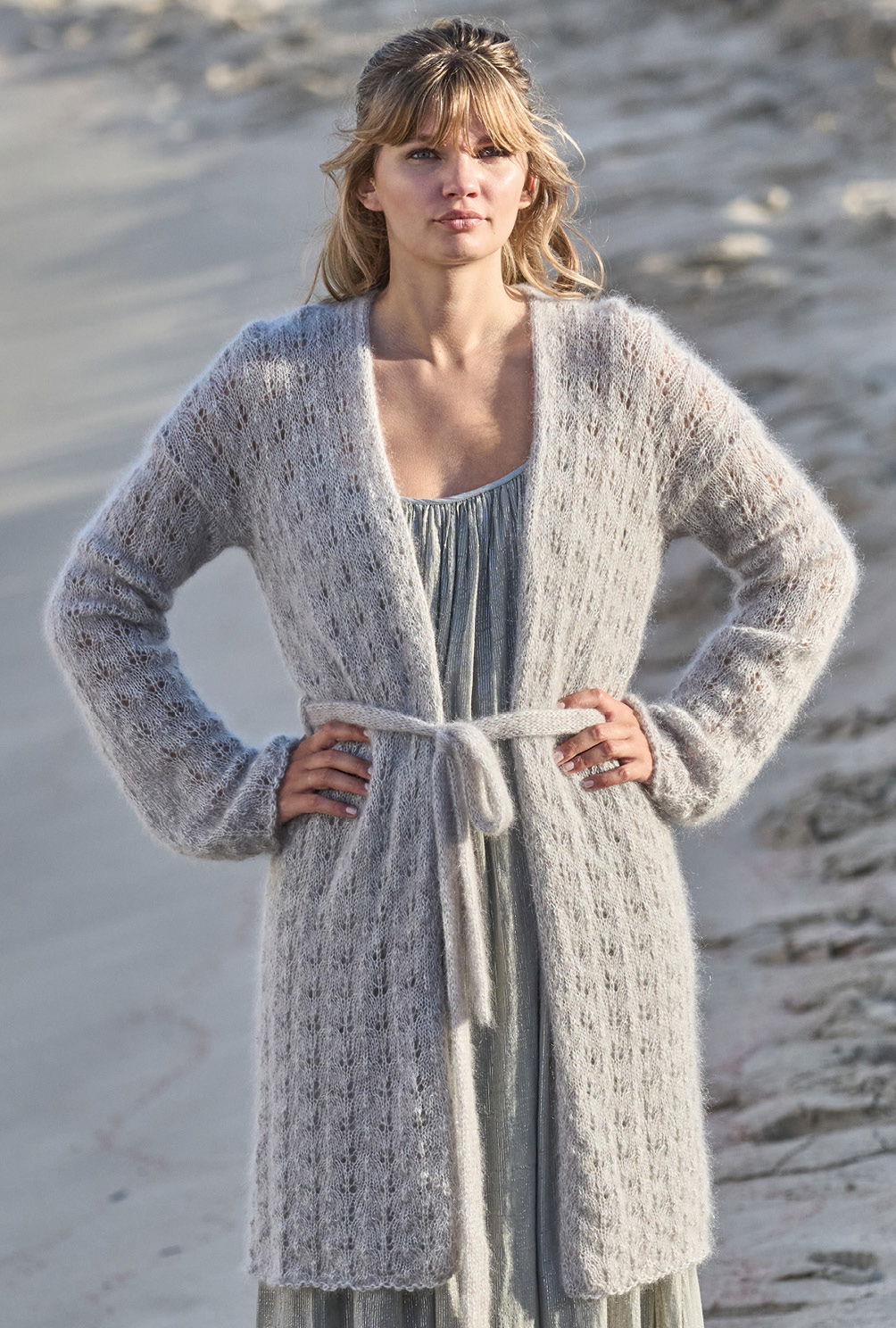 Um leicht melierte Effekte zu erzielen, kannst du einfach feines Mohairgarn dreifädig verstricken. Nebenbei kommst Du dadurch mit etwas dickeren Nadeln auch etwas schneller zum Ziel. Das verspricht auf jeden Fall dieser gerade geschnittene Mantel, dem wir mit Flieder, Mint und Hellgrau den coolen Look verpassen und zudem mit einem schlichten Ajourmuster etwas Lockerheit und Transparenz schaffen. Das Finish bildet der glatt rechts gestrickte Gürtel, der mit Schlaufen auf Taillenhöhe fixiert wird.