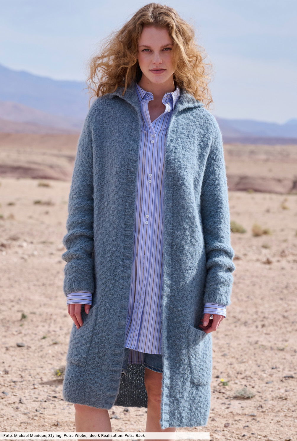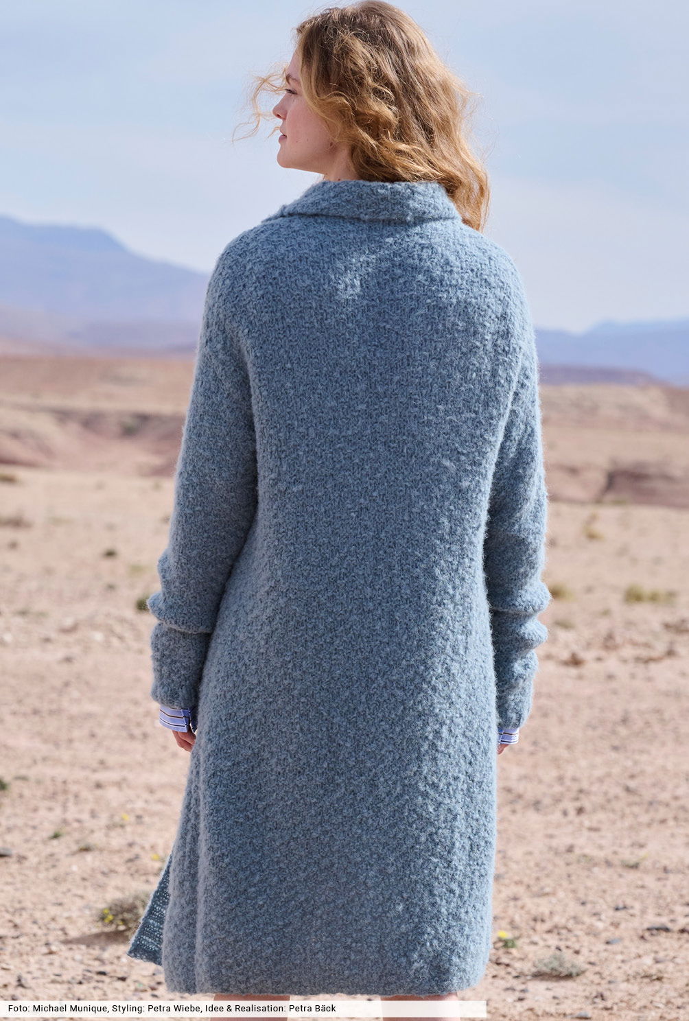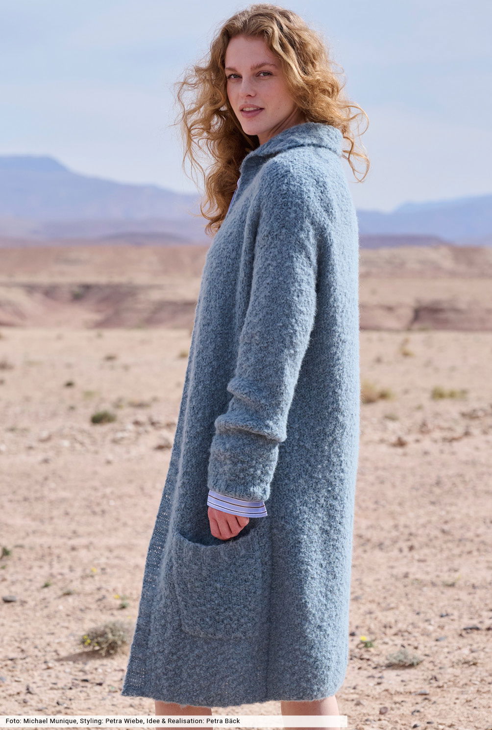 Understatement in Maschenform, aber trotzdem ein Hingucker: Der Mantel mit aufgesetzten Taschen lebt von seiner ausgesprochen lässigen Ausstrahlung. Die entsteht durch den geraden, schnörkellosen Schnitt, durch die schlichten Karostrukturen und durch ein Flauschgarn, das sanft die Konturen umhüllt. Aufgenähte Taschen und die hohen Schulterschrägungen machen daraus ein anfängerleichtes Modell mit Stil und Ausstrahlung, das dich bis weit in den Winter begleiten wird.