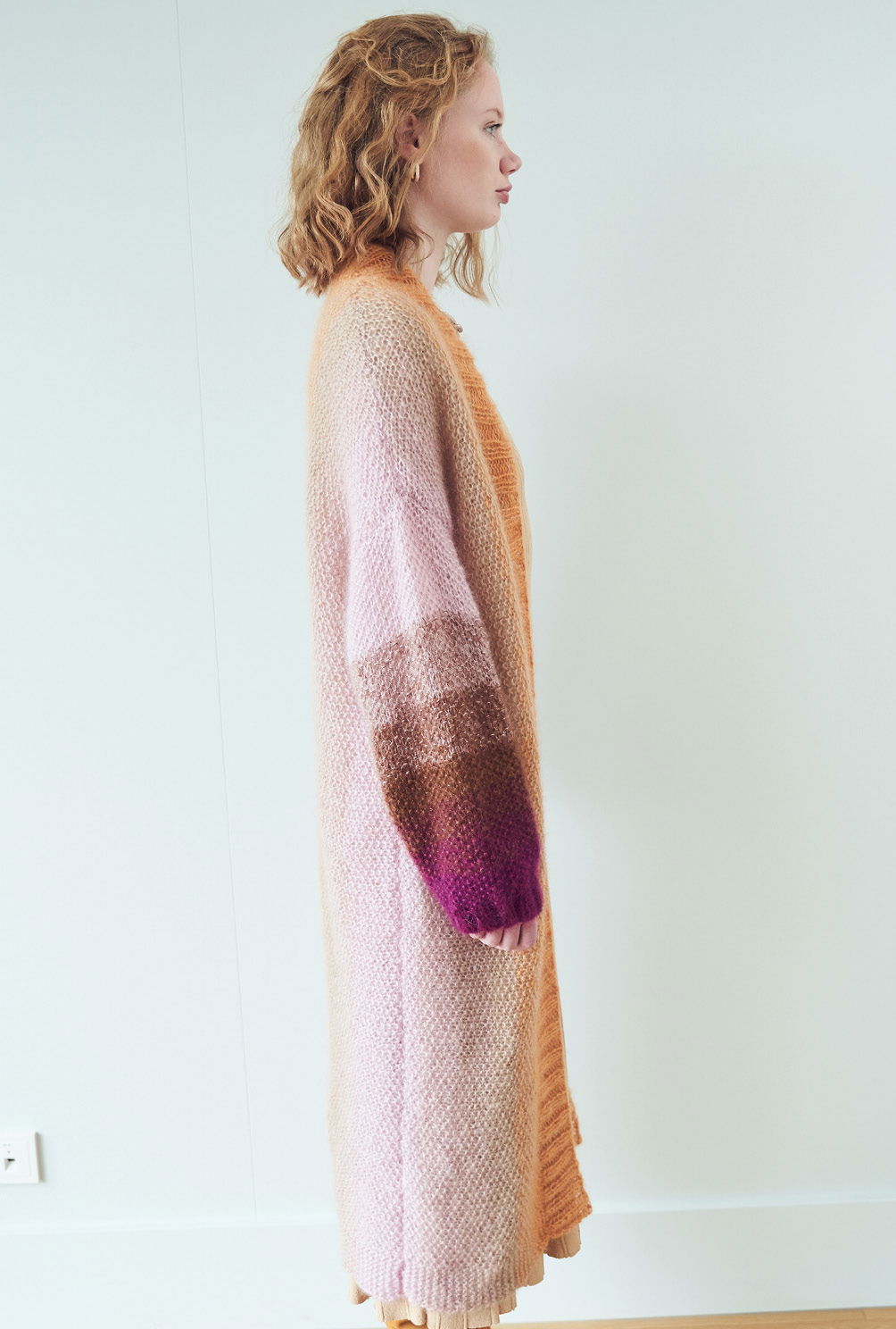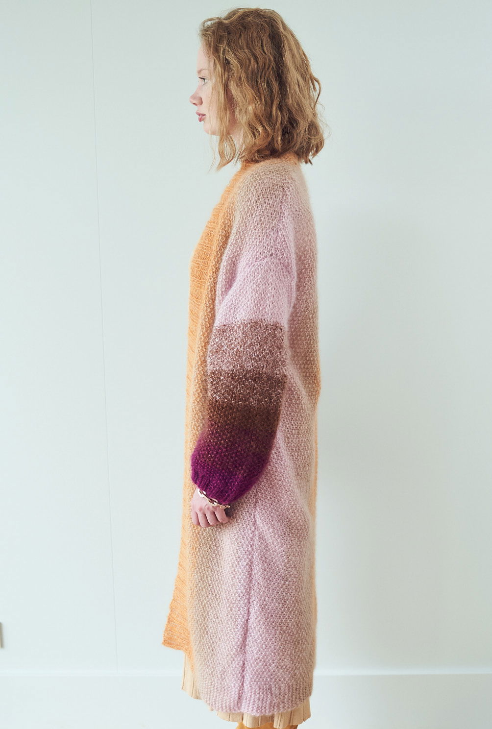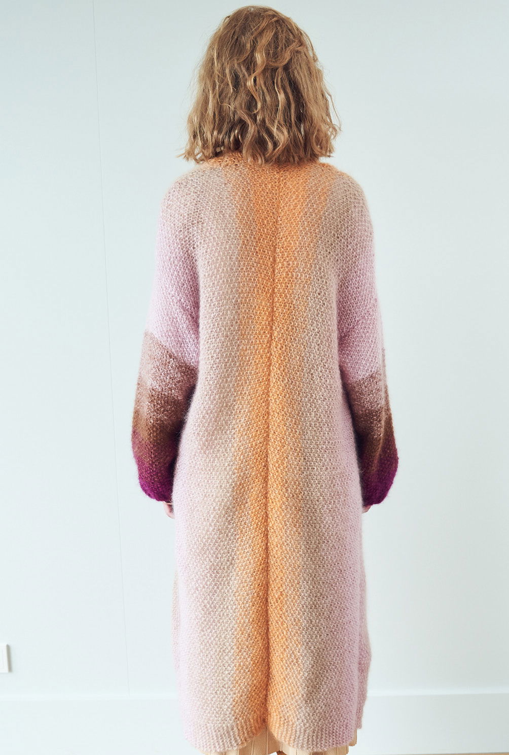Nur ein Hauch von Masche: Der wadenlange Mantel aus superleichtem Seiden-Mohairgarn macht durch die Längsstreifen immer eine gute Figur. Gestrickt wird der Mantel in Einzelteilen quer. Dabei wird stets dreifädig gearbeitet und der Farbverlauf nach und nach durch den Wechsel einzelner Fäden ganz sanft gefadet. Das kleine Perlmuster ist ganz einfach zu stricken und in der Anleitung detailliert Reihe für Reihe beschrieben. Ebenso natürlich auch wie der Farbverlauf harmonisch und weich gelingt. Sind alle Teile fertig, werden die Nähte geschlossen und die Blende im Rippenmuster angestrickt. Am besten nimmt der Mantel dann noch ein kleines Bad und wird liegend schön ausgestrichen getrocknet – so entfaltete das garn seinen ganzen, unwiderstehlichen Flausch.