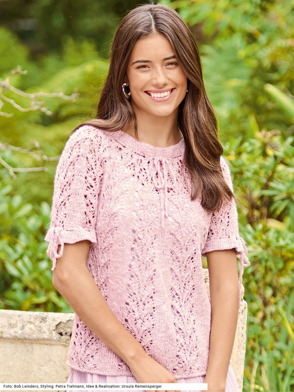 Der von oben nach unten in einem Stück gestrickte Kurzarmpullover mit filigranen Ajourmusterstreifen und glatt rechten Streifen bietet sich an für ein sehr weibliches Kleidungsstück, das nicht nur zu einem Rock, sondern auch zur Jeans sehr gut aussieht. In die doppelt gestrickte Ausschnittblende ist eine Kordel (als I-Cord gestrickt) eingezogen und zur Schleife gebunden. Auch die Ärmel haben diese Variante des Abschlusses. Das geflammte Leinen-Baumwolle-Viskose-Mischgarn eignet sich besonders gut für diesen Sommerpulli. Eine Anleitung gibts für die Größen 36/38, 40/42 und 44/46.
