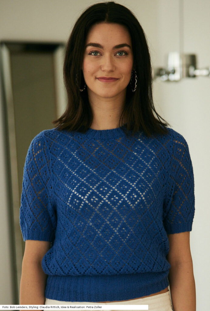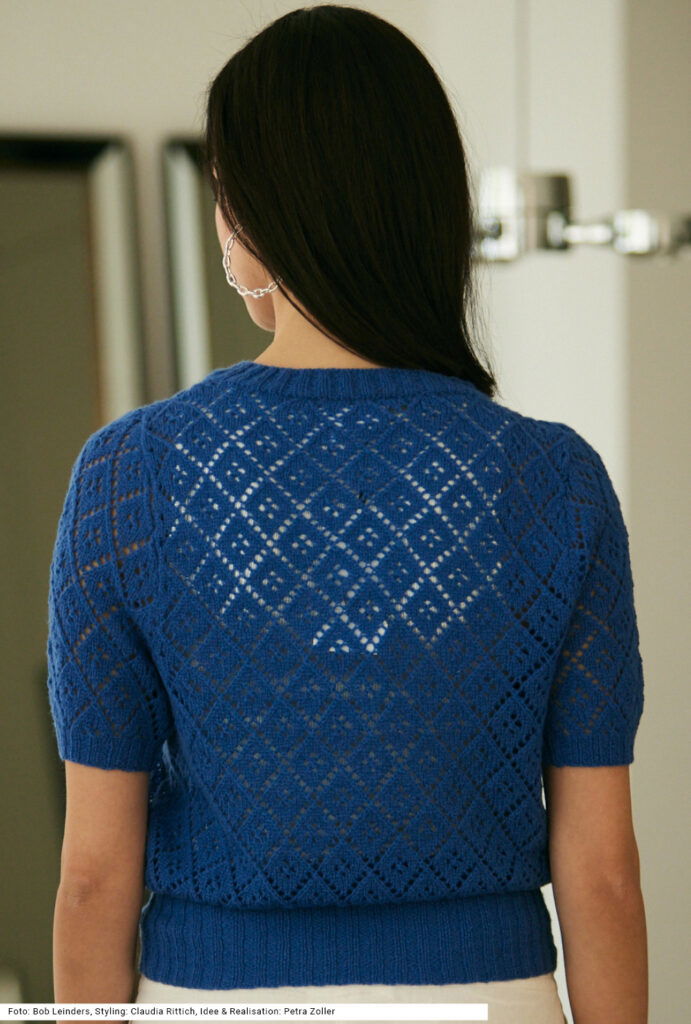 Der kurzärmelige Pulli mit Ajourrautenmuster leuchtet in einem herrlich satten Blau. Das sieht zu einer weißen Hose frisch und elegant aus, zu einer Leinenhose im gleichen Blau dagegen sehr stylish. Als Garn haben wir eine Mischung aus Schurwolle und Polyamid gewählt. Das Rippenmuster wird am Bund recht hoch gestrickt, an den Ärmelbündchen und an der Halsausschnittblende eher kürzer. Die kurzen Ärmel haben eine Armkugel, sodass sie sich perfekt an der Schulter einpassen. Eine Anleitung ist für die Größen 36/38, 40/42 und 44/46 vorhanden.