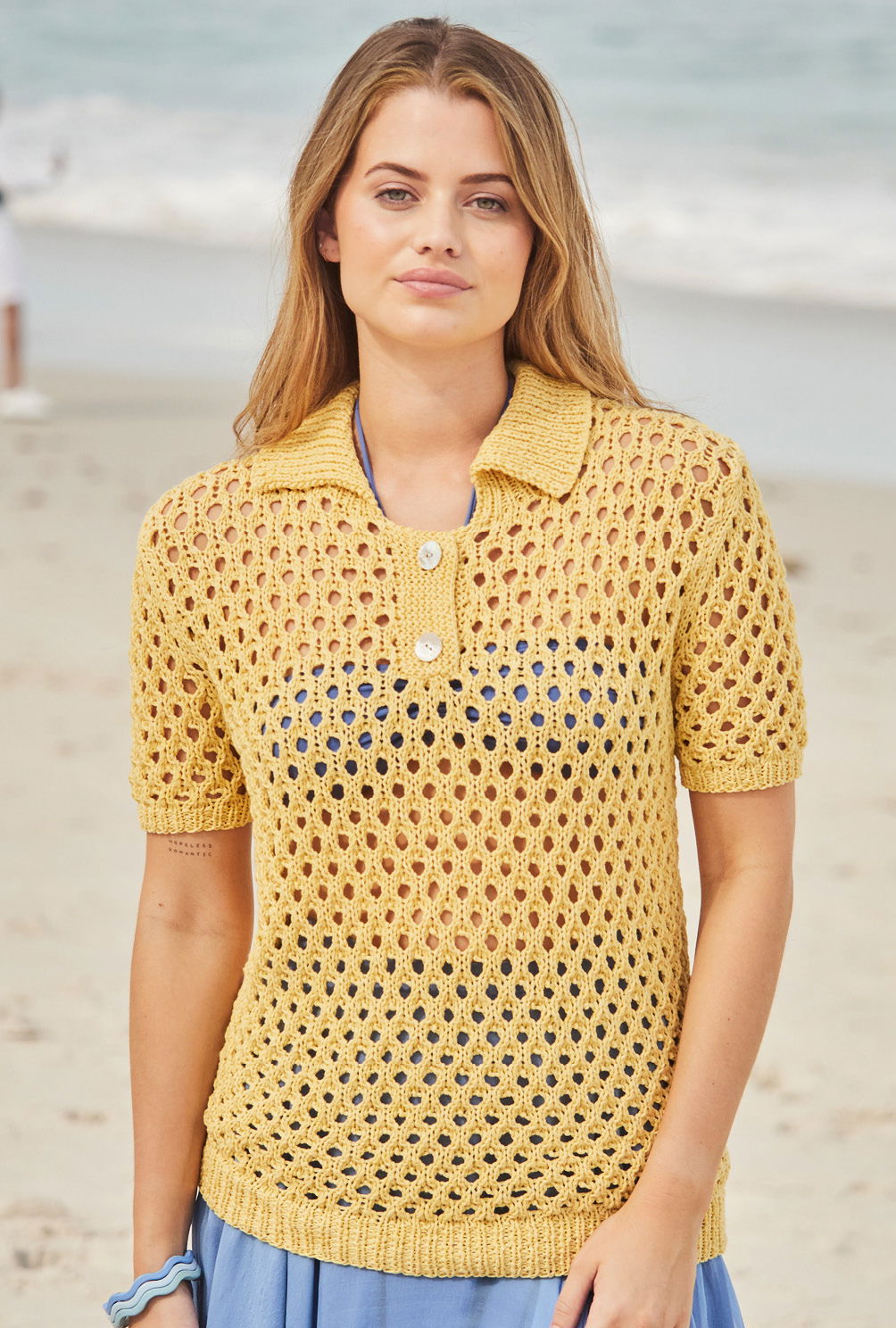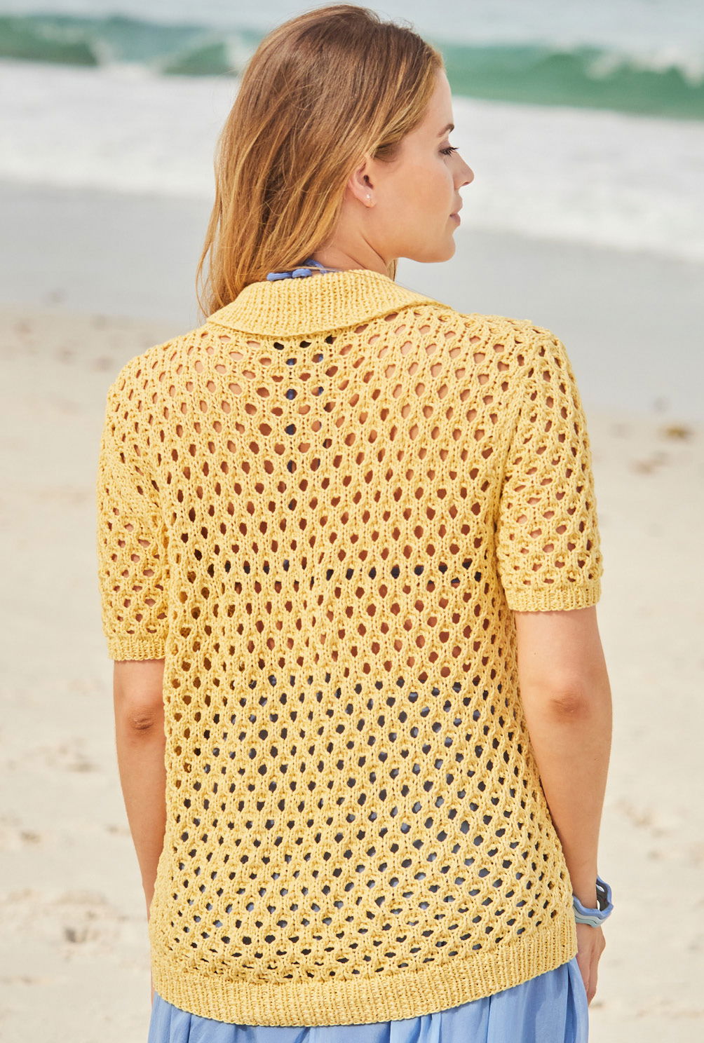 Der Kurzarmpulli mit einem großzügigen, luftigen Lochmuster und sportlichem Polokragen ist ein Multitalent. Die Bündchen und der Umschlagkragen sind in 1/1-Rippen gearbeitet, die Knopfblende ist kraus rechts gestrickt. Mit zwei hübschen Perlmuttknöpfen wird der Ausschnitt geschlossen. Das sonnengelbe Mischgarn besteht zu einem Großteil aus Baumwolle mit etwas Schurwolle-Beimischung. Die Anleitung ist in den Größen 38/40, 42/44 und 46/48 vorhanden.
