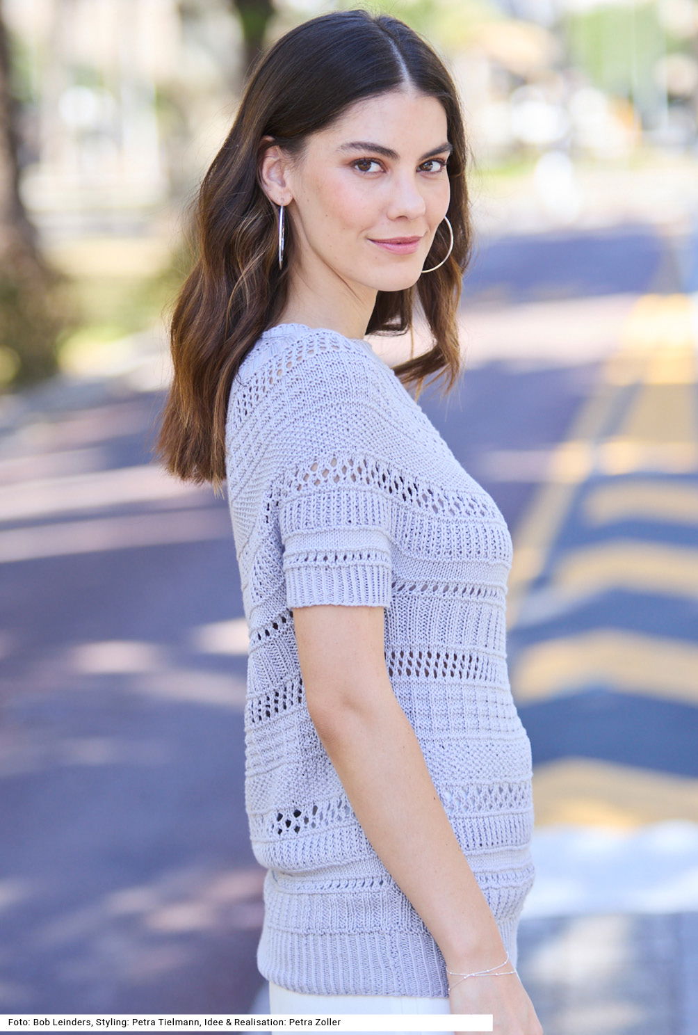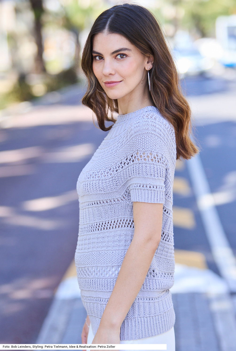 Die Mustervielfalt dieses Pullis mit kurzen Ärmeln ist enorm – also genau das Richtige, um nie Langeweile aufkommen zu lassen. Es gibt nicht nur zweierlei Rippenmuster, sondern ebenso kraus rechts und kraus links, glatt rechts und Lochstreifen sowie Halbpatent, Wabenmuster, kleines Perlmuster, Waffelmuster und Netzmuster. Alles einfach zu stricken, mit großer Gesamtwirkung. Die kurzen Ärmel sowie Vorder- und Rückenteil des Modells werden zuerst gearbeitet, anschließend zusammengesetzt und als Passe in Runden fortgesetzt. Das sorgt dafür, dass sich der Pulli wunderschön um die Schultern schmiegt. Für das Modell aus Biobaumwolle und Soja gibt es eine Anleitung in den Größen 36/38, 40/42 und 44/46.