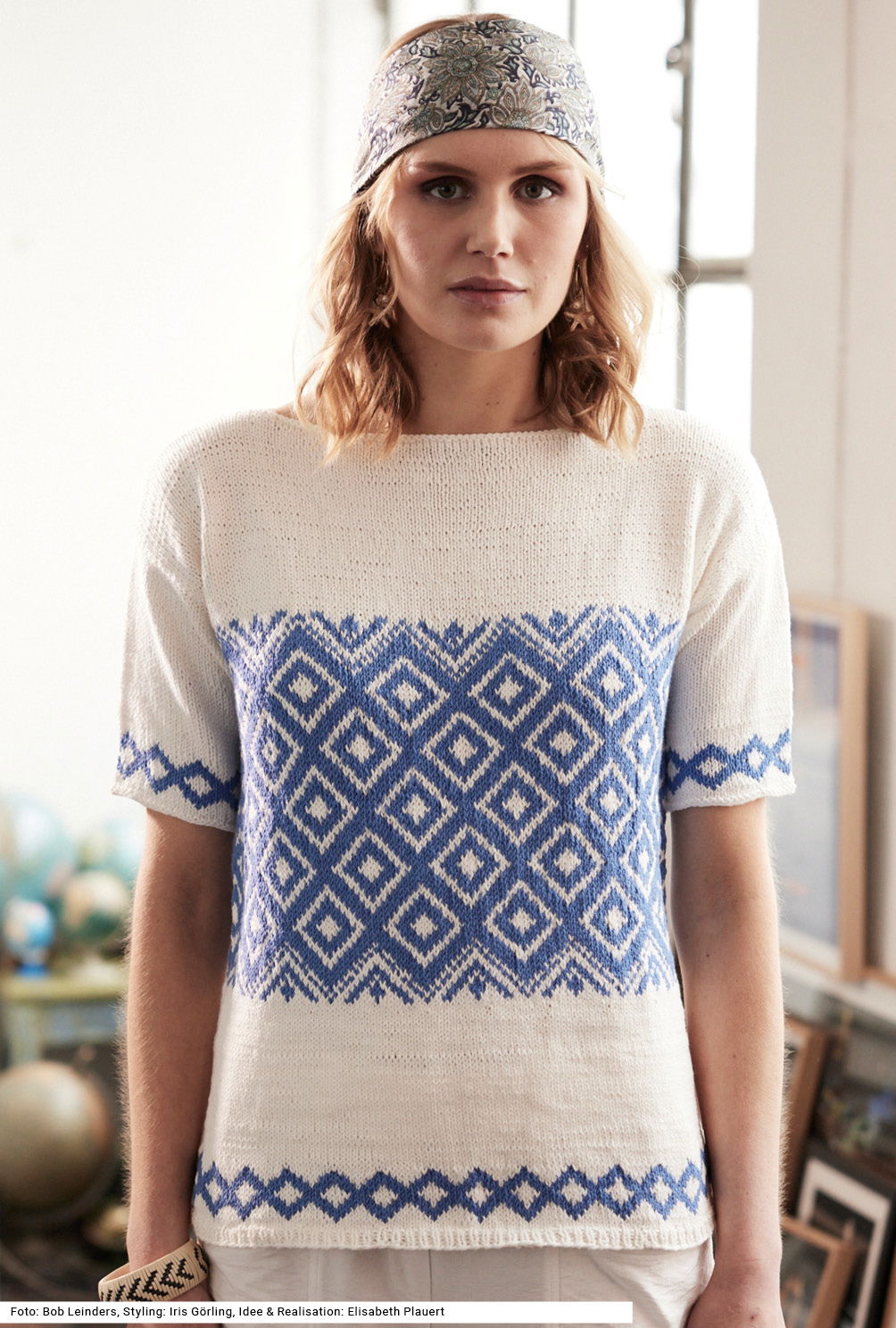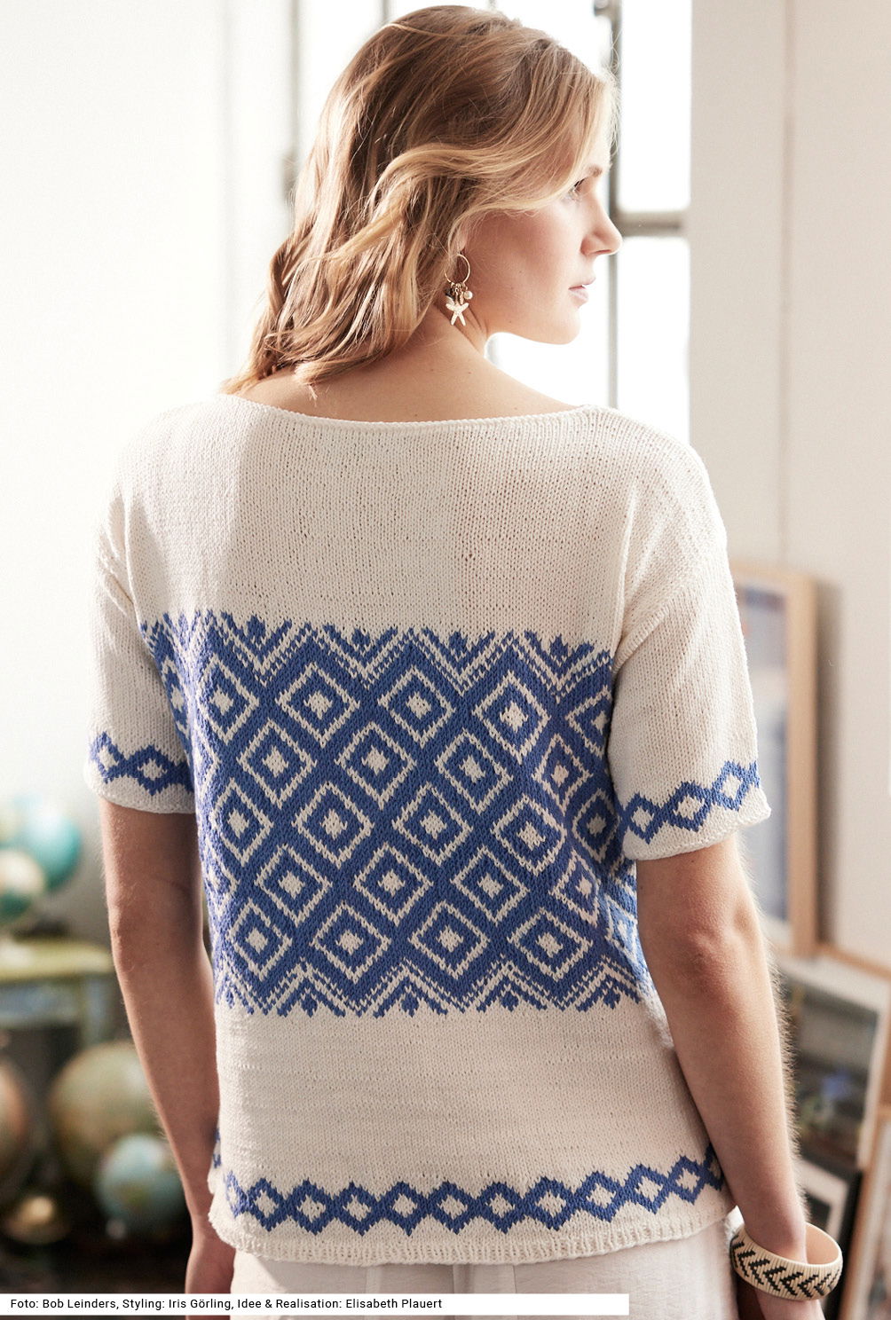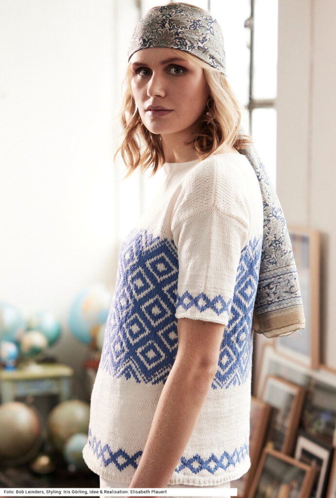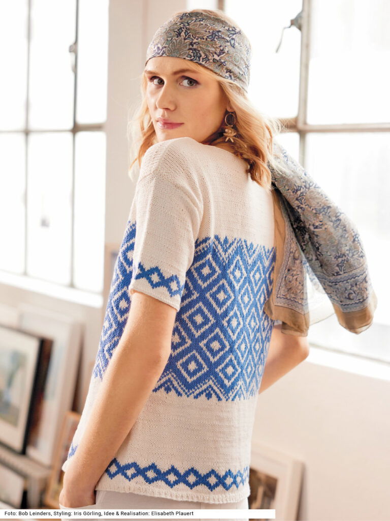 Dieser Kurzarmpulli in strahlendem Blau und Weiß erinnert mit seinem Rauten-Jacquardmuster an griechische Keramikfliesen. Ein kleines Rautenmuster zu Beginn von Vorder- und Rückenteil sowie an den Ärmeln lockert die an sich strenge Musterung auf dem weißen, glatt rechts gestrickten Grund auf. Um den niedrigen runden Halsausschnitt wird am Schluss lediglich noch eine Runde linker Maschen gestrickt, für einen sauberen Abschluss. Nur der 1 cm breite Bund ist im Rippenmuster gearbeitet. Es wird mit einem Baumwollgarn mit wenig Polyester-Beimischung gearbeitet. Die Anleitung kann für die Größen 36/38, 42/44 und 48/50 downgeloadet werden.