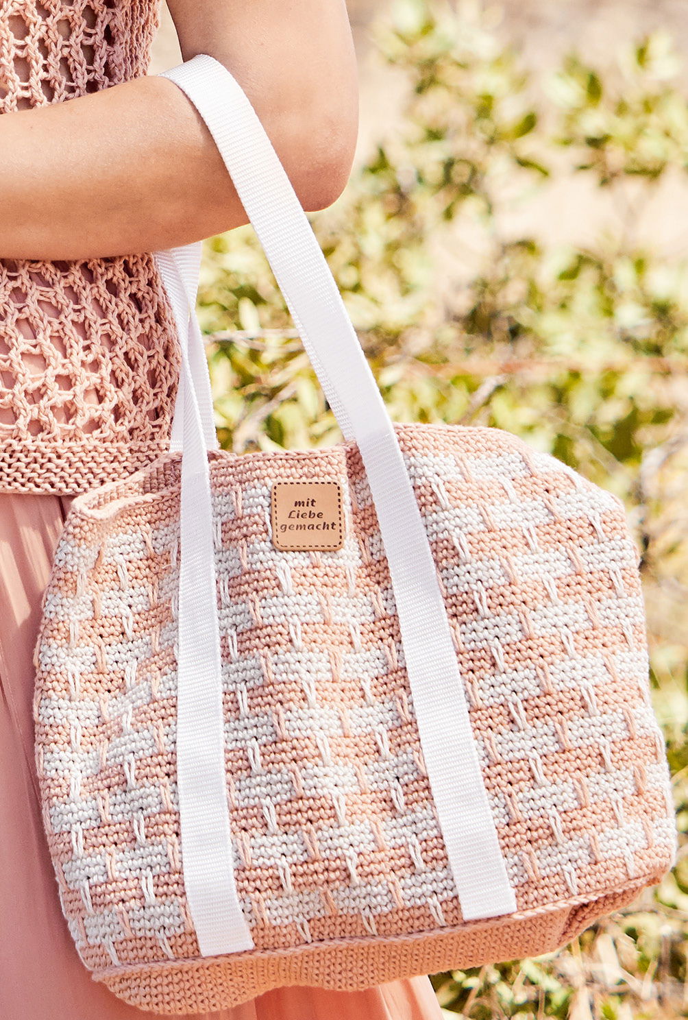 Handtaschen kann man ja bekanntlich nie genug haben – wie schön also, dass zu diesem Pullover gleich die Anleitung der passenden Tasche dabei ist! Für die Häkeltasche braucht es lediglich feste Maschen und tiefer gestochene Stäbchen. Für ein besonders professionelles Aussehen sorgen dann die aufgenähten Taschengurtbänder und das Label. Keine Sorge, eine Nähmaschine wäre hierfür schon vorteilhaft, aber es werden keine besonderen Nähkünste benötigt.