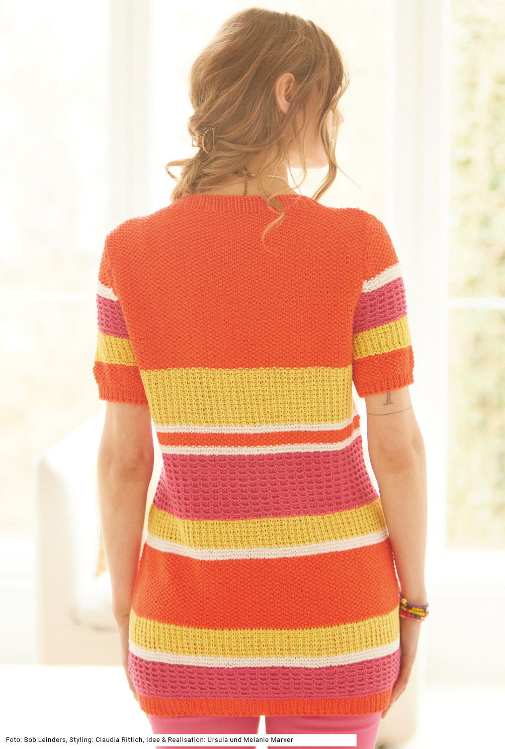 Dieser Longpulli mit Musterstreifen ist perfekt für alle, die ein paar Pölsterchen um die Hüften verstecken wollen. Die strahlenden Farben Koralle, Zyklam, Gelb und Weiß werden mal kraus rechts, mal im Perlmuster, dann im Waffelmuster und schließlich im Halbpatent verstrickt. Durch die leichte Taillierung bekommt der Pullover zudem eine modisch-feminine Note. Ärmel mit Armkugel passen sich perfekt an die Schultern an. V-Ausschnittblende und Ärmelbündchen werden im 1/1-Rippenmuster gearbeitet. Dazu ein tolles Garn aus Baumwolle und Hanf.