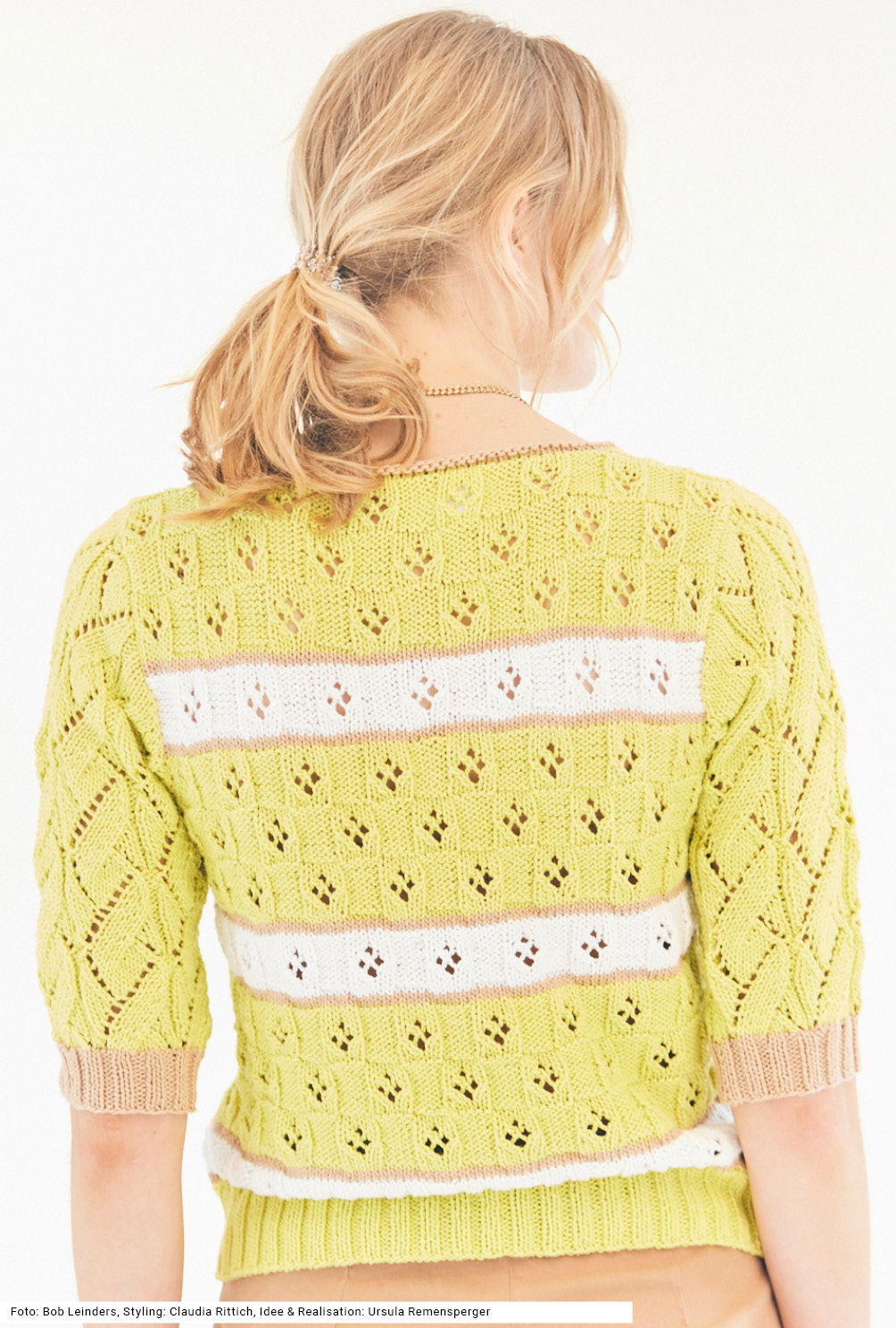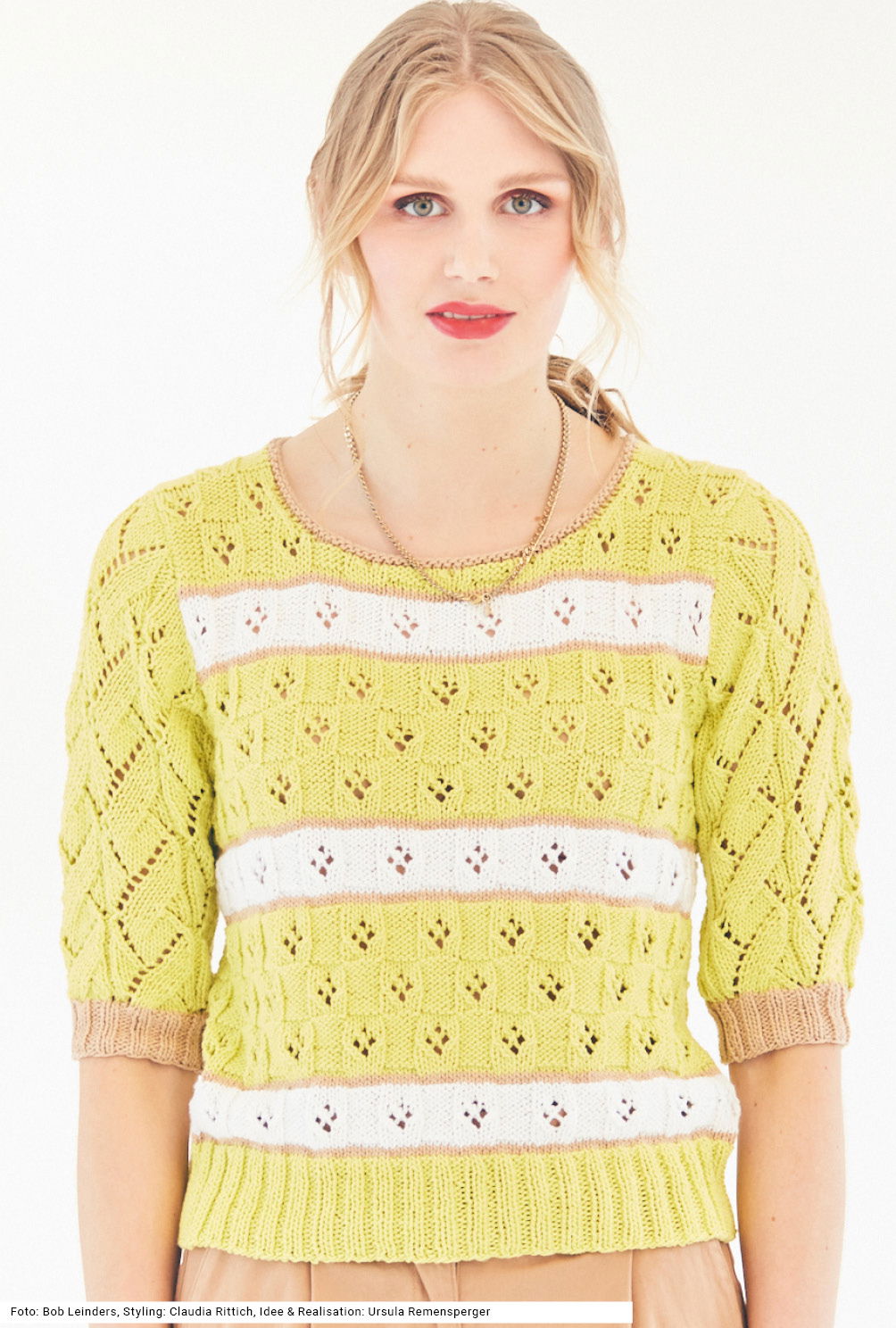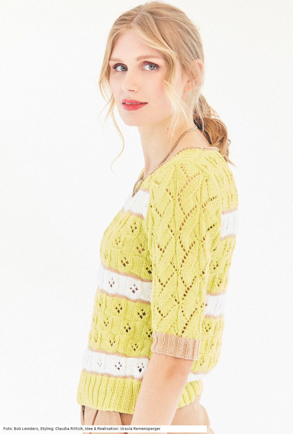 Dieser Pulli, dessen Ärmel bis knapp über die Ellbogen reichen, beweist, dass Gelb auch ohne Neonanteil herrlich leuchten kann, wenn denn die Farbpartner dazu entsprechend zurückhaltend gewählt sind – hier lassen Beige und Weiß das Gelb wunderbar strahlen. Der Schnitt ist klassisch, mit Ärmeln mit Armkugel, die eine perfekte Schulterpartie ergeben. Die Ärmel haben ein anderes Ajourmuster als Vorder- und Rückenteil. Die Bündchen sind im 2/2-Rippenmuster gearbeitet – am Saum in Gelb, an den Ärmeln in Beige. sehr sommerlich ist das Garn: Baumwolle mit Viskose. Die Anleitung dazu steht für die Größen 36/38, 40/42 und 44/46 bereit.