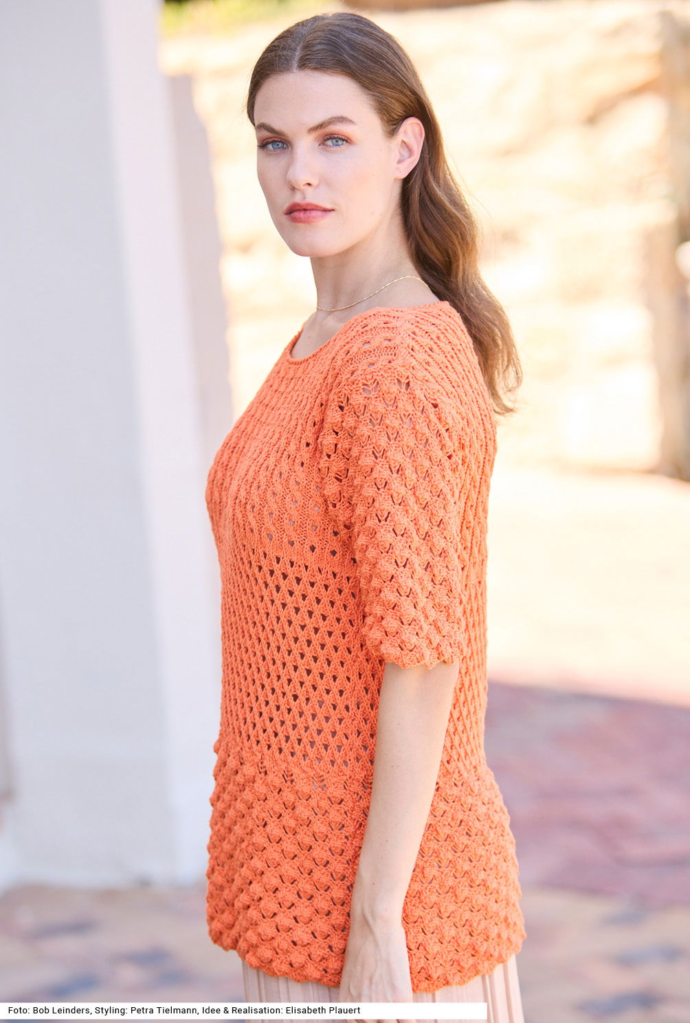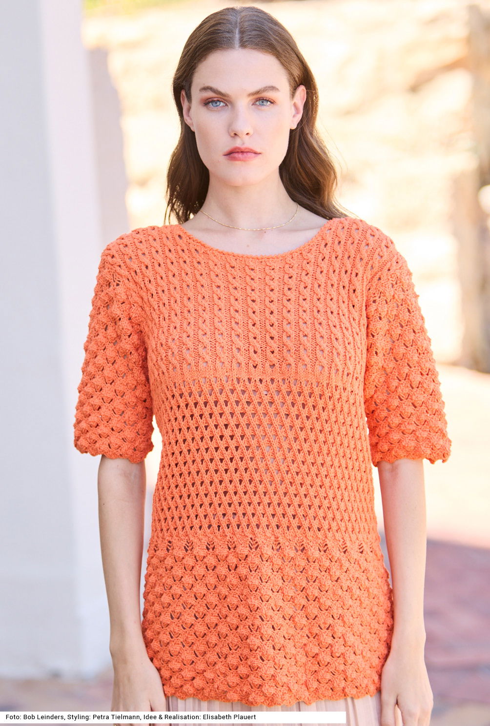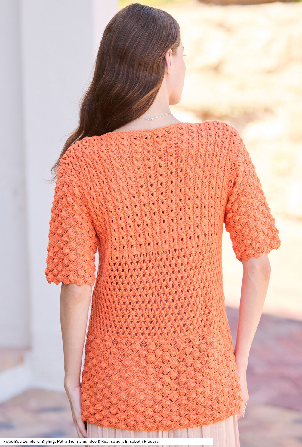Langeweile kann beim Stricken dieses weit geschnittenen Pullis nicht aufkommen. Die Abwechselung entsteht durch vier Muster: Blasen-, Gitter- und Zopfmuster, dazwischen glatt rechts. Er zieht mit seinem strahlenden Farbton die Blicke auf sich, doch auch in jeder anderen Farbe sieht das Modell gut aus. Dank Ärmel, die bis zum Ellenbogen reichen, und einem etwas längeren Schnitt zaubert er zudem eine tolle Figur. Der Halsausschnitt wird mit Krebsmaschen umhäkelt. Das Baumwollgarn (mit etwas Polyester) läuft flott über die Nadeln. Eine Anleitung gibts für die Größen 36/38, 40/42 und 44/46.