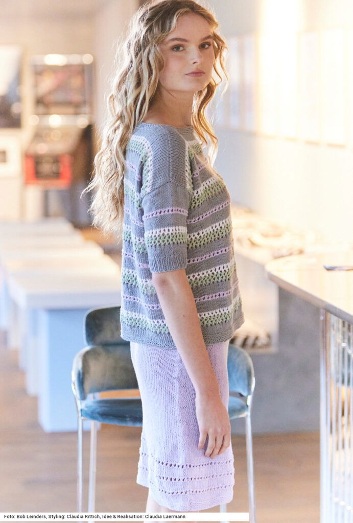 Dieses Duo, bestehend aus Rock und Kurzarm-Pulli, kann solo oder als Kombination getragen werden. Der Pulli beeindruckt nicht nur mit seinen hübschen Loch- und Netzmusterreihen, unterbrochen von glatt rechts, sondern auch mit seinem dezenten Farbenspiel. Beim knielangen Rock kommt nur eine Farbe zum Einsatz. Vorder- und Rückenteil sind einfach zwei Rechtecke, dadurch ergibt sich ein breiter U-Boot-Ausschnitt, der in den letzten Reihen mit kraus rechten Maschen betont wird. Wir haben ein leicht über die Nadeln laufendes Garn aus Baumwolle und Viskose dazu gewählt. Eine Anleitung gibt es für die Größen 36/38, 40/42 und 44/46.