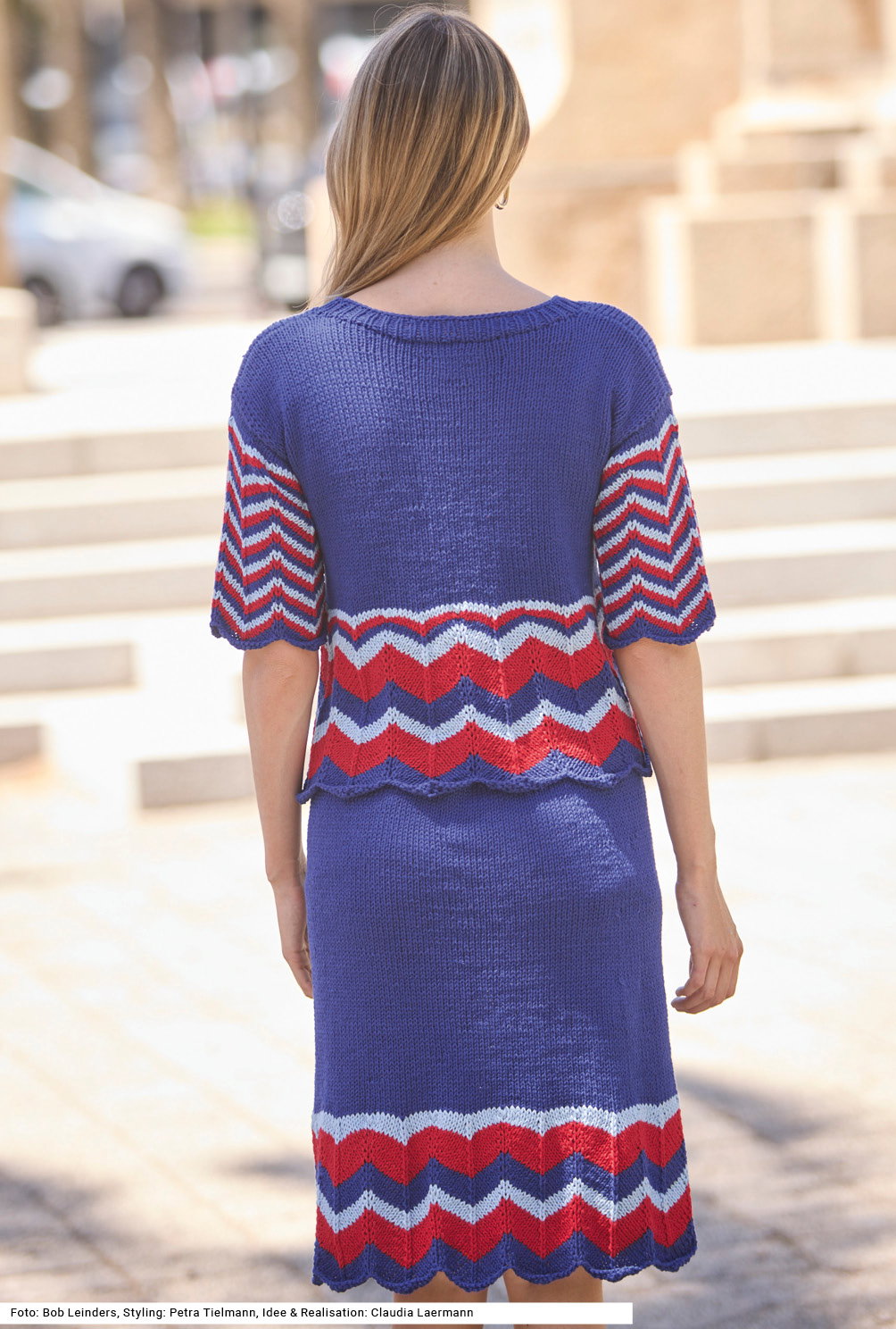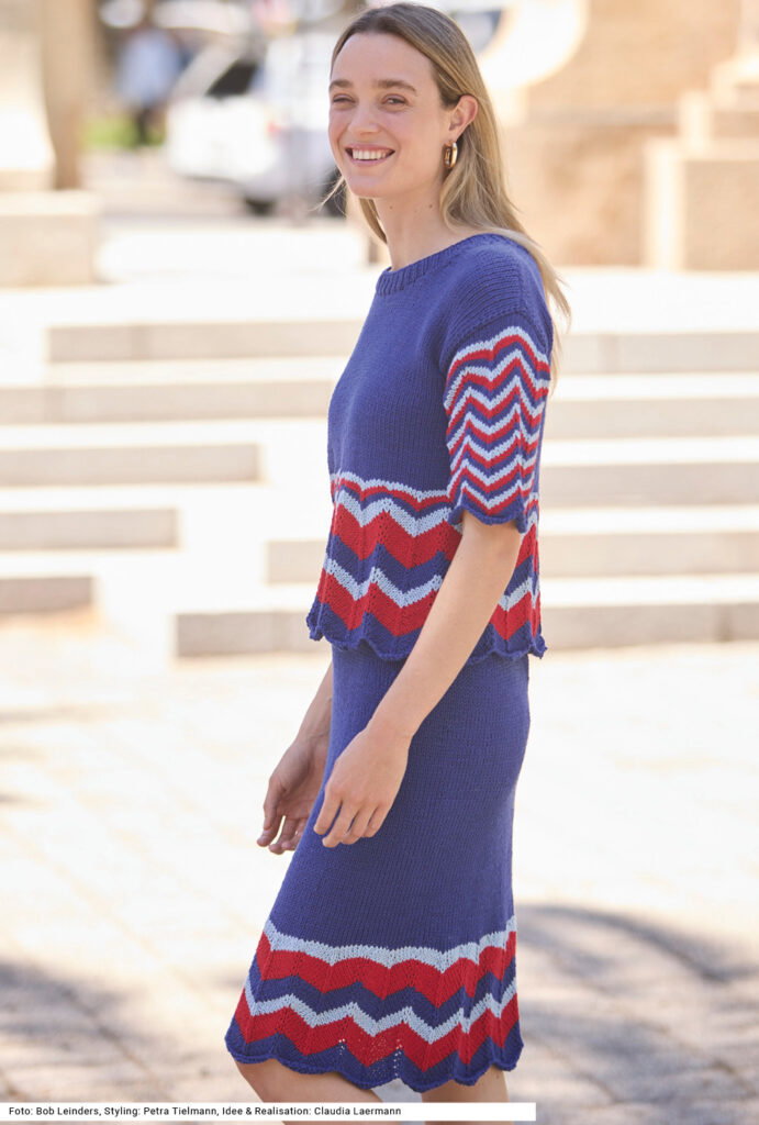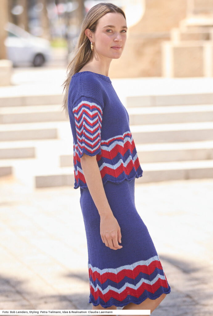 Dieses Duo begeistert mit seinem sportlich-grafischen Look. Der locker geschnittene Pulli mit kurzen Ärmeln und der bis zu den Knien reichende Rock sind beide mit einem einfach zu strickenden Zackenmuster ausgestattet, das wunderbar plastisch wirkt – bei den Ärmeln gleichmäßig schmal, an Rock und Pulli in unterschiedlicher Breite. Die Ausschnittblende ist im Rippenmuster gehalten. Gearbeitet wird mit einem sehr weichen dünnen Baumwollgarn, das jedoch doppelt verstrickt wird. Der Rock wird rund gestrickt, Vorder- und Rückenteil bis zu den Armausschnitten ebenfalls. Eine Anleitung gibts für die Größen 34/36, 40/42 und 46/48.