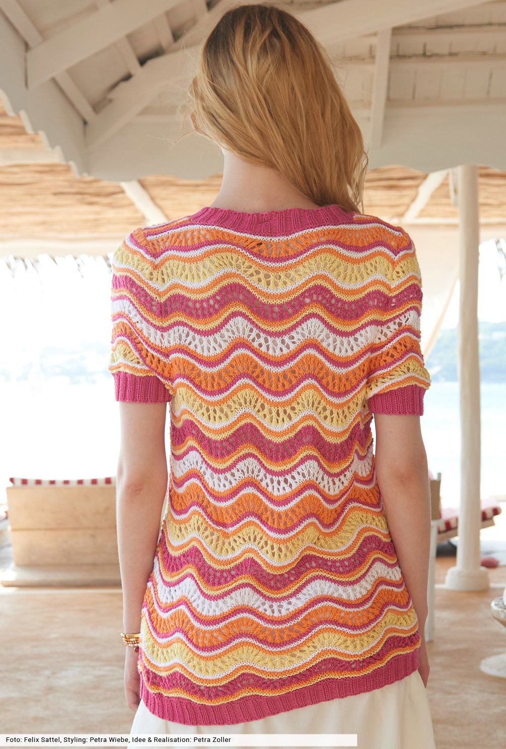Legt die vier strahlenden Sonnenfarben in Wellen und ist mit Hilfe unserer Beschreibung ganz einfach nachzuarbeiten: das traditionelle Pfauenmuster. Du musst nur darauf achten, dass sich Umschläge mit zusammengestrickten Maschen ausgleichen. Elastische Rippenbündchen bilden das Finish für dieses kurzärmelige Gute-Laune-Shirt, dessen Baumwollgarn mit Sojafasern angereichert ist – ein echtes Statement für Nachhaltigkeit und höchsten Tragekomfort.