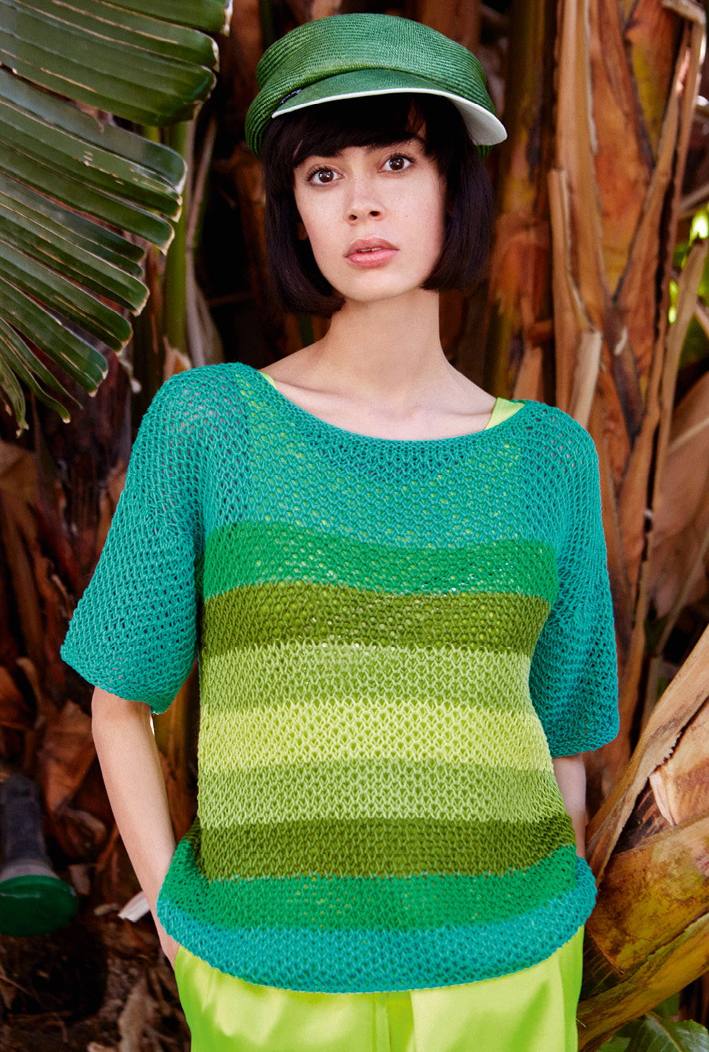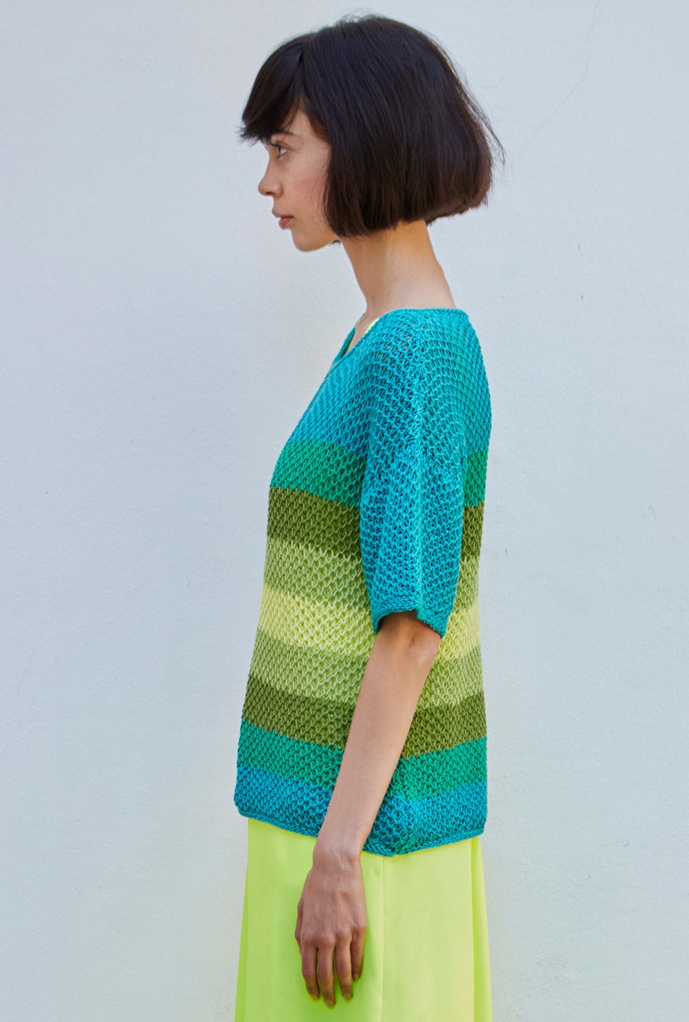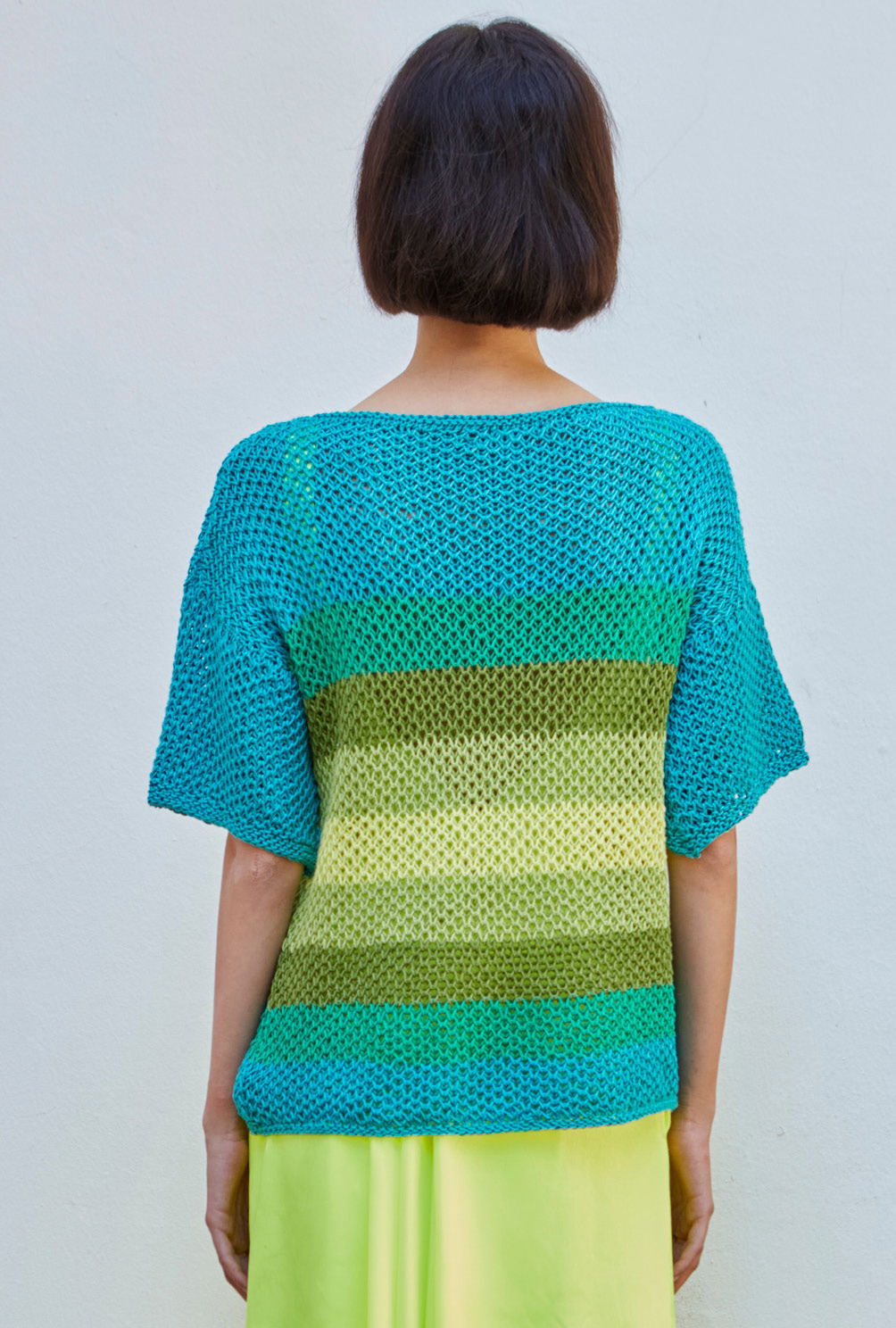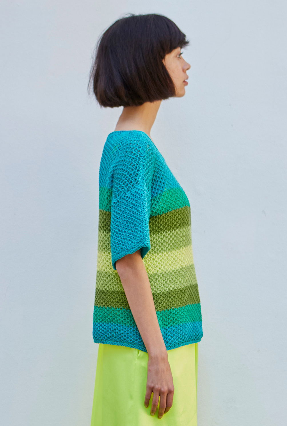 Von Maigrün über Gras bis hin zu Petrol reichen die Farbabstufungen, die dieser hübsche Halbarm-Pulli zu bieten hat. Das Netzmuster aus tiefgestochenen Maschen bringt zusätzlich Bewegung und luftige Frische. Das Muster benötigt schon etwas Aufmerksamkeit, ist jedoch in der Anleitung ganz genau Reihe für Reihe beschrieben. Gestrickt wird das Shirt erst einmal in einzelnen Teilen, wobei die schmalen kraus rechts gestrickten Blenden einen schönen Rahmen für das Netzmuster bilden. Für die kurzen Ärmel werden dann zuerst die Schulternähte geschlossen und die Ärmel direkt von oben nach unten angestrickt. Danach nur noch die restlichen Nähte schließen und auch den Halsausschnitt mit einer schmalen, kraus rechts gestrickten Blende versehen.