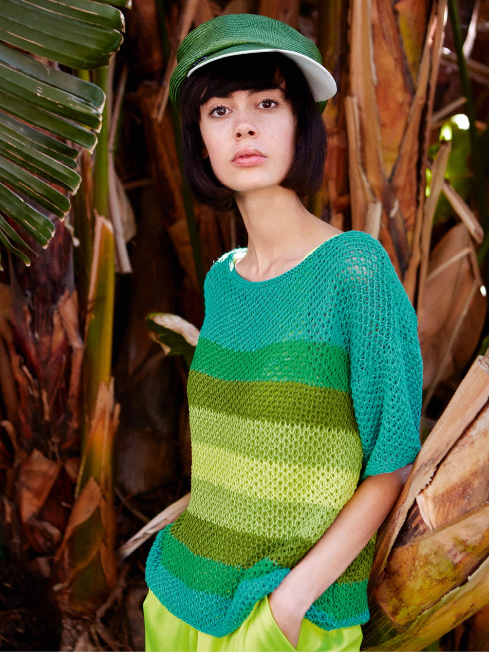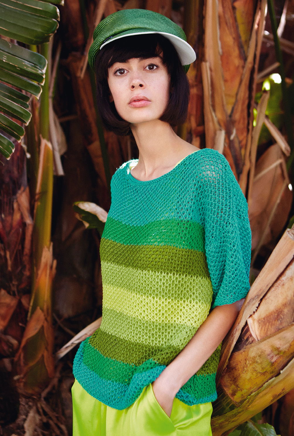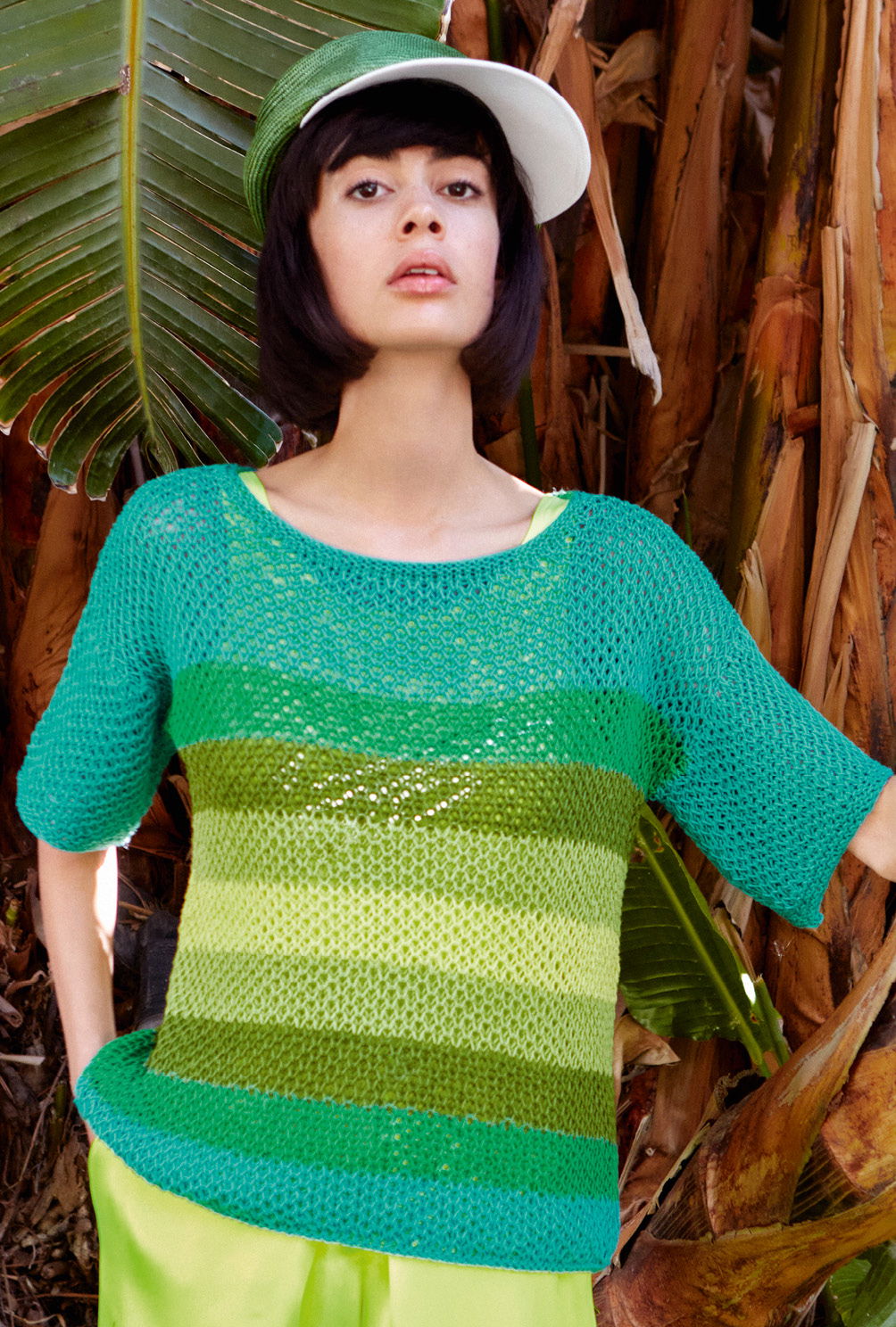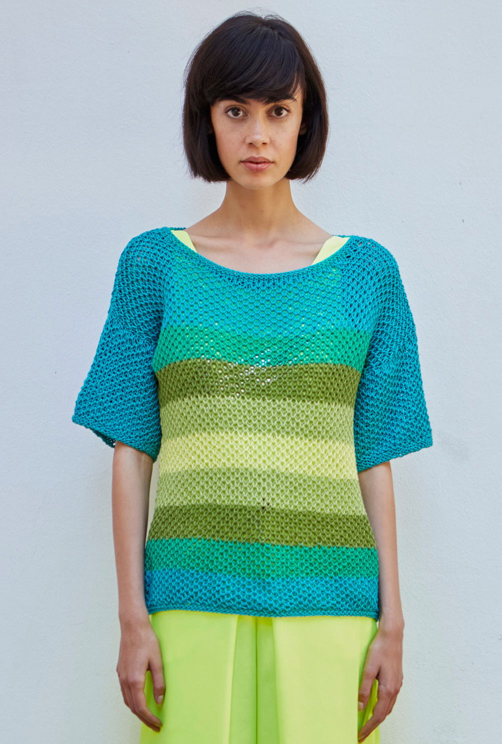 Von Maigrün über Gras bis hin zu Petrol reichen die Farbabstufungen, die dieser hübsche Halbarm-Pulli zu bieten hat. Das Netzmuster aus tiefgestochenen Maschen bringt zusätzlich Bewegung und luftige Frische. Das Muster benötigt schon etwas Aufmerksamkeit, ist jedoch in der Anleitung ganz genau Reihe für Reihe beschrieben. Gestrickt wird das Shirt erst einmal in einzelnen Teilen, wobei die schmalen kraus rechts gestrickten Blenden einen schönen Rahmen für das Netzmuster bilden. Für die kurzen Ärmel werden dann zuerst die Schulternähte geschlossen und die Ärmel direkt von oben nach unten angestrickt. Danach nur noch die restlichen Nähte schließen und auch den Halsausschnitt mit einer schmalen, kraus rechts gestrickten Blende versehen.