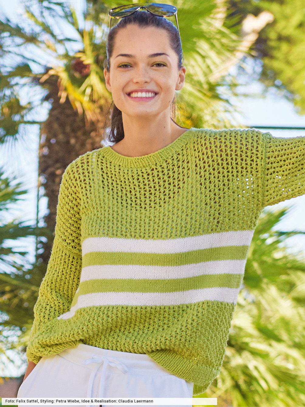 Dieser Pulli übersteht mühelos den Spagat zwischen Alltag und Freizeit, da er sich durch seine unkomplizierte Form jeder Situation bestens anpasst. Sein weiches Garn setzt sich fifty-fifty aus Baumwolle und Schurwolle zusammen – eine tolle Material-Kombination, die durch transparente Netzstrukturen viel Luft an die Haut lässt. Dazwischen fungiert die Streifenpasse in Grün und Weiß als Eyecatcher und macht Lust auf die neue Stricksaison.
