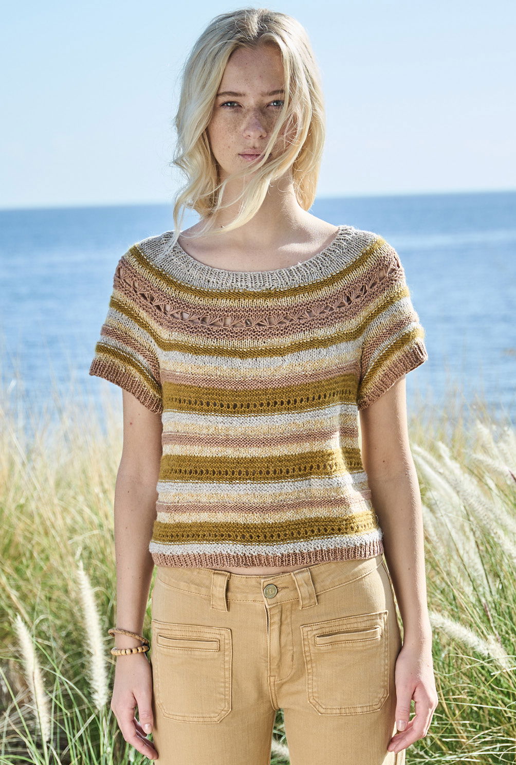 Top-Down-Pullis sind in diesem Frühjahr äußerst beliebt, da man sich das lästige Zusammennähten der Nähte sparen kann. Bei diesem Shirt beginnst Du am Halsausschnitt und erweiterst die Rundpasse durch gleichmäßige Zunahmen innerhalb des fantasievollen Streifenspiels in Curry- und Beigetönen. Danach strickst du das Vorder- und Rückenteil in Runden weiter und beendest die Arbeit mit den Ärmeln. Die letzte Aktion besteht aus dem Auffassen der Maschen für die Halsblende, die im elastischen Rippenmuster ausgeführt wird.