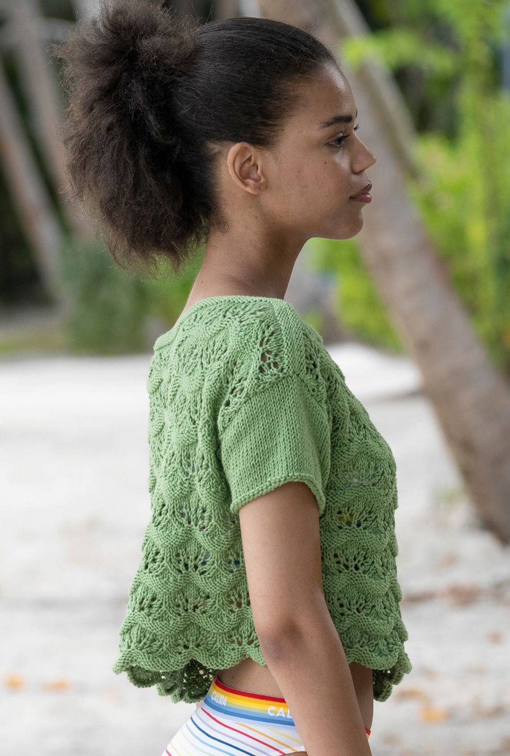 Das apfelgrüne Strickshirt ist durch seine taillenkurze Form zu Bikinis, aber auch zu Röcken oder Hosen eine wunderbare Bereicherung Deiner Sommergarderobe und passt sich jedem Stil wunderbar an. Es entsteht aus organischer Baumwolle, die eine sehr griffige Haptik aufweist und dadurch das Wellenmuster in fast dreidimensionalen Linien zur Geltung bringt. Die kurzen Ärmel präsentieren sich – sozusagen zum Ausruhen – in ruhiger Glatt-rechts-Optik.
