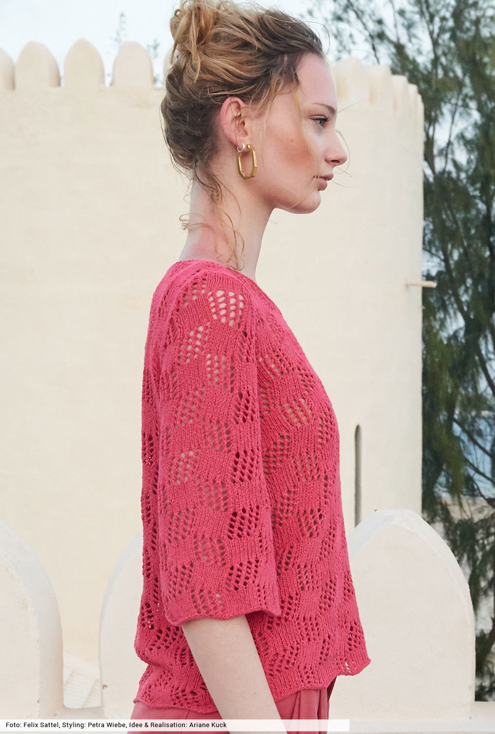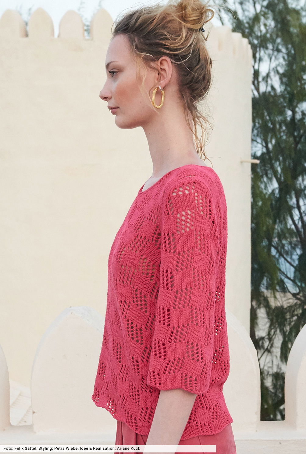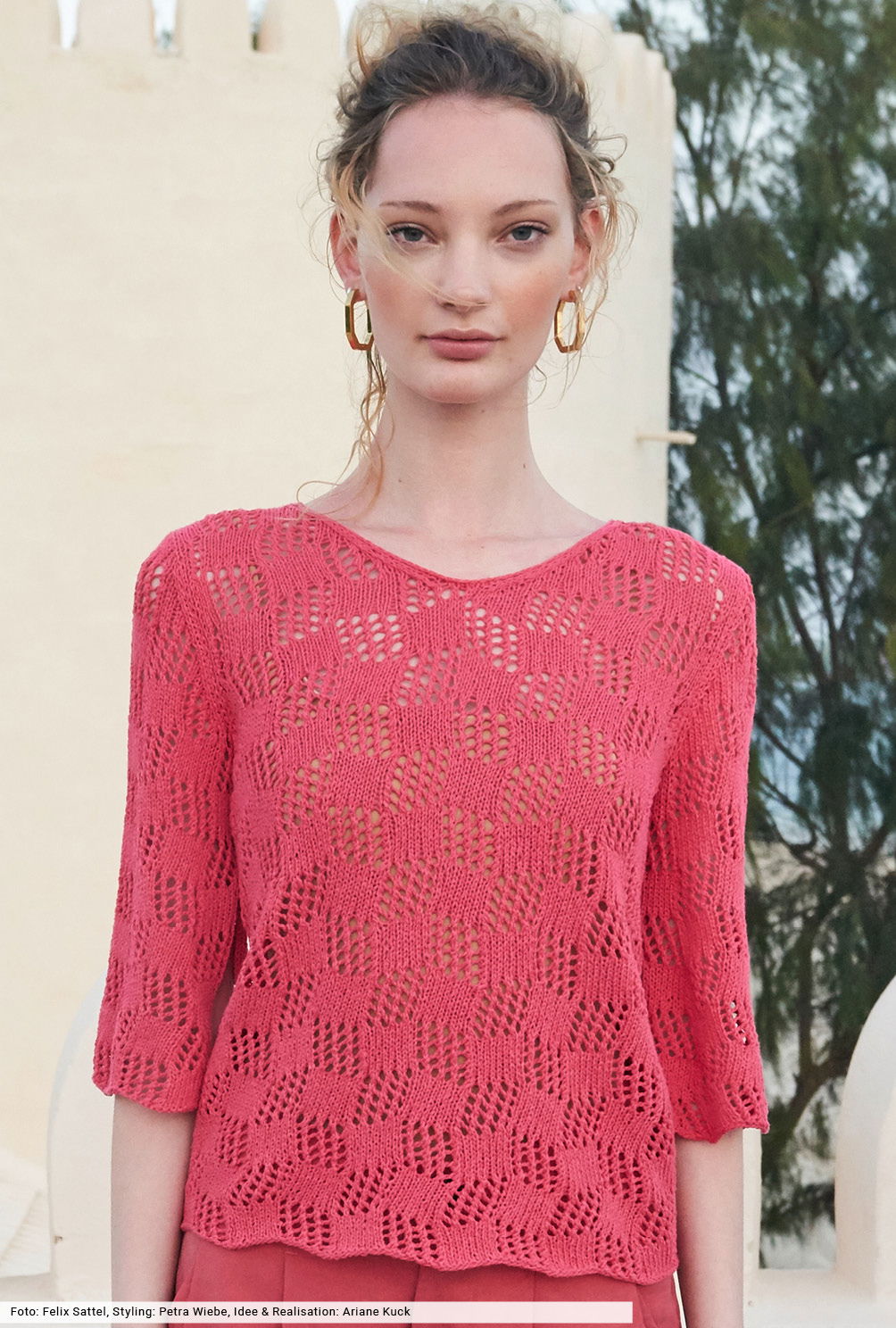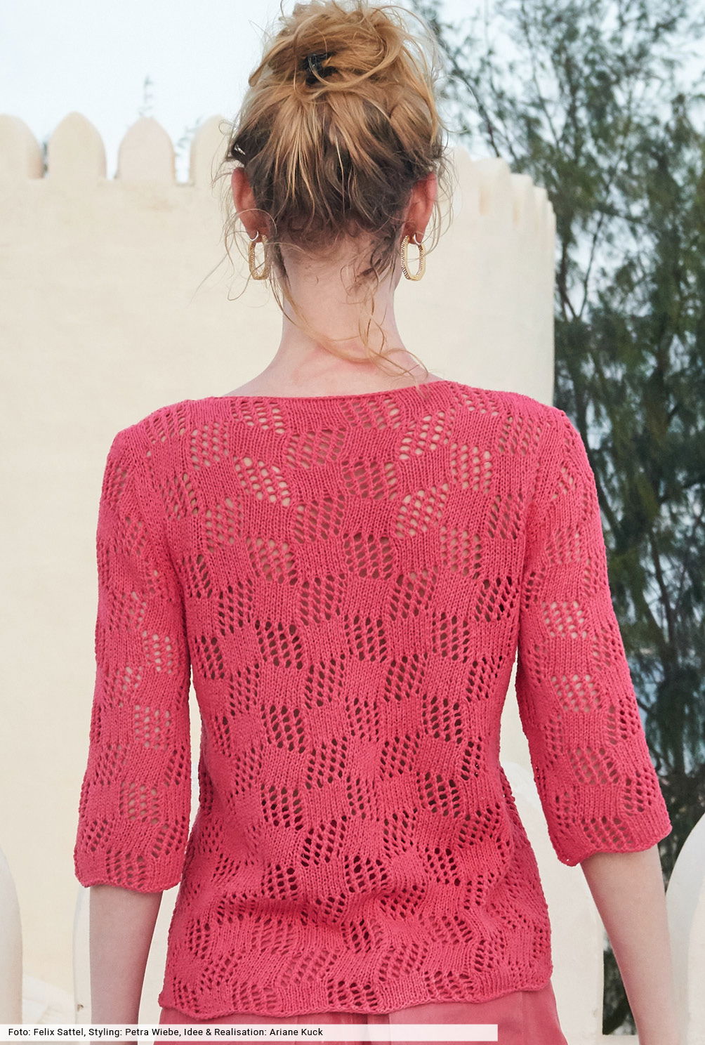 Für das hübsche Ajourmuster dieses Pullis finden Sie in unserer Anleitung eine genaue Beschreibung, die Ihnen die Arbeit erleichtern wird. Natürlich in Koralle aus einem edlen Baumwoll-Viskosegarn, mit dem die Maschen leicht von der Nadel gleiten. Dann nur noch die vier Teile zusammenähen und sowohl dem V-Ausschnitt als auch den Schlitzrändern eine schmale Blende verpassen – fertig ist ein toller Begleichter für den Sommer.