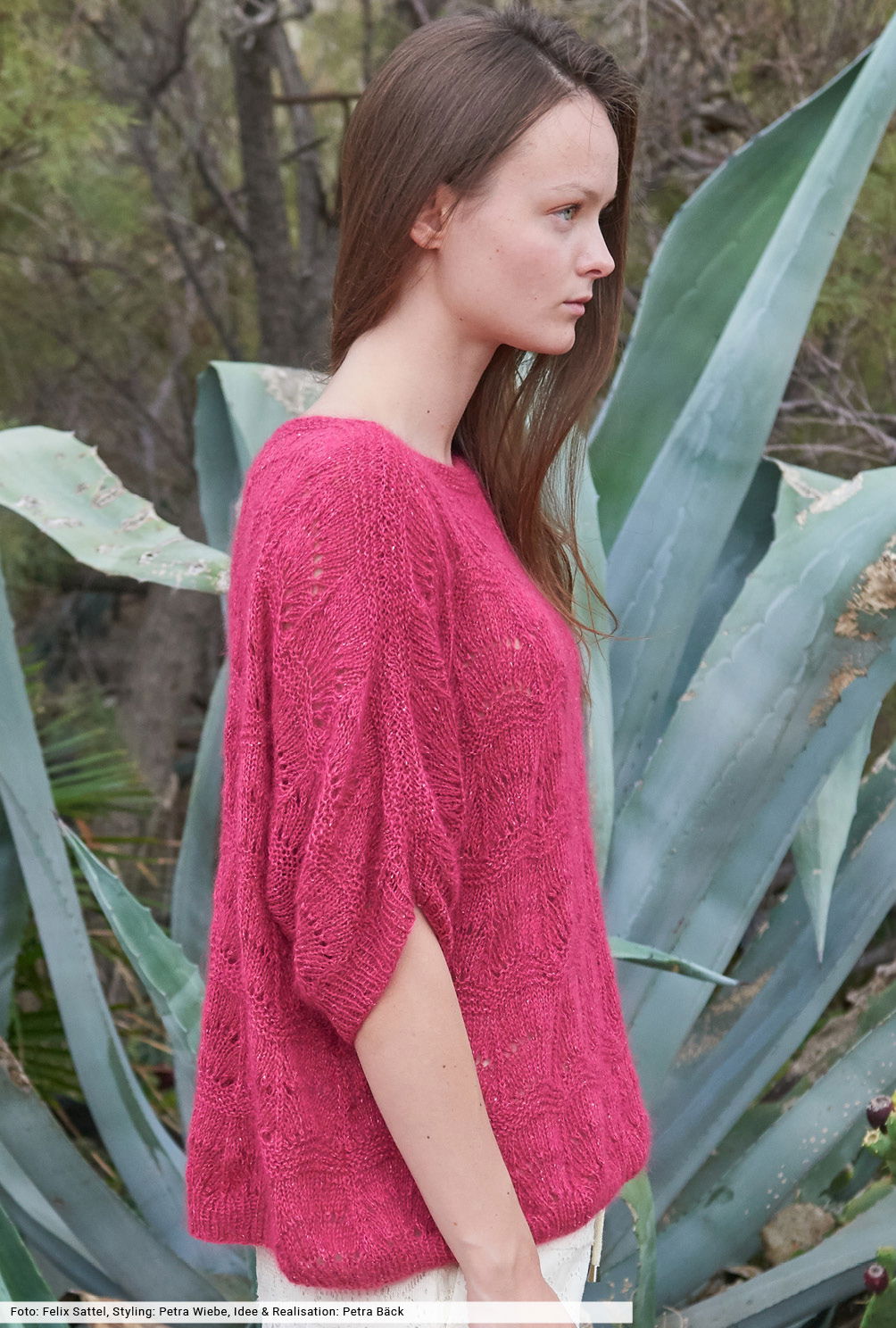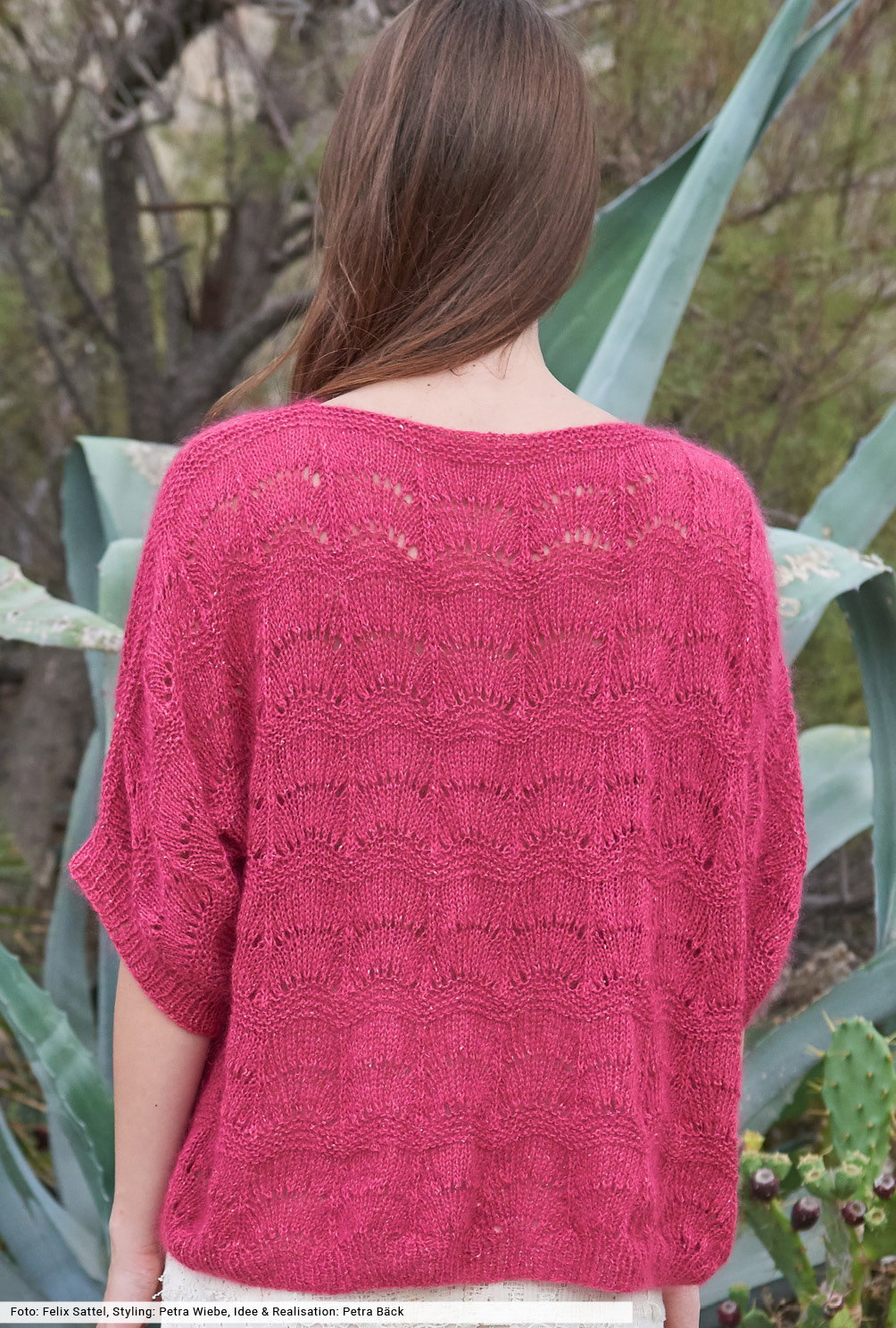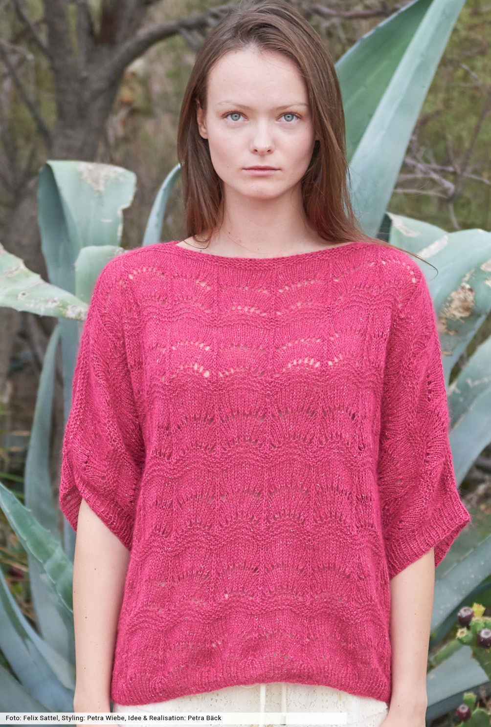 Feine Fasern aus Mohair und Seide sind die Protagonisten dieses zauberhaften Pullis, bei dem wir die geraden Ärmel gleich mit angestrickt haben. Das hübsche Wellenmuster kommt allover zum Einsatz und wird mit schmalen Kraus-rechts-Streifen kombiniert – ein toller Effekt, der für Dreidimensionalität sorgt. Die übersichtliche Strickschrift bei der Anleitung dient dir als Orientierungshilfe. Tipp: Fertige eine kleine Maschenprobe an, dann geht die Arbeit umso schneller von der Nadel.