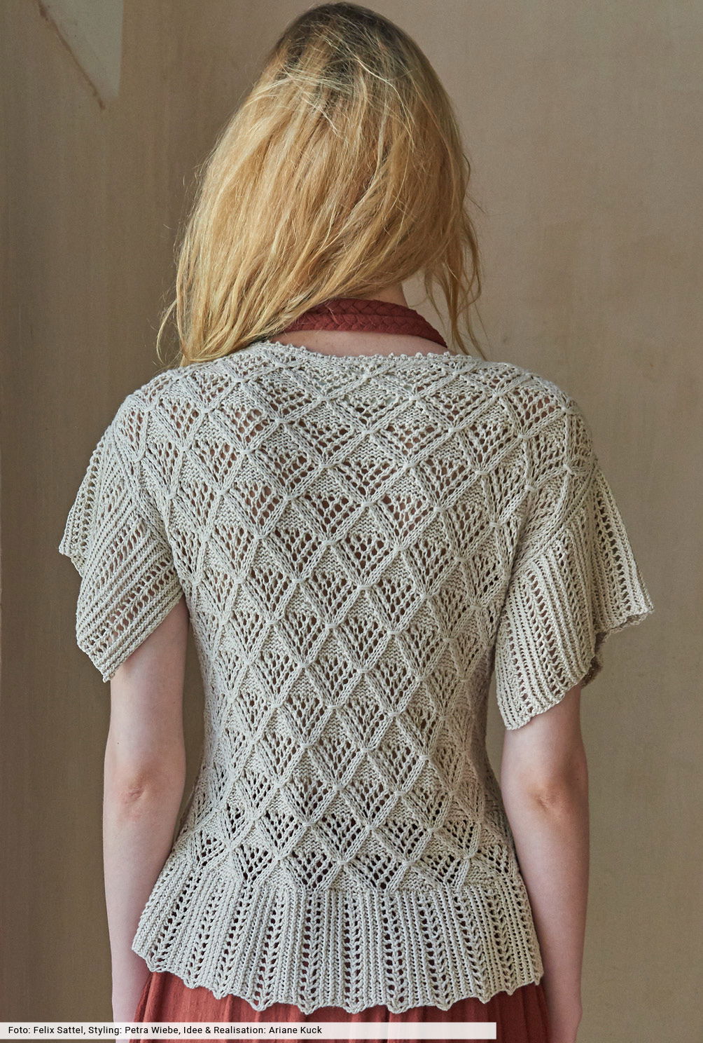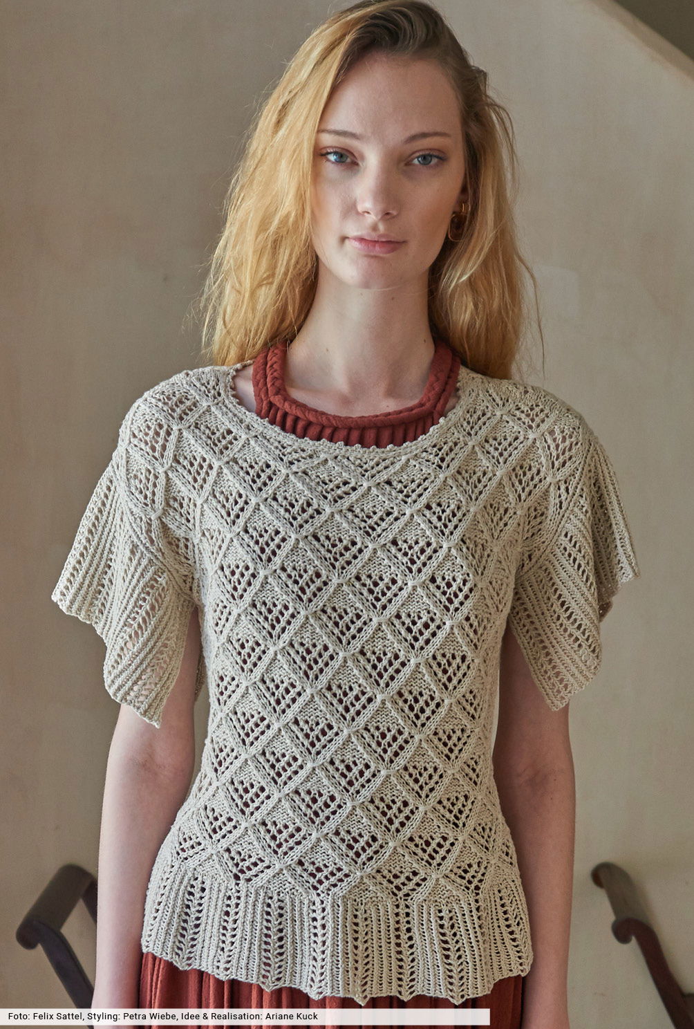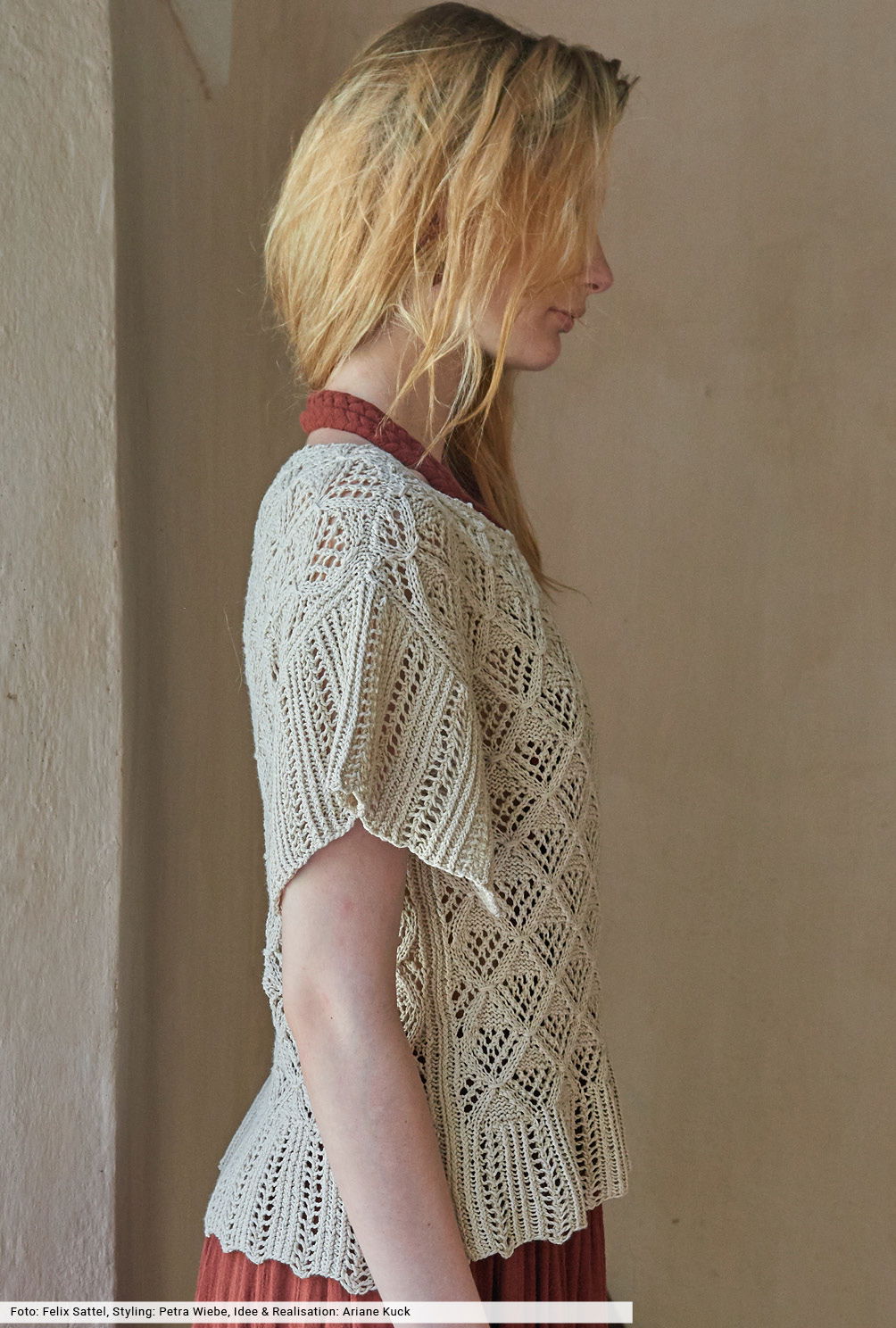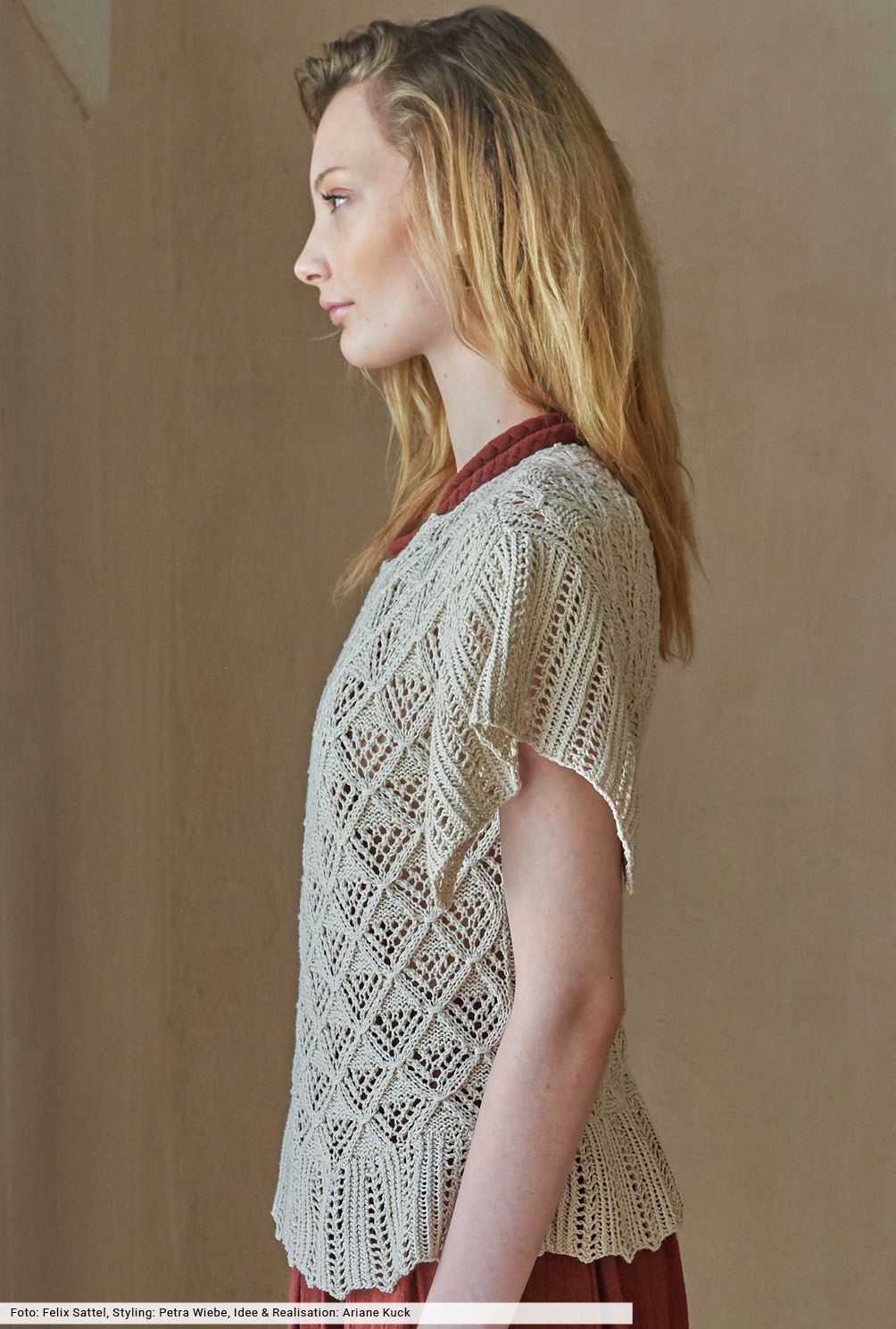 So ein sandfarbener Pulli passt sich jedem Style bestens an und begleitet dich länger als eine Saison. Gestrickt aus edlem Baumwoll-Leinengarn lässt es die Muster toll zur Geltung kommen – sowohl das Rautenmuster für den Korpus, als auch das Rippen-Ajourmuster für die Blenden. Schönes Detail: Die Maschen für die Ärmel werden direkt aus den Armausschnitten aufgefasst, die Nähte werden zum Schluss nicht zusammengenäht, sondern bleiben offen.
