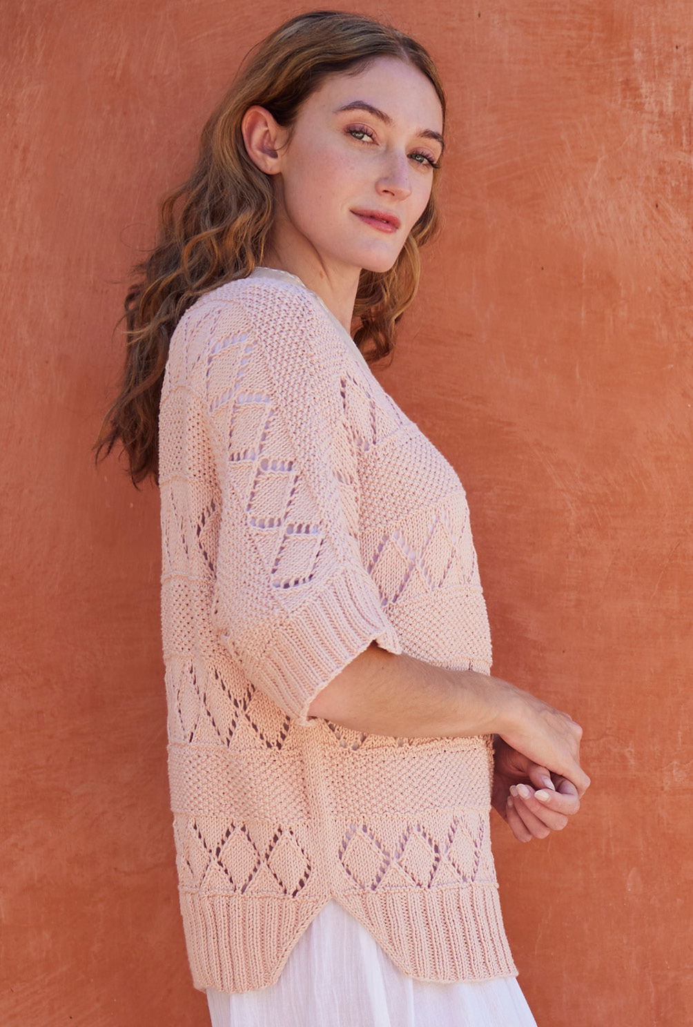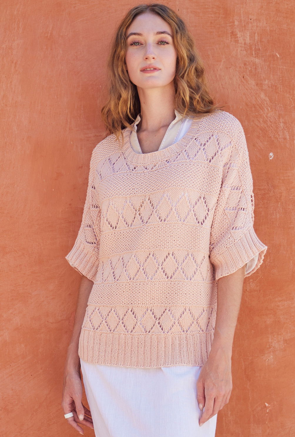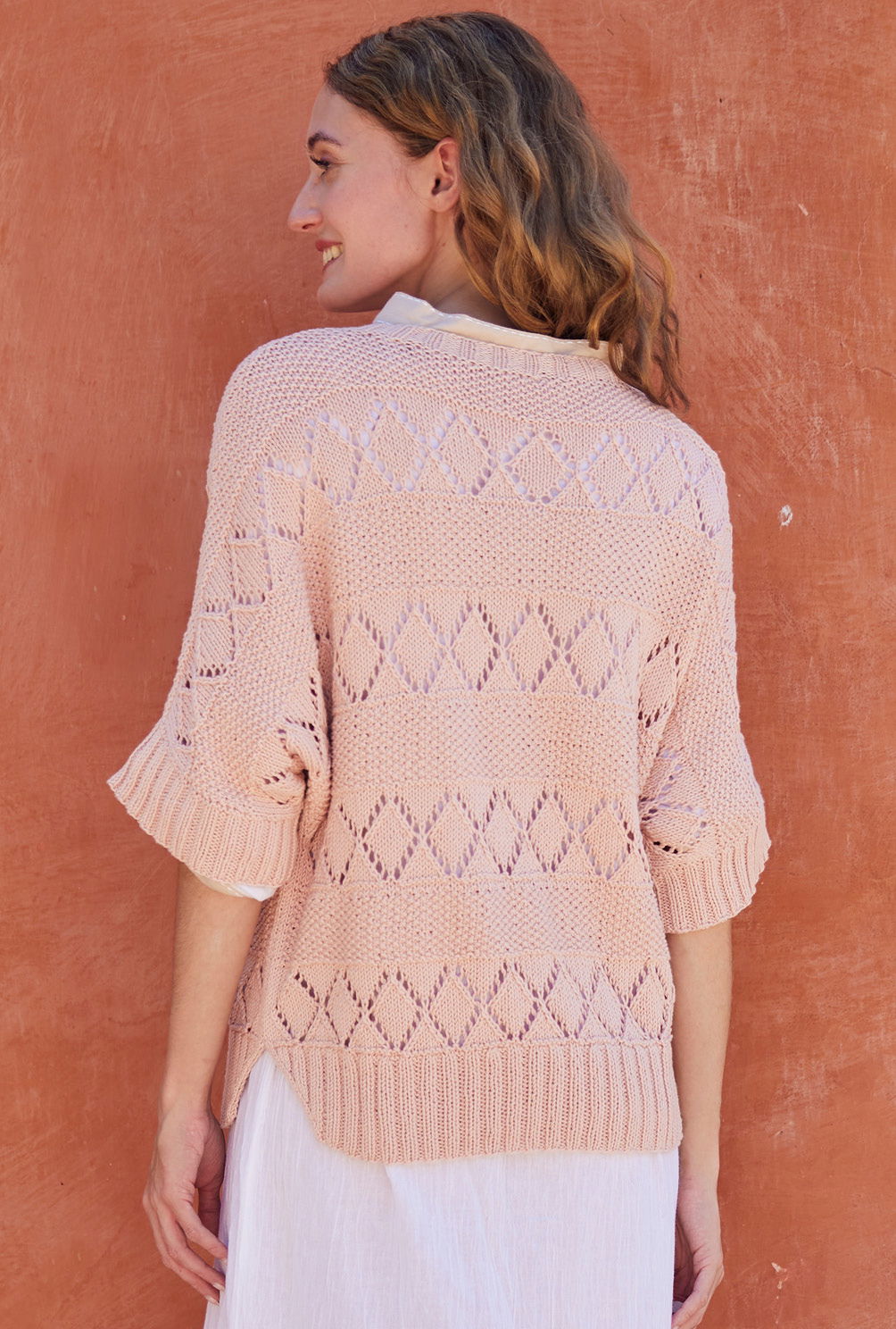 Der pudrige Roséton dieses Strickshirts schmeichelt jeder Frau und gibt jedem Outfit das gewisse Etwas. Zusätzlich das Thema Nachhaltigkeit durch die weiche Bio-Baumwolle abgedeckt. Die einfachen Muster aus Perlstrukturen und Lochrauten kommen im regelmäßigen Streifenspiel zum Einsatz, so dass der aparte Kurzarmpulli Stück für Stück ganz schnell wachsen kann. Für den lässigen Fledermausschnitt sind seitliche Zunahmen verantwortlich, die Abnahmen für die hohen Schulterschrägungen geben die perfekte Passform.