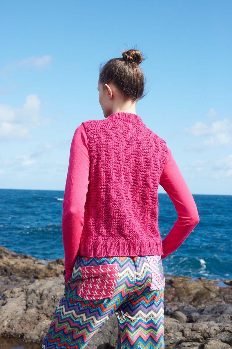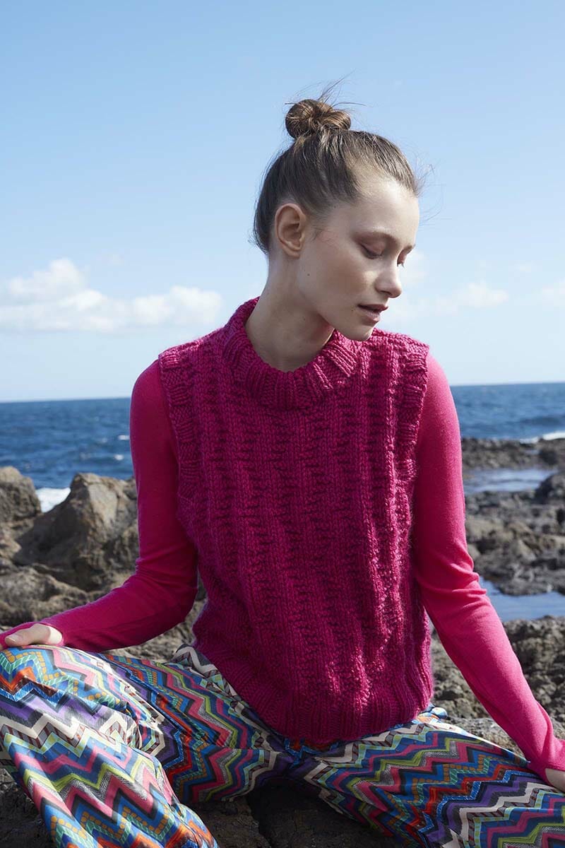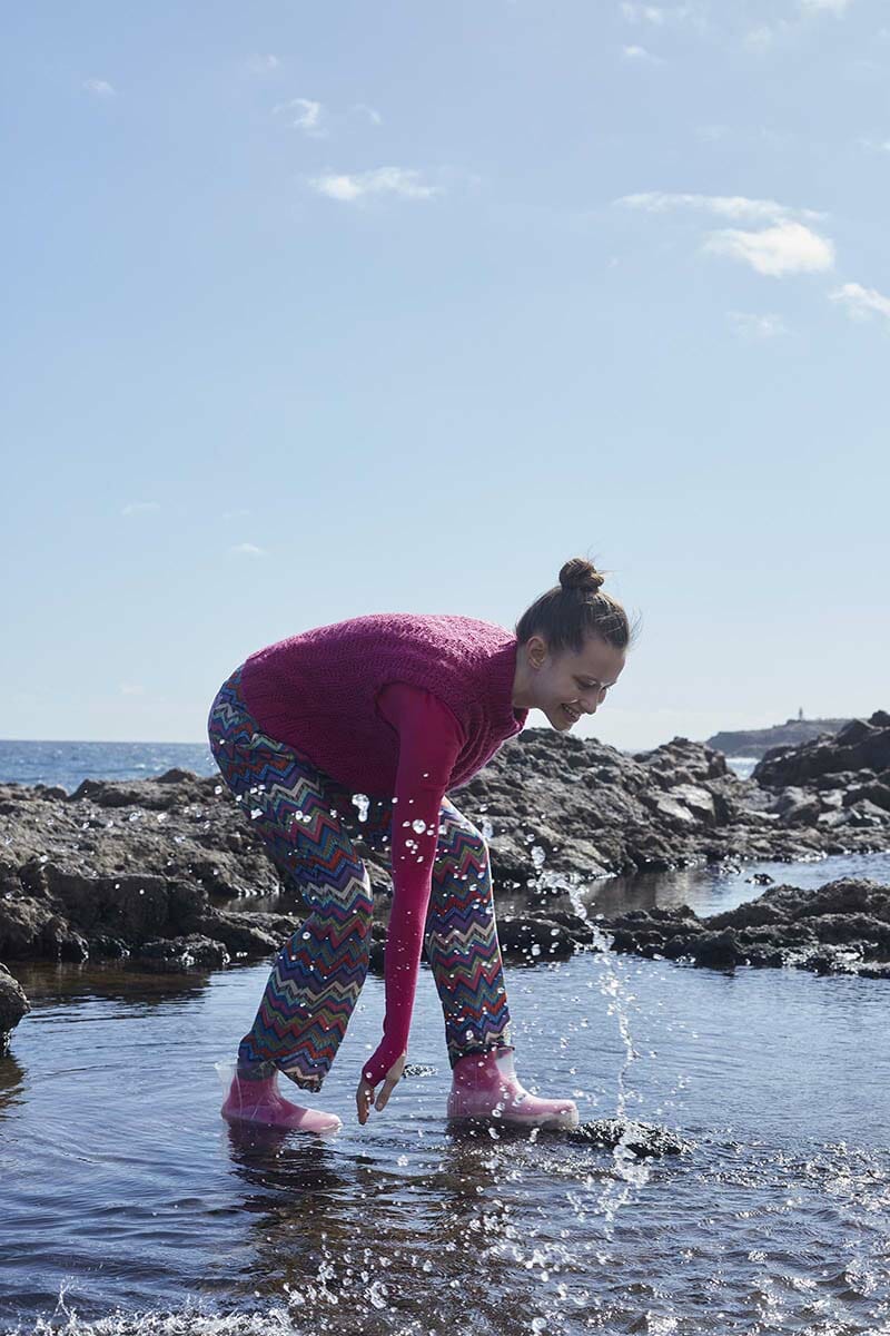 At first glance they look like knitted cables, yet they are not. They are beautiful, vertical waves on display. In this photo, Galina seems to become one with the sea. It is a beautiful picture of a streamlined slipover.