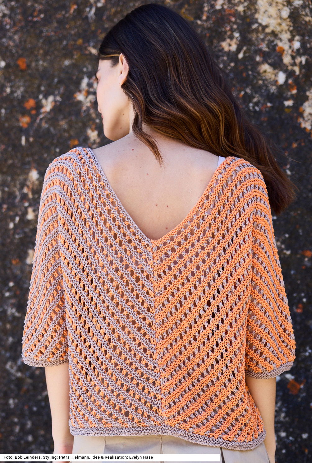 Raffiniert gearbeitet ist dieses locker gestrickte Shirt: Da es seitengleich gestrickt wird, hast du die Wahl, welche Nuance rechts bzw. links getragen werden soll. Begonnen werden beide Pullihälften am Halsausschnitt, dann geht es diagonal weiter – beidseitig zugenommene Maschen ergeben die nötige Weite. Zusätzliche Dynamik kommt durch die wechselnden Farbenfolgen dazu. Das Netzmuster an sich ist ganz einfach. Durch den diagonalen Schnitt gibt es sowohl vorne als auch im Rücken einen V-Ausschnitt. Die Anleitung dazu gibt es für die Größe 38 – 42.
