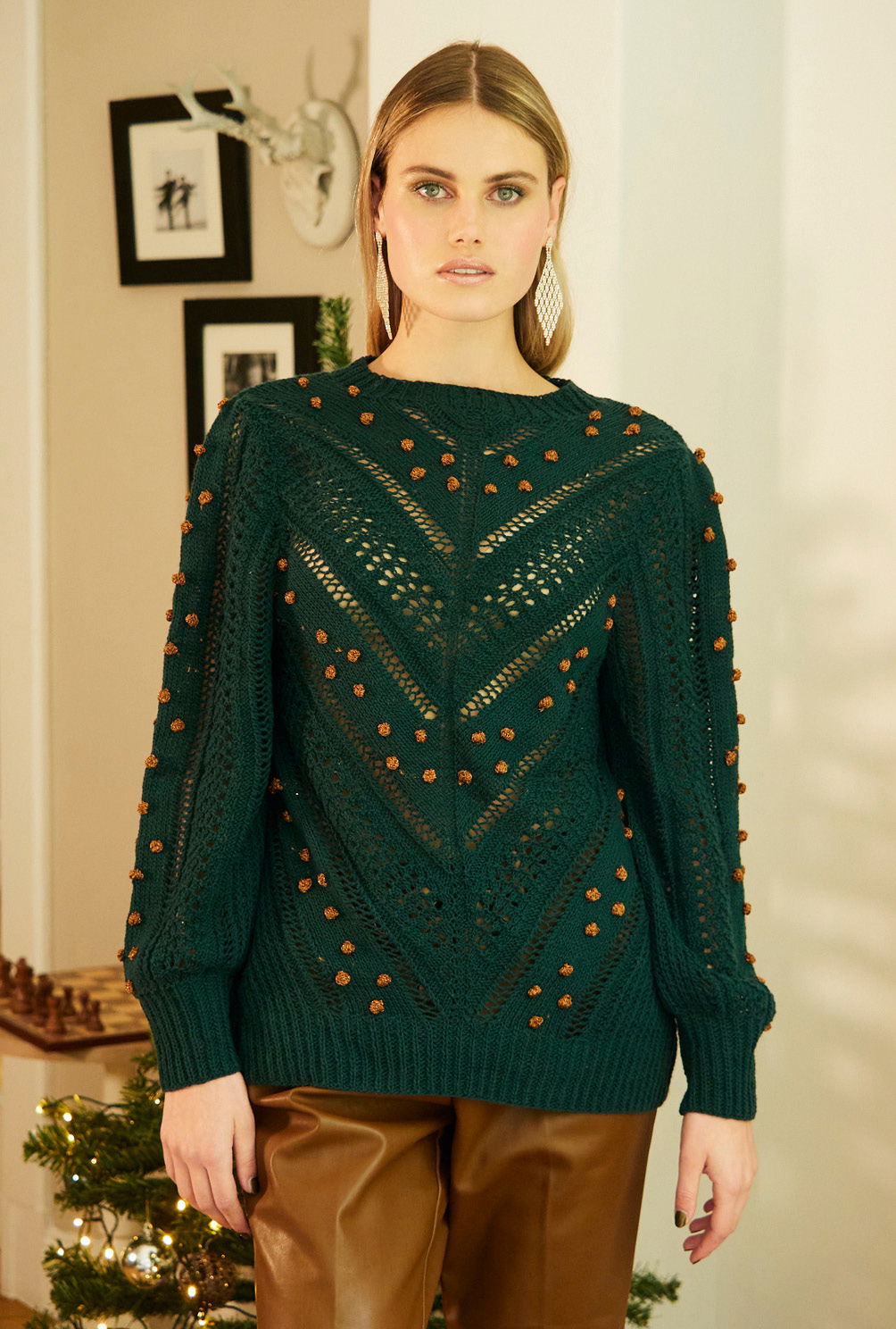 Ein Leckerbissen für alle StrickerInnen, denen Langeweile beim Stricken ein Gräuel ist. Dieser Mustermix-Pulli in Dunkelgrün überzeugt durch seine Vielfalt. Das Rückenteil ist schlicht im Halbpatent gearbeitet, das Vorderteil im Mustermix aus einfachen Mustern – wie glatt rechts und links, Loch- und Wellenmuster –, die kombiniert echt raffiniert wirken. Der diagonale Versatz entstehtdurch Zunahmen in der Mitte und Abnahmen am Rand. Zum Schluss werden bronzefarbene glitzernde Lurex-Noppen aufgehäkelt. Die Anleitung dafür steht in den Größen 36/38 und 40/42 sowie 44/46 bereit.