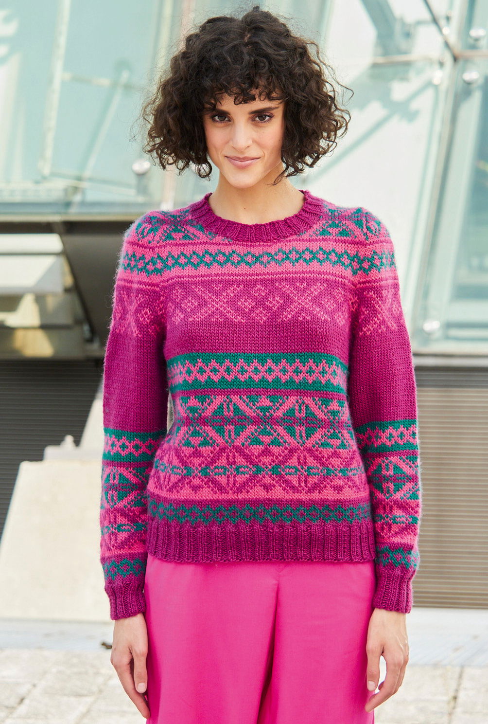 Sabrina Strickjournal Jaquardpullover in Fuchsia und Dunkelgrün