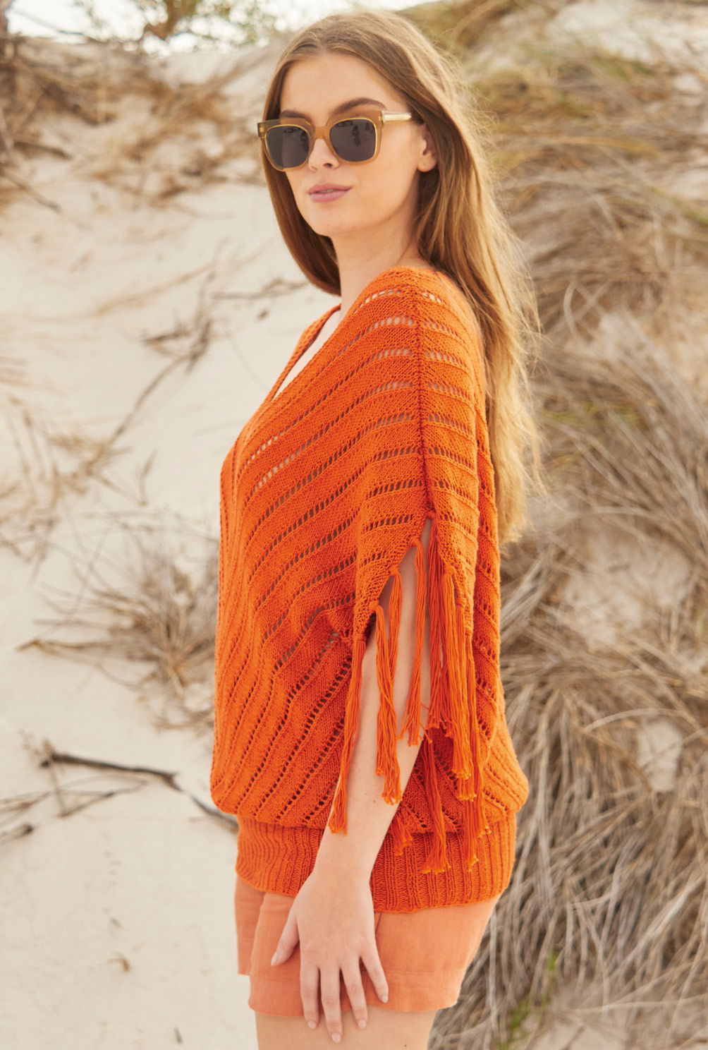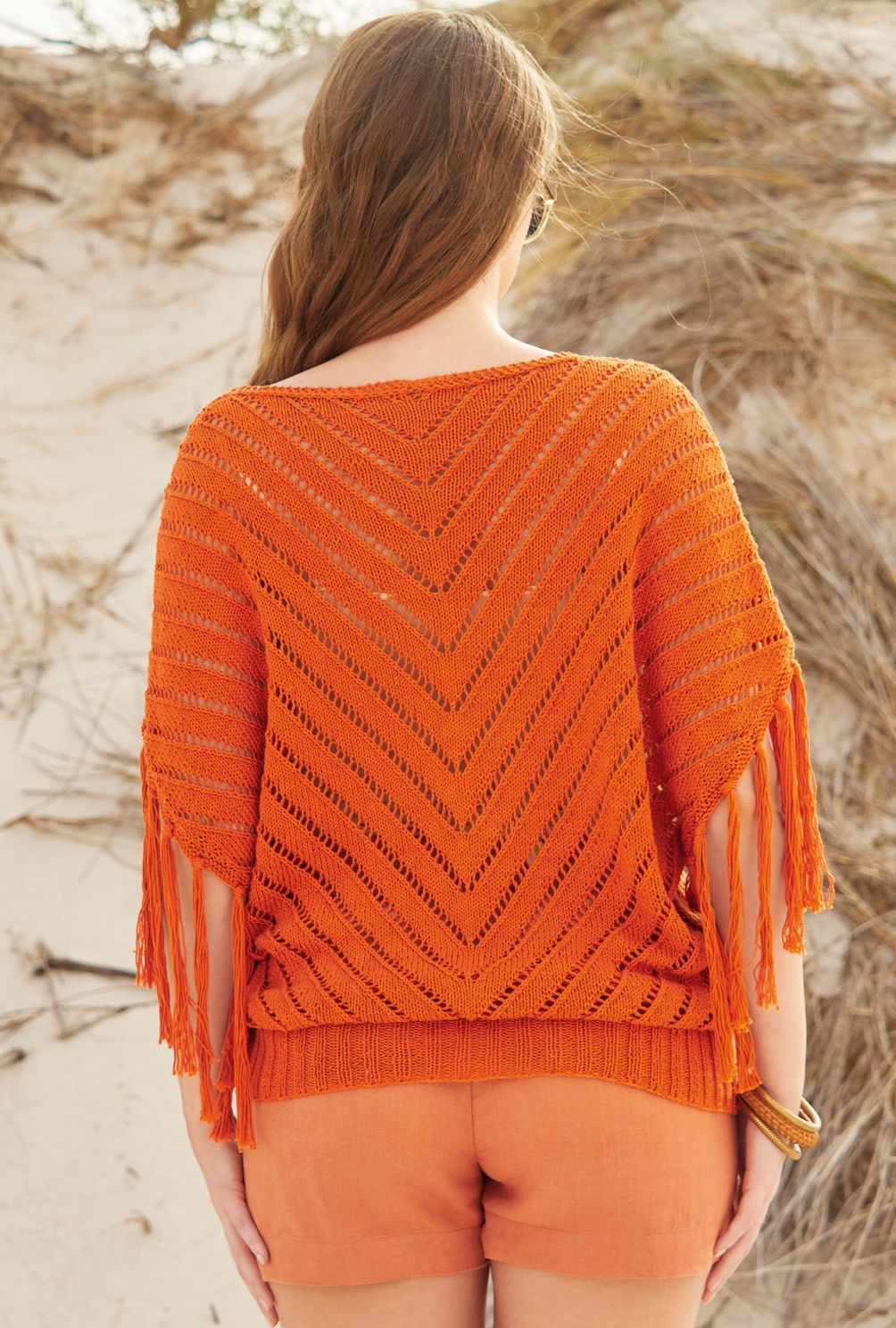 Der weite terracottafarbene Baumwoll-Pulli mit V-förmigem Lochmuster engt dank des Oversize-Schnitts nicht ein und lässt sich hervorragend über Bikini & Co. tragen. Die Details machen den Look: Hier sind es die Fransen an den Armausschnitten. Durch die raffinierte Strickweise des Lochmusters und die beidseitig Zunahmen ergibt sich die Fledermausform und die überschnittenen Schultern; dadurch entsteht auch der V-Ausschnitt. Die gleich mitgestrickte Blende in kraus rechts setzt sich über den rückwärtigen Halsausschnitt fort. Der hohe Bund ist im 2/2-Rippenmuster gearbeitet. Eine Anleitung steht in den Größen 36 – 40, 42 – 46 und 48 – 52 zur Verfügung.