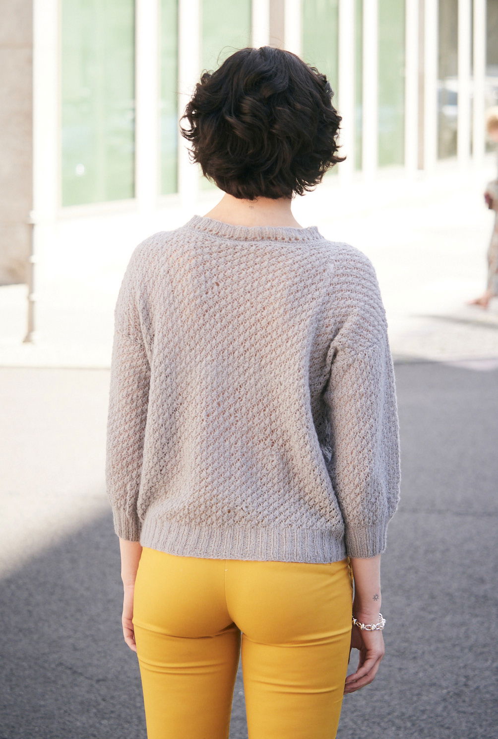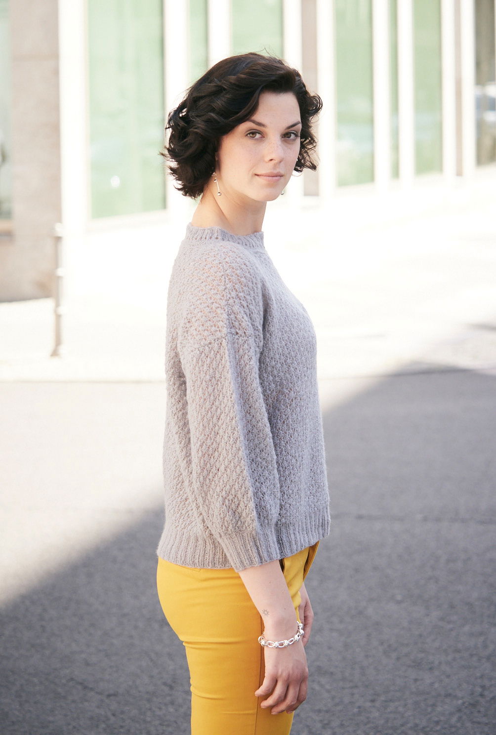 Dieser silbergraue Pulli mit taillenkurzer Form und die dreiviertellangen Ärmeln hat das modische Etwas, das gerade sehr angesagt ist. Unspektakulär ist das leicht zu erlernende Persianermuster, das das Top, oder was immer du darunter trägst, durchblitzen lässt. Die gerade eingesetzten Ärmel bekommen nach dem Rippenbund durch starke Zunahme an Maschen ihre plusterige Form. Hübsches Detail an der Ausschnittblende sind die dreierlei Muster: kraus rechts, Lochmuster und Rippen. Das weiche Schurwolle-Baumwolle-Kaschmir-Mischgarn ist schon beim Stricken eine Wohltat. Eine Anleitung gibt es in den Größen 38/40 und 42/44 sowie 46/48.