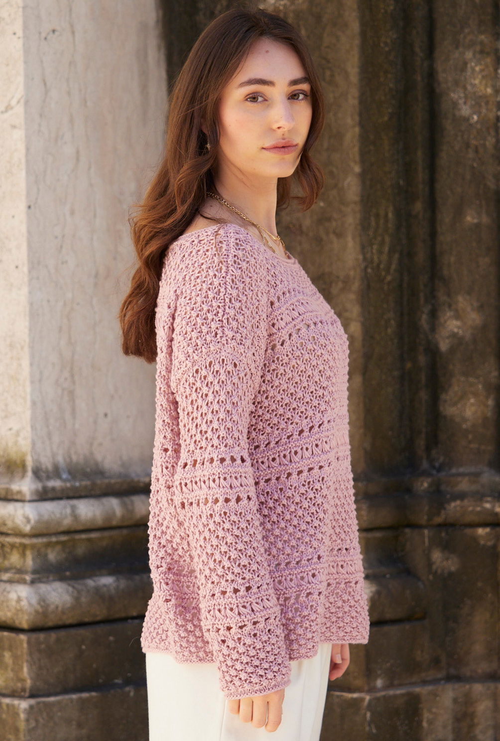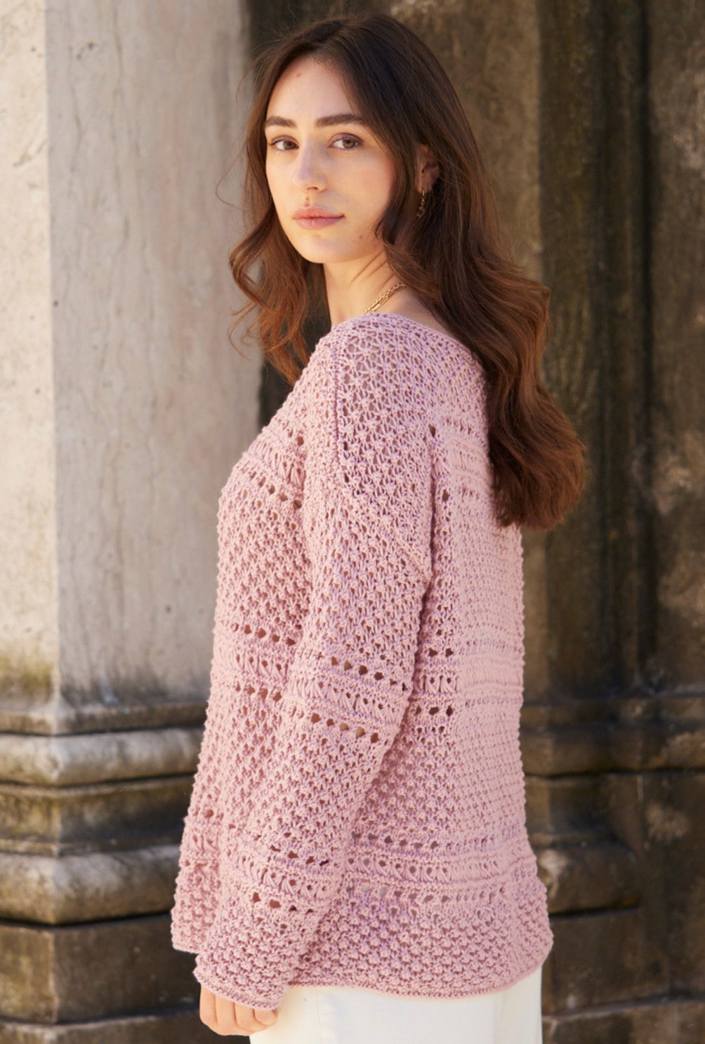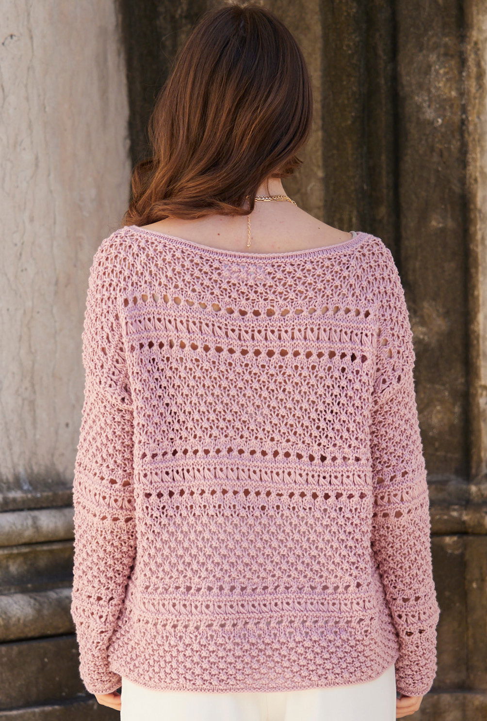 Der Oversize-Pulli in lichtem Rosa sorgt dank der breiten Streifen im Persianermuster (auch Dornröschenmuster genannt) und der unterschiedlich breiten Lochmusterstreifen für ein spannendes Strickbild. Dadurch, dass er etwas weiter geschnitten ist und locker fällt, passt er perfekt zu schmalen Hosen oder Röcken – zu Weiß kombiniert ist das Ganze besonders fashionable. Ein weiter, runder Halsausschnitt sorgt für ein schönes Dekolleté. Und die oben gerade endenden Ärmel erzeugen überschnittene Schulterpartien. Reines Baumwollgarn ist prädestiniert für dieses Sommermodell. Die Anleitung dazu gibt es für die Größen 38/40, 42/44 und 46/48.