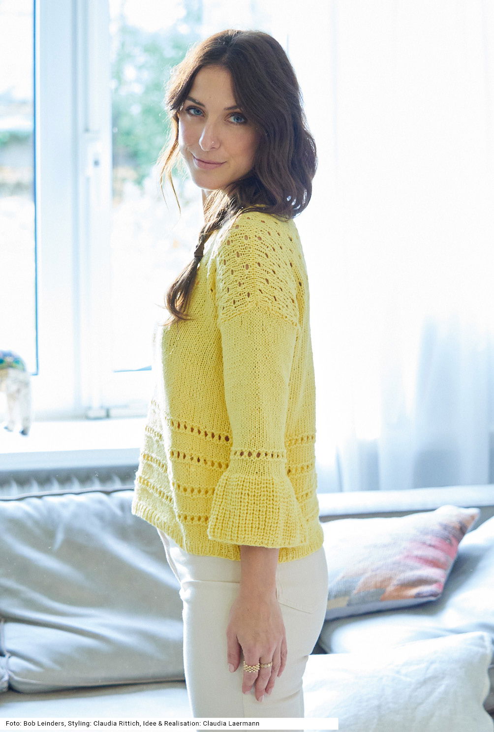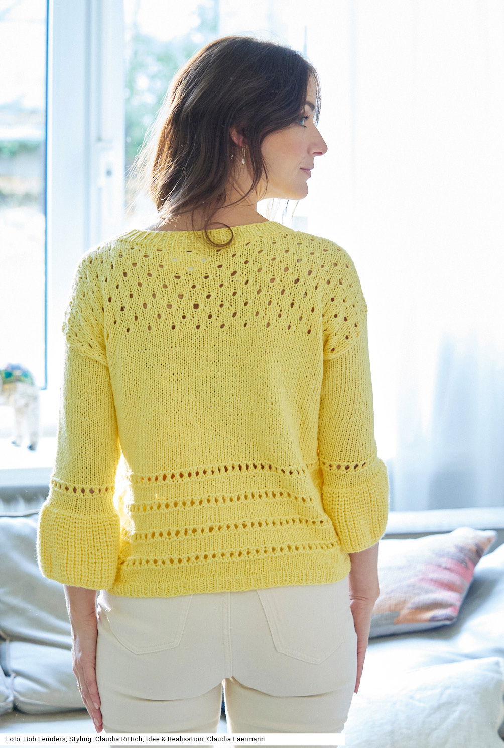 Bei diesem Pullover fallen zuerst die Tulpenärmel auf, die entstehen, weil der untere Teil der Ärmel im Halbpatent und danach glatt rechts, unterbrochen von einem schmalen Streifen im Lochmuster, gestrickt wird. Das sind jedoch noch nicht alle Muster, denn im oberen Bereich von Vorder- und Rückenteil kommt ein Ajourmuster mit kleinen Löchern zum Einsatz. Alle Bündchen und die Halsausschnittblende werden im 1/1-Rippenmuster gearbeitet. Für dieses sommerliche Modell in hellem Gelb haben wir ein Garn aus reiner Baumwolle gewählt. Die Anleitung gibt es für die Größen 36/38, 40/42 und 44/46.