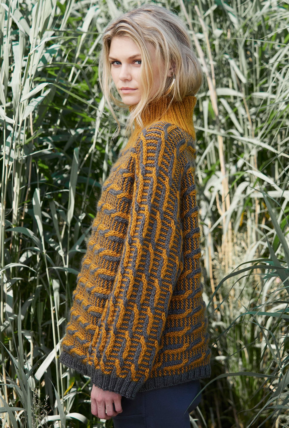 Bei diesem zweifarbigen Pulli legen sich die Hebemaschen-Strukturen quer, da von Ärmel zu Ärmel gestrickt wird. Das geht ganz einfach, man sollte aber wegen des hohen Maschen-Aufkommens mit einer langen Rundstricknadel arbeiten. Der schmale Bund in Grau wird nachträglich angestrickt, genau wie auch der ockerfarbene Turtleneck-Kragen, der sich elegant um den Hals legt. Saum- und Ärmel-Bündchen in Grau und auch der Kragen in Ocker werden mit Rippen zwei rechts, zwei links gearbeitet. Eine Anleitung steht für die Größen 38/40 und 44/46 bereit.