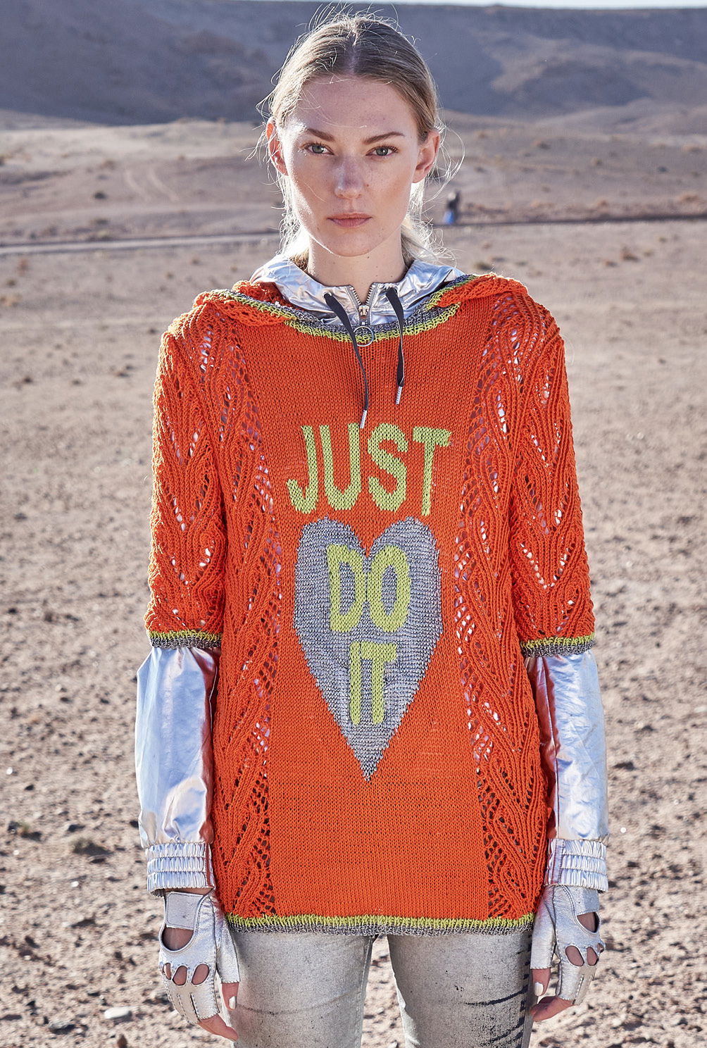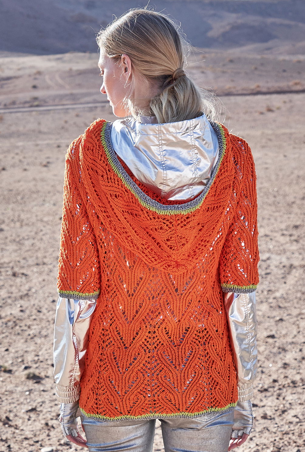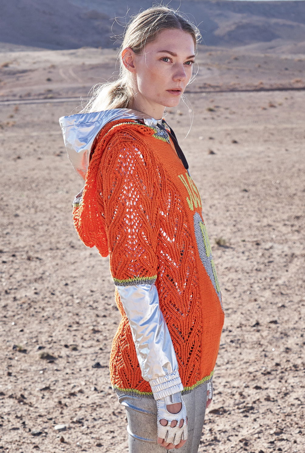 Der aparte Kapuzenpulli begeistert nicht nur durch seine luftigen Ajourstrukturen, sondern auch durch den in Intarsientechnik eingestrickten Schriftzug mit Herzmotiv. So geht sportliche Verspieltheit ganz selbstverständlich Hand in Hand. Zum warm werden beginnt der Strickspaß erst einmal mit dem Rückenteil. Hier wird nach dem Rippenbündchen das Ajourmuster all over gearbeitet. Hier braucht es gerade anfangs etwas Konzentration, denn für den besonderen Effekt des Lochmusters werden links und rechts verschränkte Maschen gestrickt, die im Anschluss überzogen oder auch zusammengestrickt werden. Danach folgt das Vorderteil. Nach dem Bündchen werden die Maschen eingeteilt, so dass außen das Ajourmuster in Streifen hochläuft und einen schönen Rahmen für das mittige Motiv in Intarsientechnik bildet. Die übersichtlichen Strickschriften und farbige Zählmuster sind hierbei eine große Hilfe. Ist auch das Vorderteil geschafft, werden die Ärmel wieder ganz im Lochmuster gestrickt, ebenso die zwei Hälften der Kapuze. Dann werden noch die Blenden angestrickt, alle Nähte geschlossen und die Kapuze unterhalb und hinter der Blende eingenäht. Am besten nimmt der fertige Hoodie jetzt noch ein kleines Bad und wird im Liegen getrocknet. Dabei schön in Form bringen und glattstreichen – so öffnet sich das Lacemuster und entfaltet seine ganze Pracht.