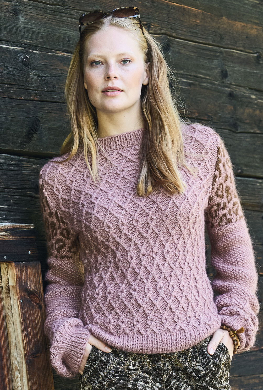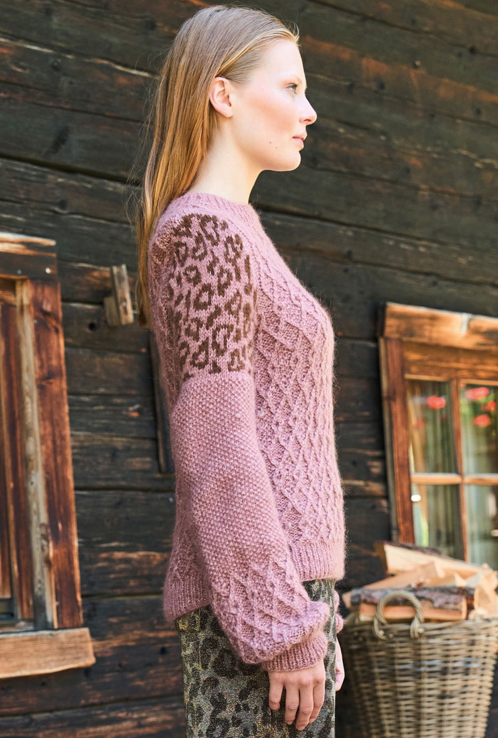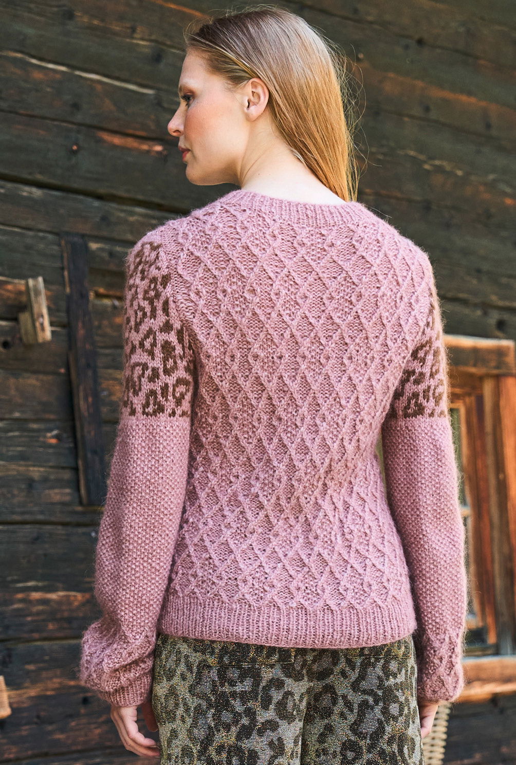 Mit seinen markanten Rautenstrukturen ist dieser Pulli aus weichem Alplaka-Polyamid-Garn an sich schon ein Hingucker. Hinzu kommt noch das im oberen Bereich der Keulenärmel eingesetzte Tierfellmuster, dass du nach einem übersichtlichlichen Zählmuster in Norwegertechnik einstrickst. Das bedeutet, dass du glatt rechts arbeitest und den unbenutzten Faden nicht allzu fest auf der Rückseite der Arbeit entlangführst. Bündchen und Halsausschnittblende im elastischen Rippenmuster bildet das klassische Finish.