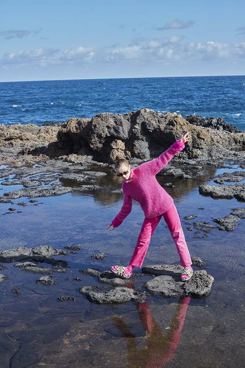 She is a mermaid at heart. So, this sweater looks mer-mazing and is a real eye-catcher. It looks phenomenally fluffy, but the pattern also gives the sweater a cool look. Galina wears soft wrist warmers with it to make it even edgier.