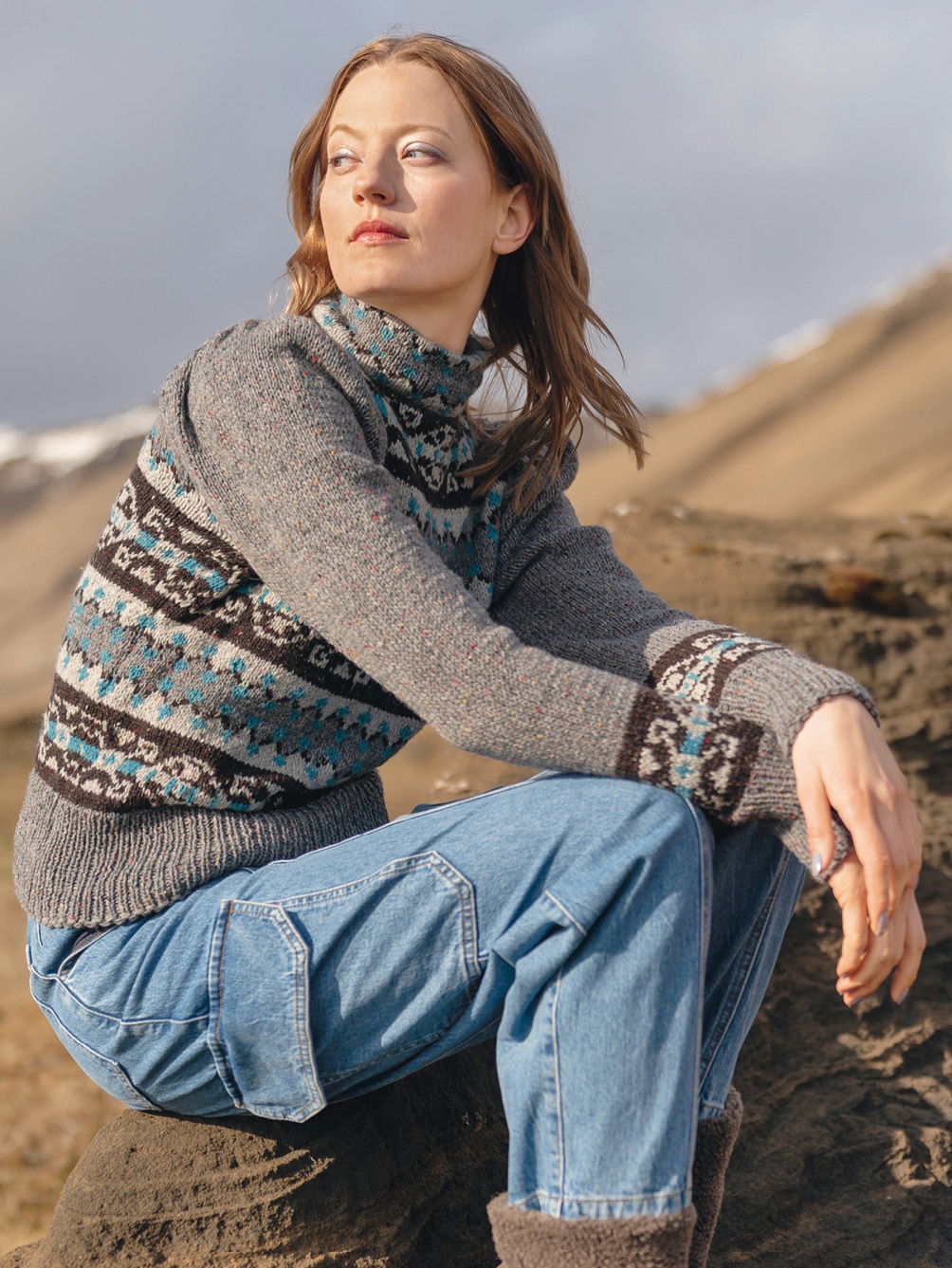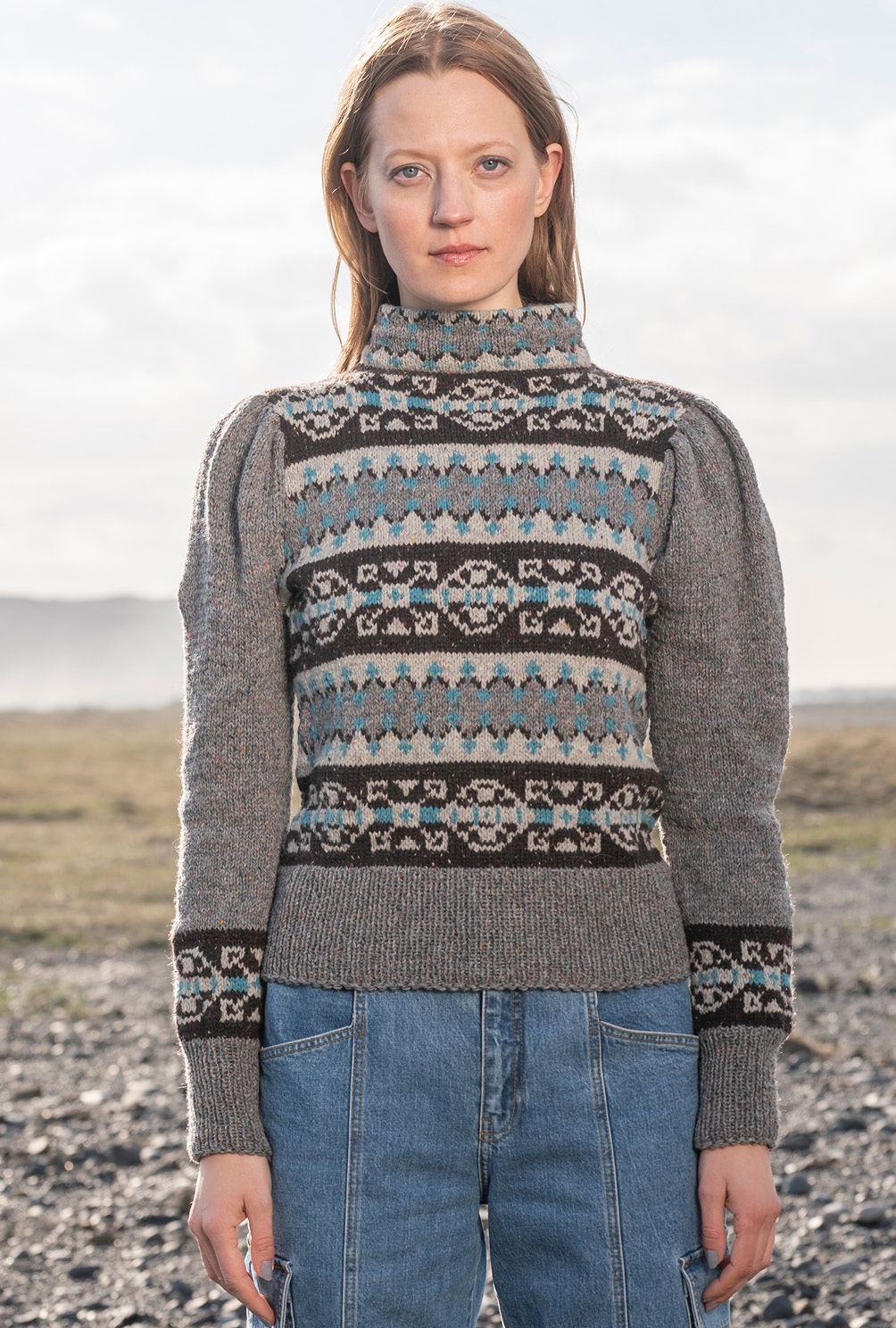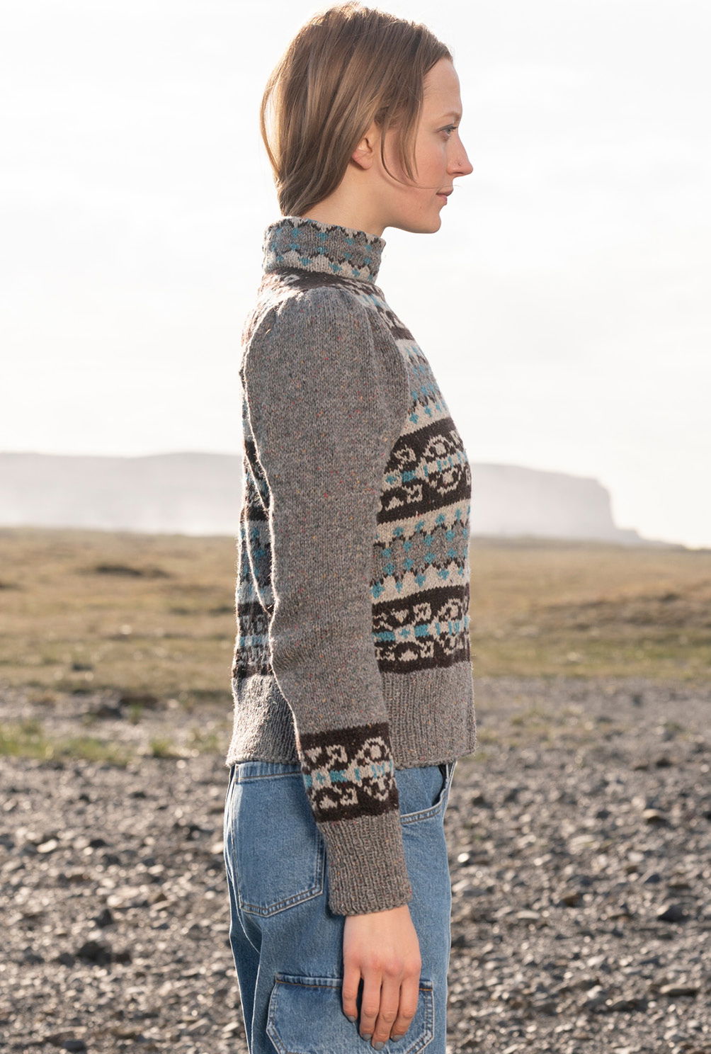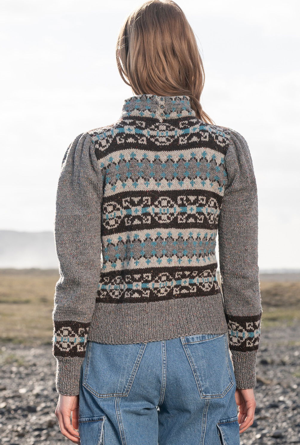 Der schiefergraue Fond dieses Pullis gibt den Farben des Fair-Isle-Musters genügend Raum um sich zu entfalten, das dezente Tweedgarn sorgt hingegen für die «verwaschene» Optik – ein toller Kontrast, der für spannende Akzente sorgt. Zu modischer Hochform laufen die Ärmel auf: Die Kugelränder werden in Falten gelegen und betonen durch diesen Puffärmel-Effekt die Schulterpartie. Der zur Hälfte nach innen umgesäumte Stehkragen ist im rückwärtigen Bereich offen und wird mit kleinen Knöpfe geschlossen.
