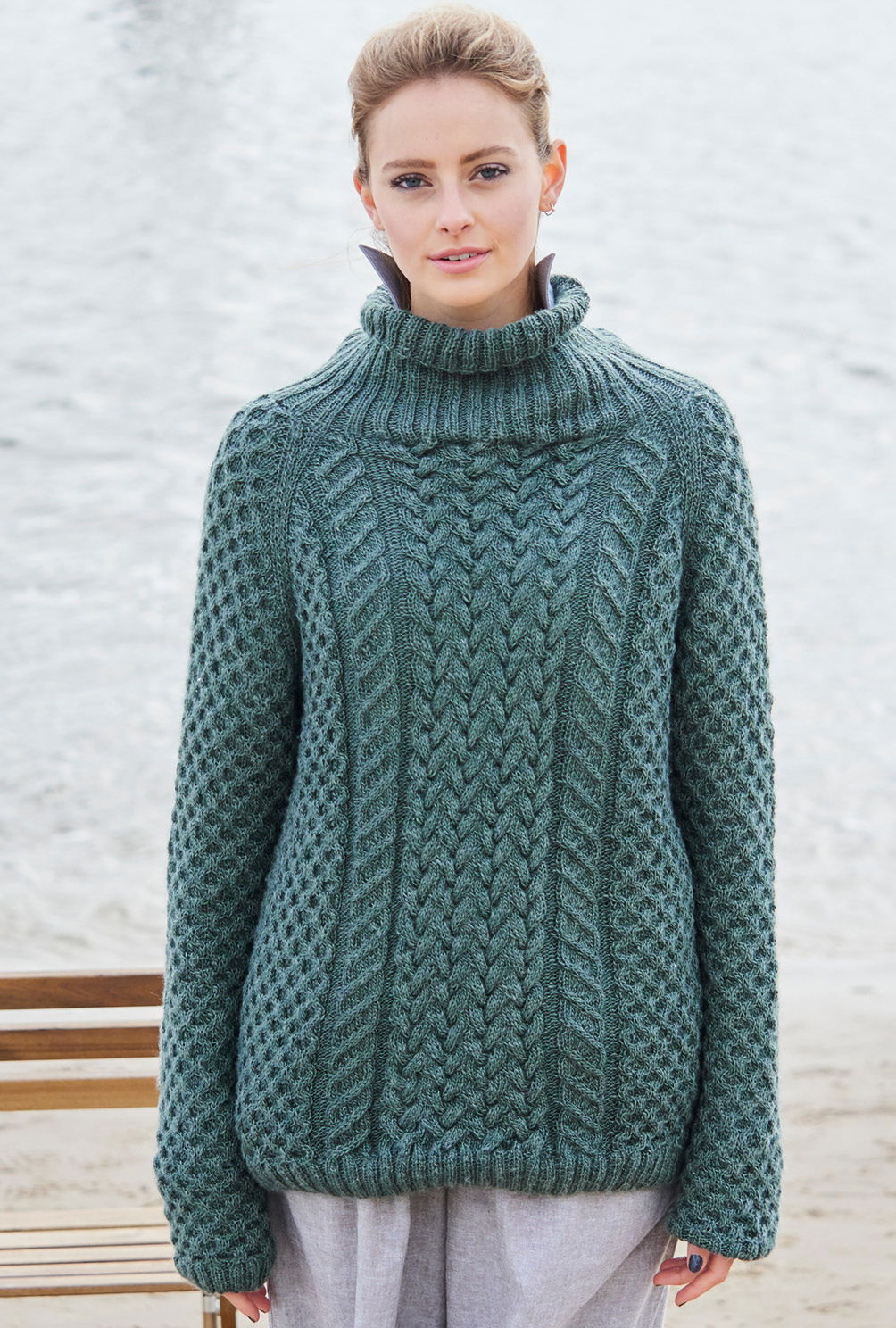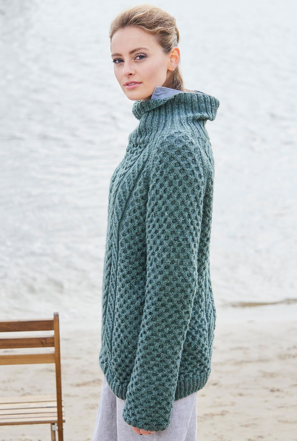 Dieser grüne Raglanpulli mit einer Kombi aus Zopf- und Wabenmuster ist ein wahres Strukturwunder. Mit seinen zahlreichen aufregenden Texturen und Details ist dieser graugrüne Sweater, der mit seinen langen Raglanärmeln und dem hohen Rollkragen ausgestattet ist, eine äußerst empfehlenswerte Wahl für kühle Tage. Dieses Kleidungsstück ist nicht nur kuschelig, sondern auch äußerst warm und gemütlich, und wird sicherlich Ihr treuer Begleiter in der kalten Jahreszeit sein.