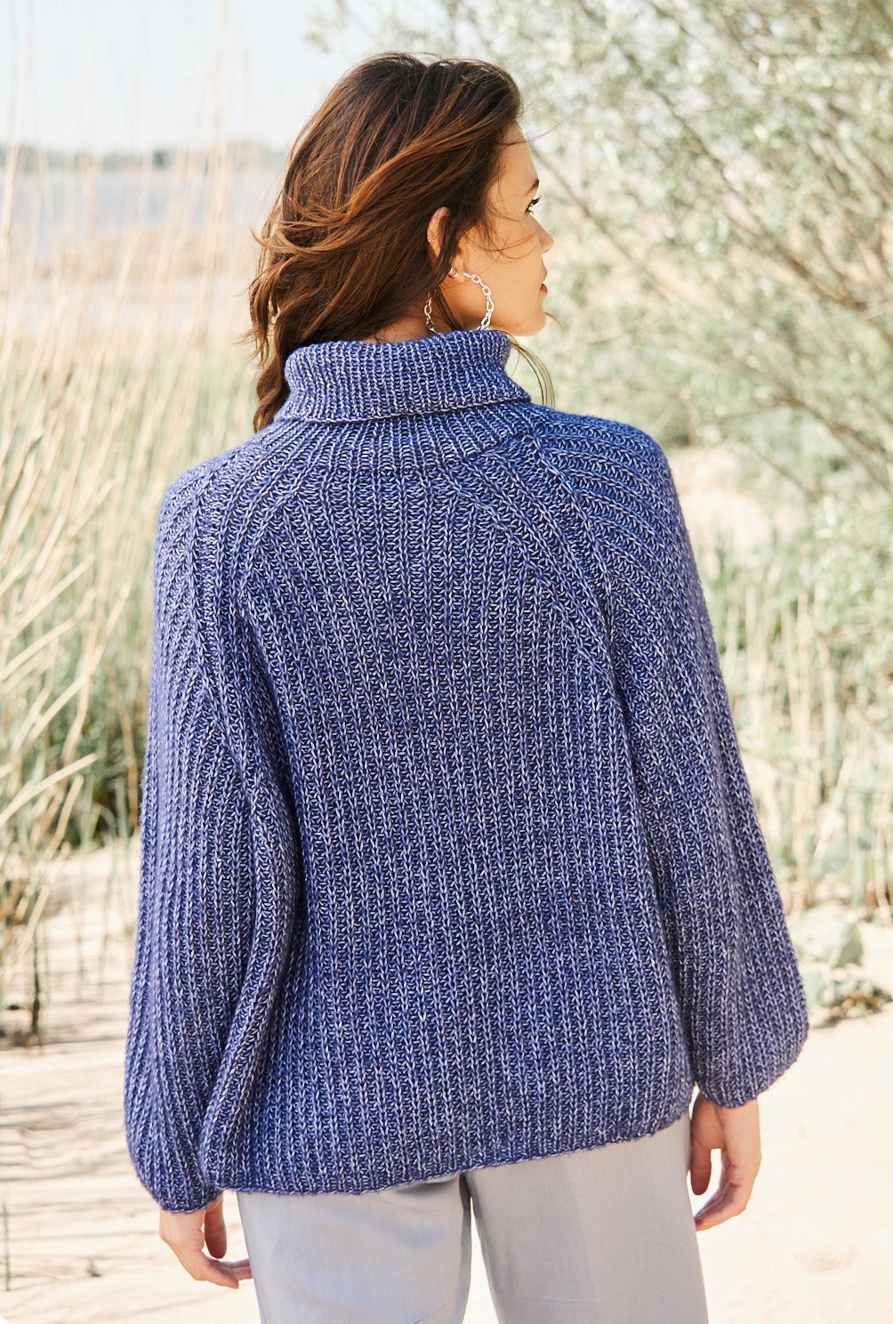 Der weite, jeansfarbene Raglanpulli im Halbpatentmuster ist ein bequemer Alltagsbegleiter für jeden Figurtyp. Im Vorderteil wertet ein Musterverlauf, erzeugt von abgenommenen und zugenommenen Maschen, den Pullover gekonnt auf. Dazu passen die breiten Raglanbetonungen. Ein wahres Strickvergnügen für versierte StrickerInnen, die dennoch ihr Augenmerk auf die große Strickschrift richten müssen, um die Maschen an der richtigen Stelle zu versetzen. Das Baumwolle-Schurwolle-Mischgarn ist prädestiniert, diese Modells zu einem Ganzjahrespulli zu machen. Die Anleitung dazu gibt es für die Größen 36/38, 40/42 und 44/46.