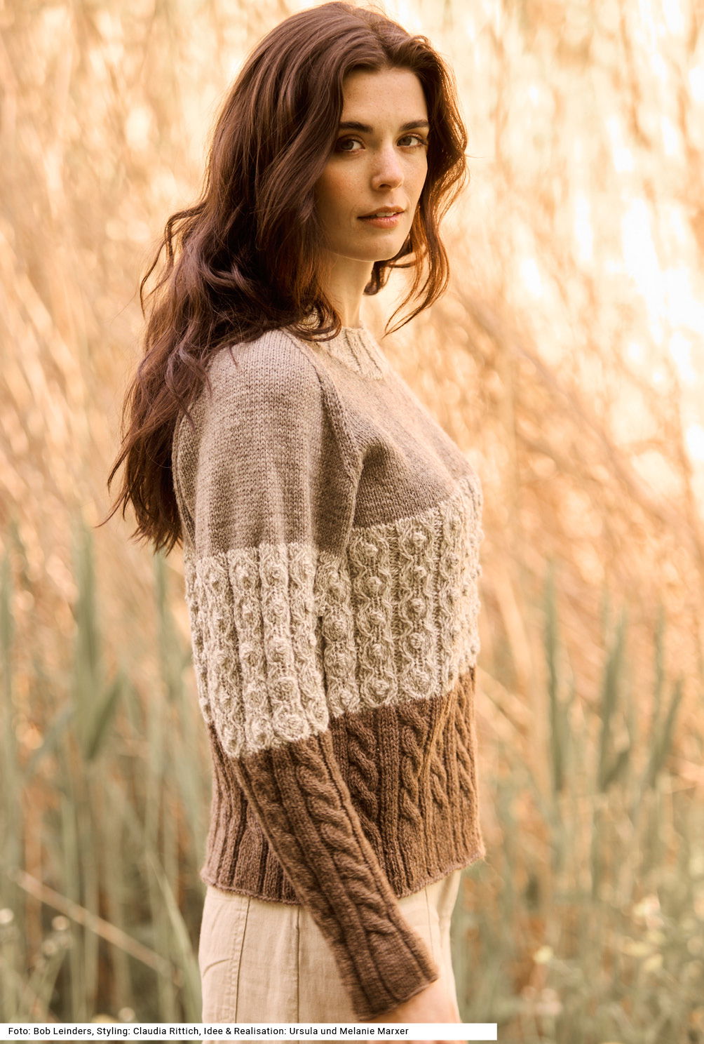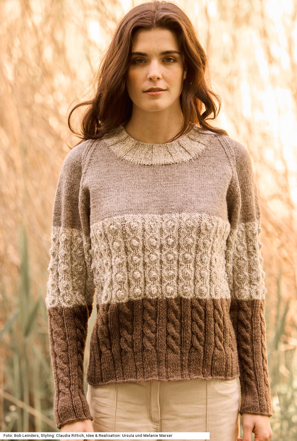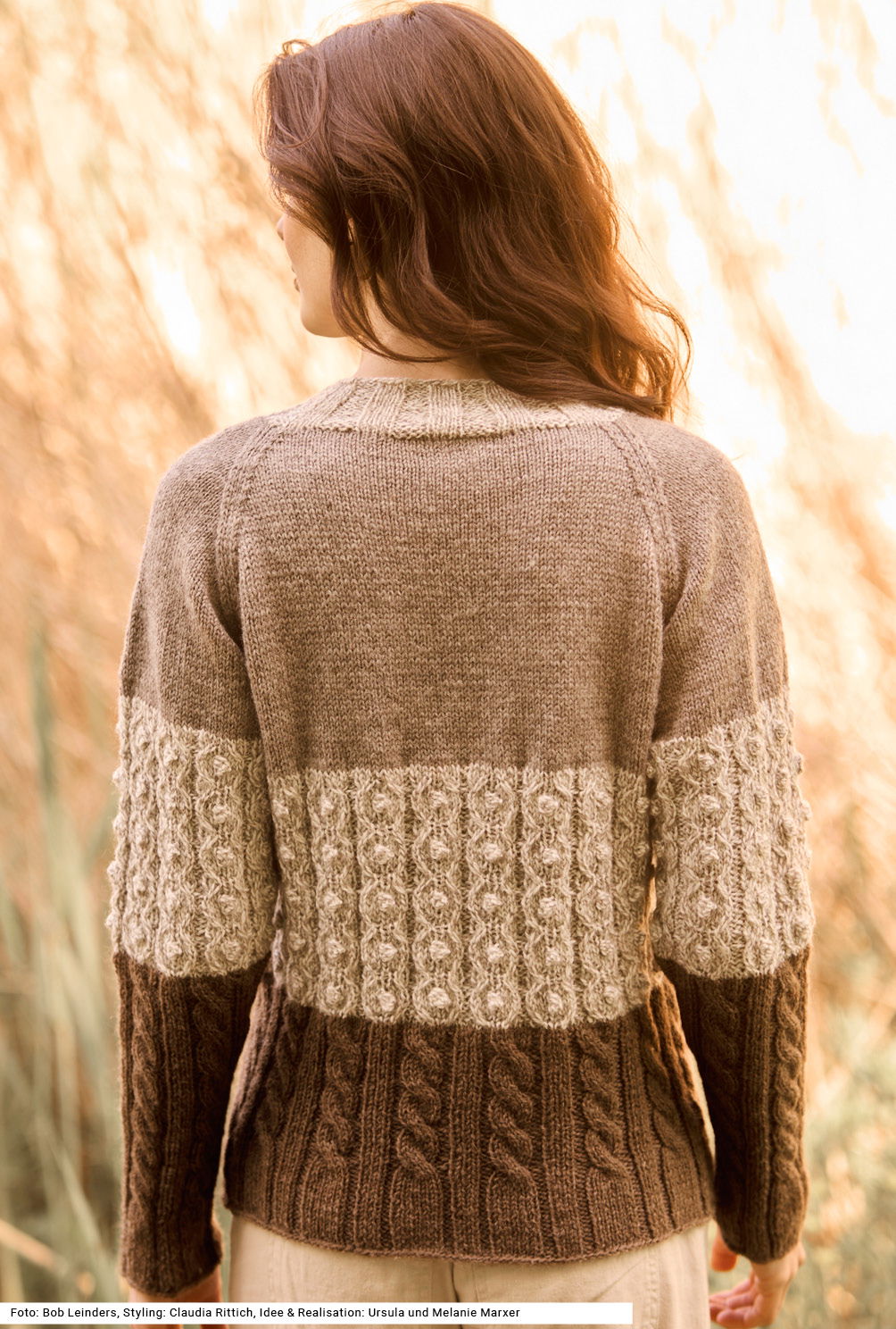 Ob mit zurückhaltenden Naturfarben oder in kräftigen Farbtönen, die breiten Musterstreifen dieses Raglanpullis begeistern mit verschiedenen Zopf- und Noppenmustern, die den rustikalen Charakter des robusten, aber dennoch angenehm weichen Garns aus reiner Schurwolle unterstreichen. Die breiten Rippen des Bunds gehen fließend über in ein Zopf-Rippenmuster in neuer Farbe, gefolgt von einem Zopf-Noppenmuster in wieder anderer Farbe und schließlich wird die Musterfolge mit glatt rechts in noch einer weiteren Farbe beendet. Betonte Abnahmen kennzeichnen die Raglanschrägungen. Eine Anleitung gibts für die Größen 38/40, 42/44 und 46/48.
