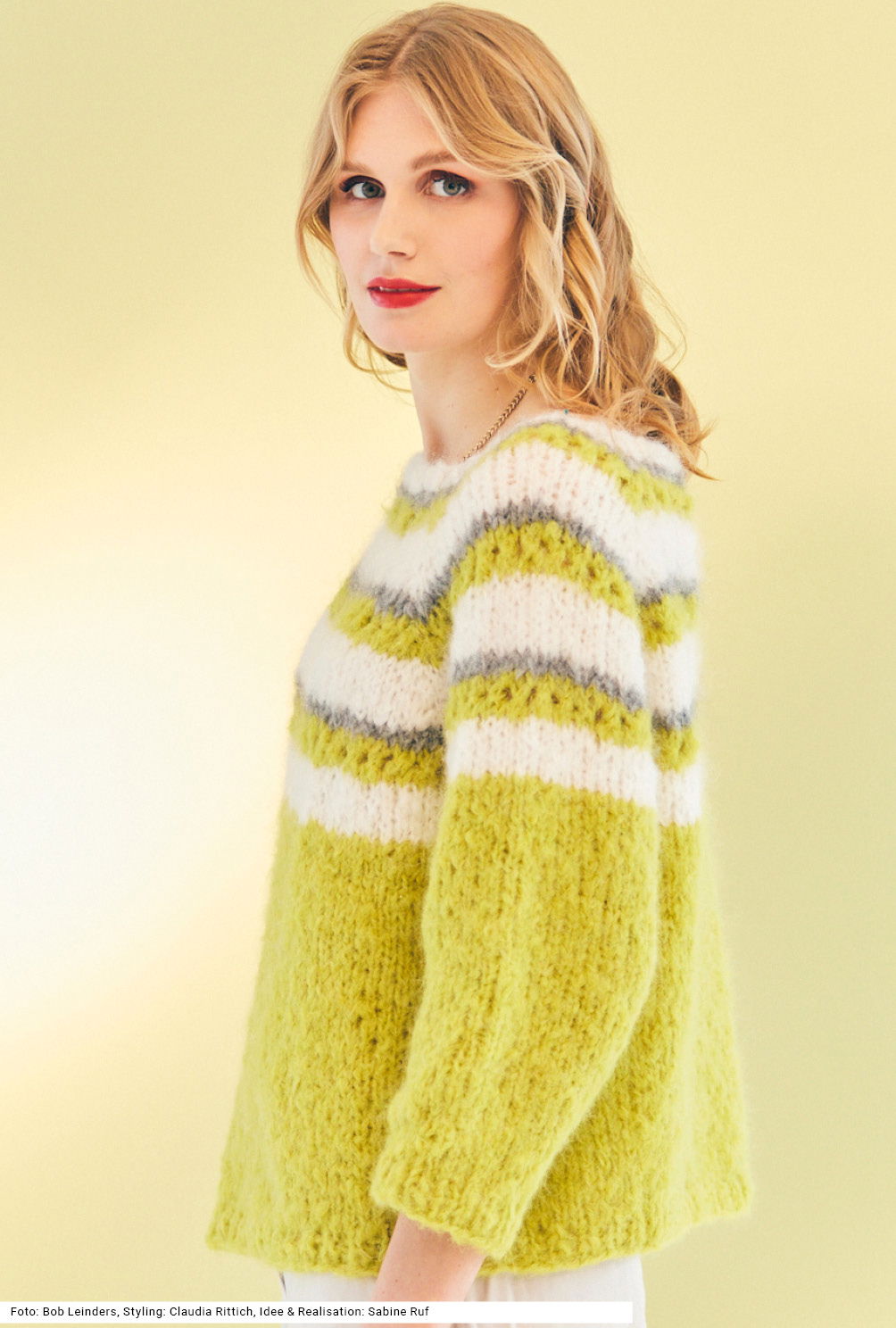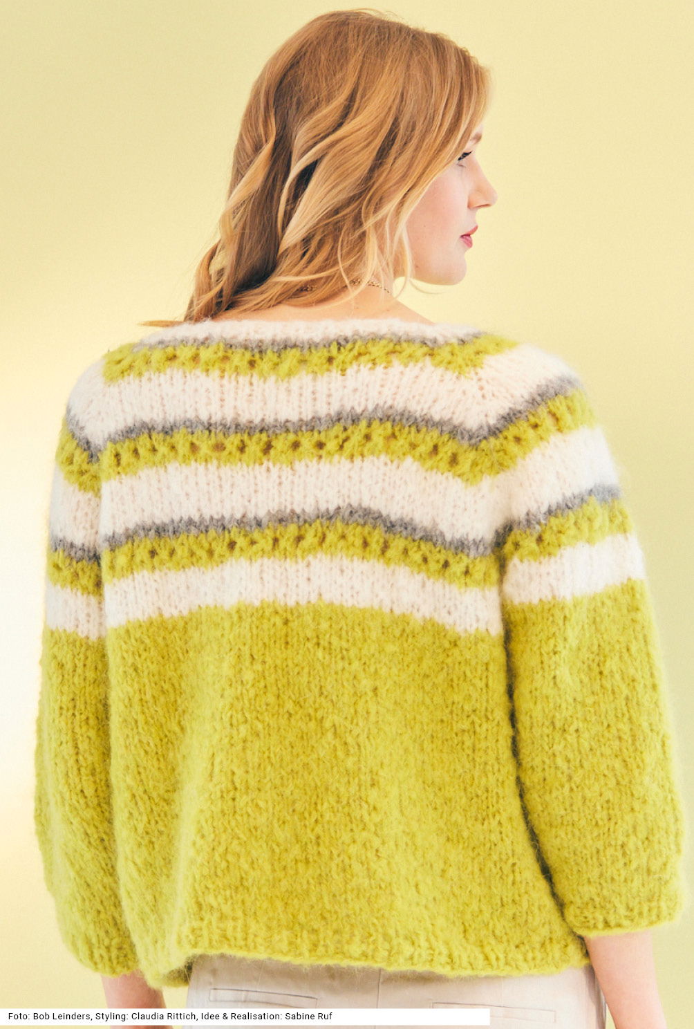 Dieser herrlich flauschige Pulli, der mit dicken Nadeln gestrickt wird, ist trotz Raglanschrägung vergleichsweise einfach zu stricken. Er wird in einem Stück von oben nach unten gearbeitet, ist also ein sogenannter RVO. Highlight des bequem geschnittenen Modells: das leuchtende Gelb, das einen frischen Kontrast zu den weißen und grauen Streifen bildet. Gestrickt wird hauptsächlich glatt rechts, bis auf ein paar schmale gelbe Streifen im Lochmuster und die Bündchen sowie Ausschnittblende im 1/1-Rippenmuster. Der Flausch kommt übrigens durch die Zusammensetzung des Garns zustande: Polyacryl, Polyamid, Mohair und Schurwolle. Die Anleitung dazu gibt es in den Größen 38/40, 42/44 und 46/48.