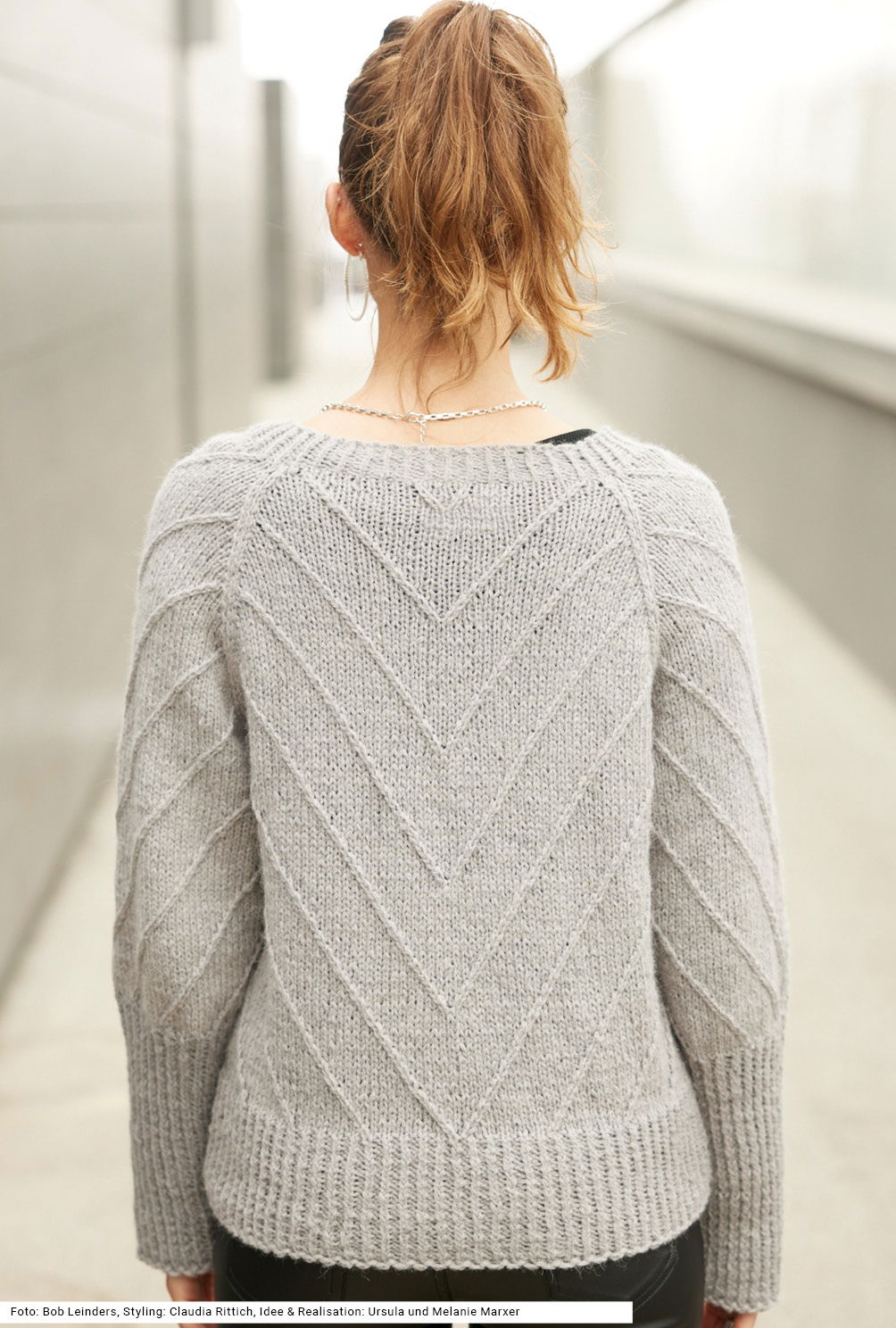 Dieser Pulli mit v-förmiger Mustereinteilung und betonten Raglanschrägungen streckt die Figur optisch. Die diagonalen Schrägungen entstehen durch zwei miteinander verzopfte rechte Maschen. Das Modell wird aus einem luftig-leichten Alpaka-Polyamid-Mischgarn in Grau gearbeitet, das sehr weit läuft und dadurch. Ein bis zu den Armausschnitten gerader Schnitt und die modisch hohen Ärmelbündchen im Rippenmuster, dazu ein weiter runder Halsausschnitt machen den modernen Style komplett. Das Rippenmuster wird 1 Masche rechts verschränkt, 1 Masche links gestrickt. Eine Anleitung steht für die Größen 36/38, 40/42 und 44/46 bereit.